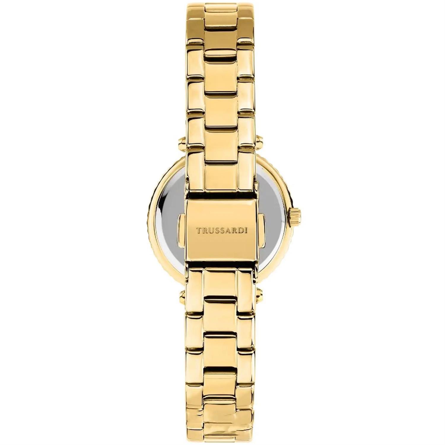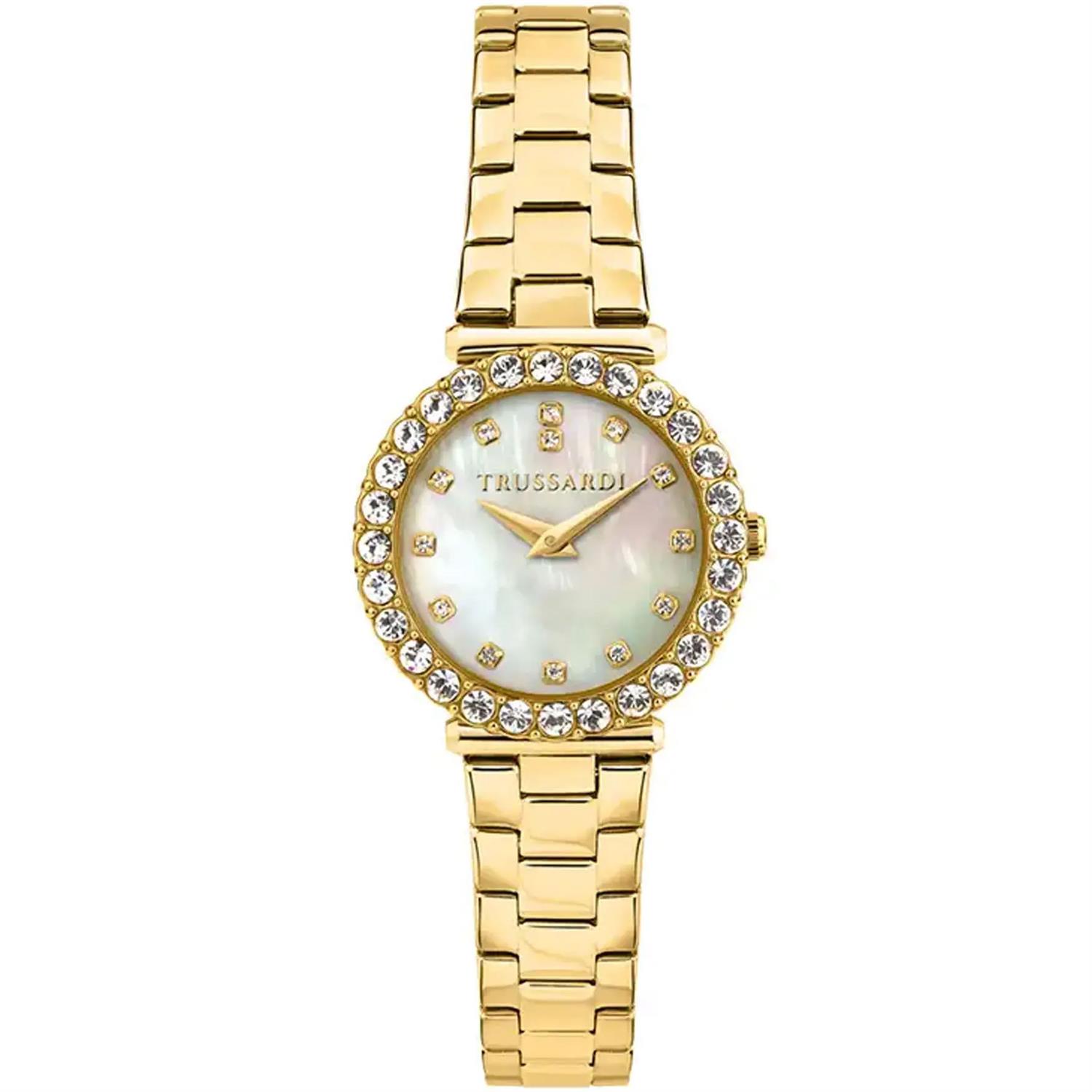 ساعت مچی زنانه Trussardi با طراحی کلاسیک بند فلزی طلایی و قاب دور نگین طلایی و صفحه نگین دار سفید صدفی و موتور ژاپنی با انرژی باتری و مقاومت در برابر آب تا عمق 30 متر به همراه گارانتی بین المللی