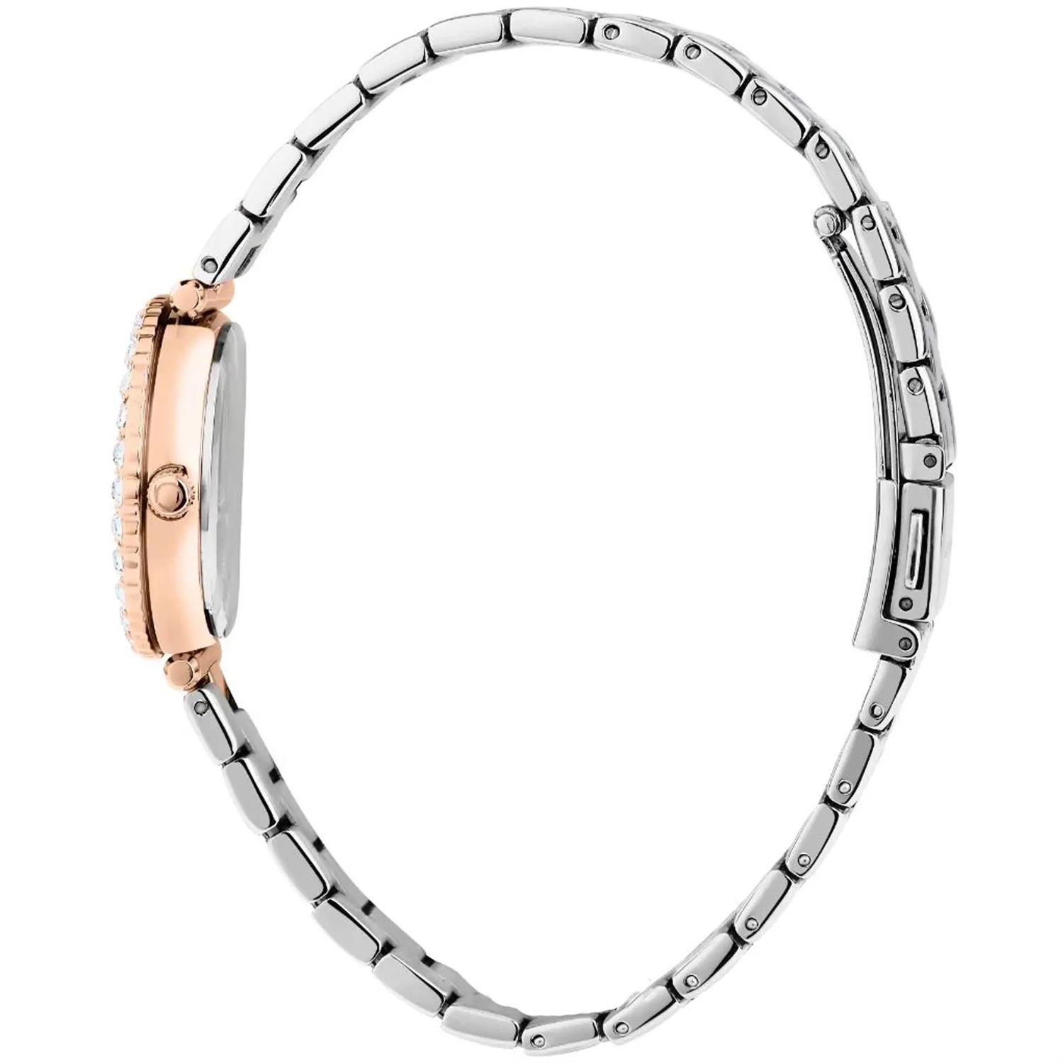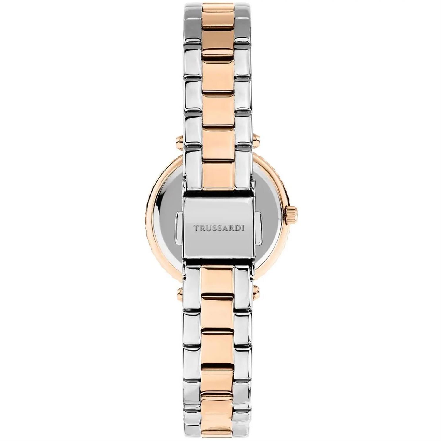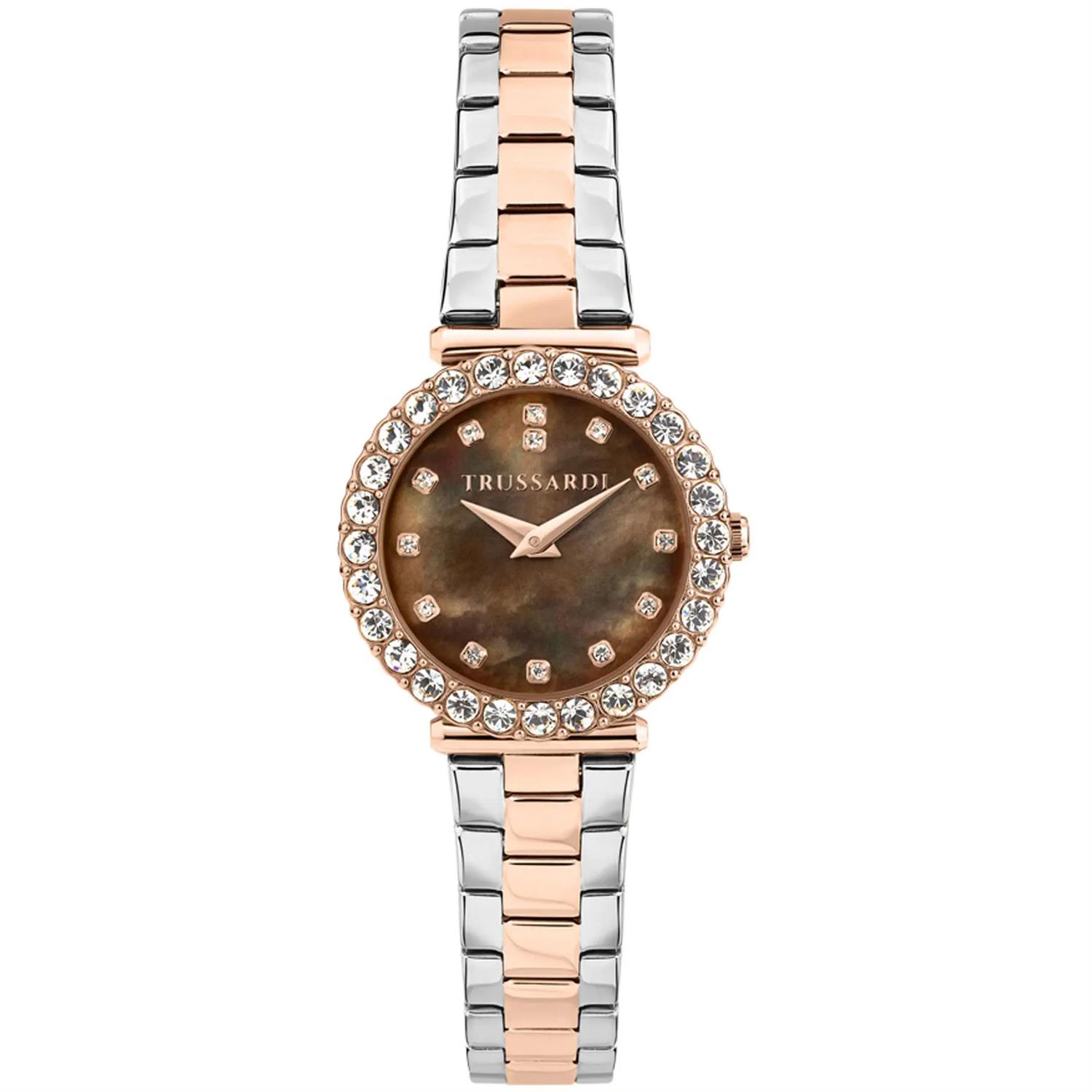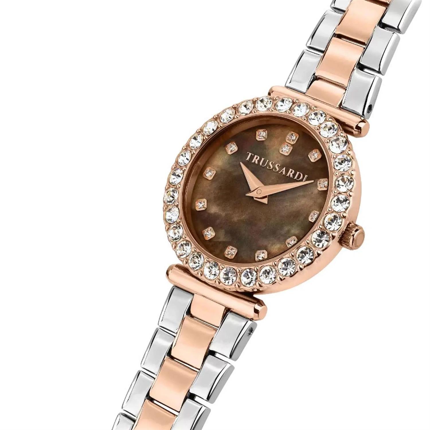 ساعت مچی زنانه Trussardi با طراحی کلاسیک بند استیل مسی و قاب دور نگین مسی و صفحه نگین دار قهوه ای صدفی و موتور ژاپنی با انرژی باتری و مقاومت در برابر آب تا عمق 30 متر به همراه گارانتی بین المللی