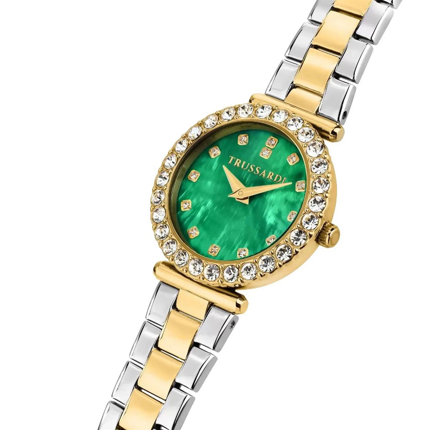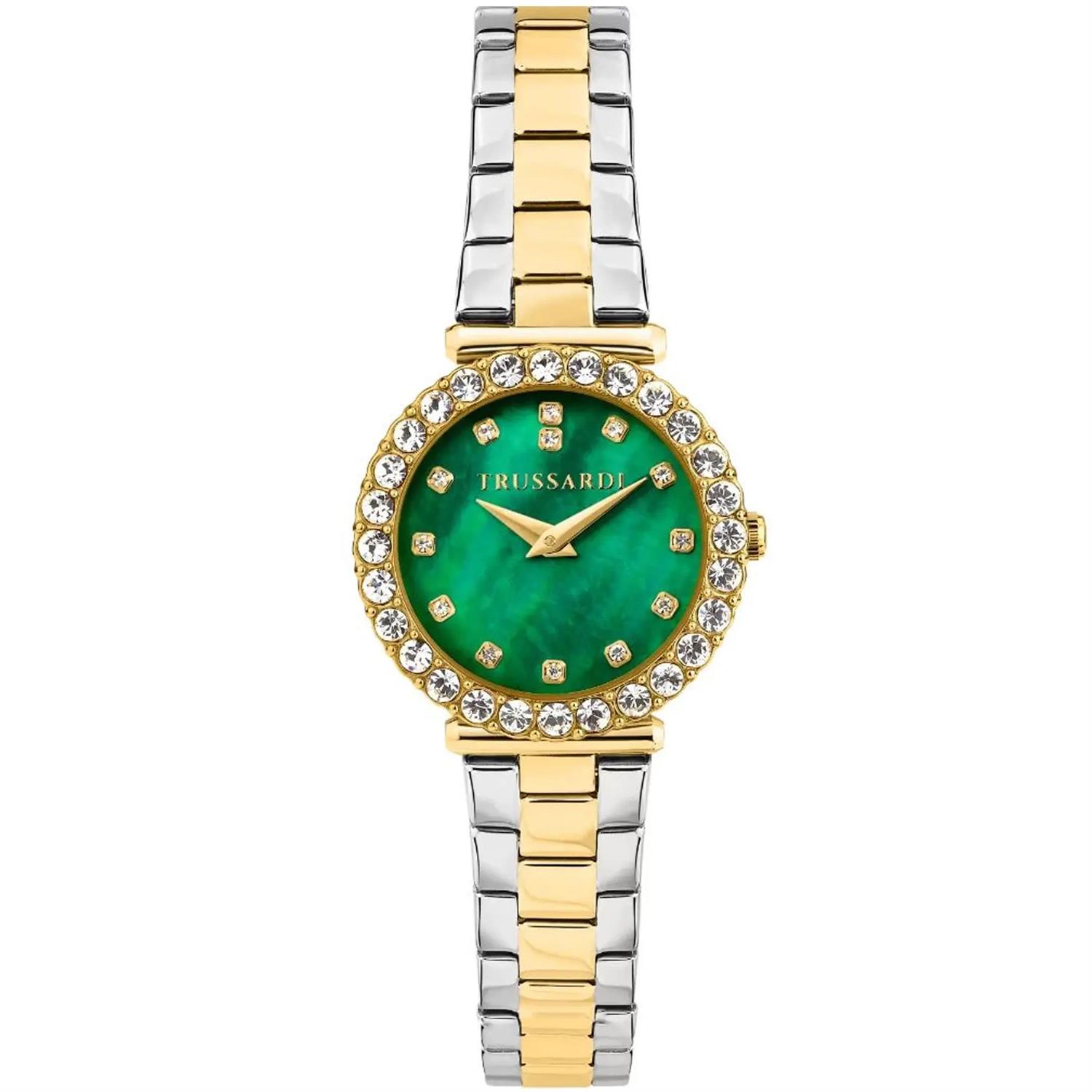 ساعت مچی زنانه Trussardi با طراحی کلاسیک بند استیل طلایی و قاب دور نگین طلایی و صفحه نگین دار سبز صدفی و موتور ژاپنی با انرژی باتری و مقاومت در برابر آب تا عمق 30 متر به همراه گارانتی بین المللی