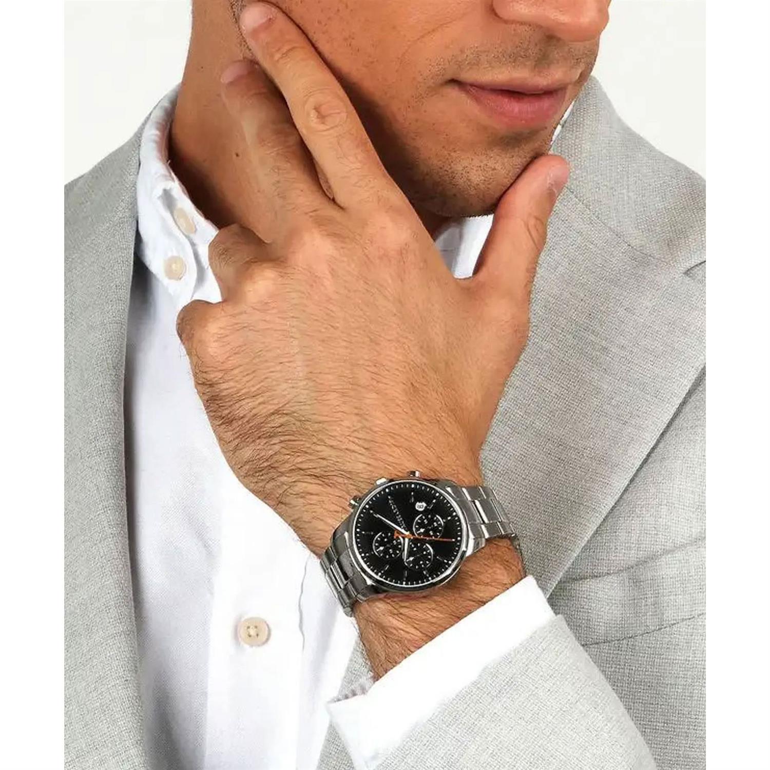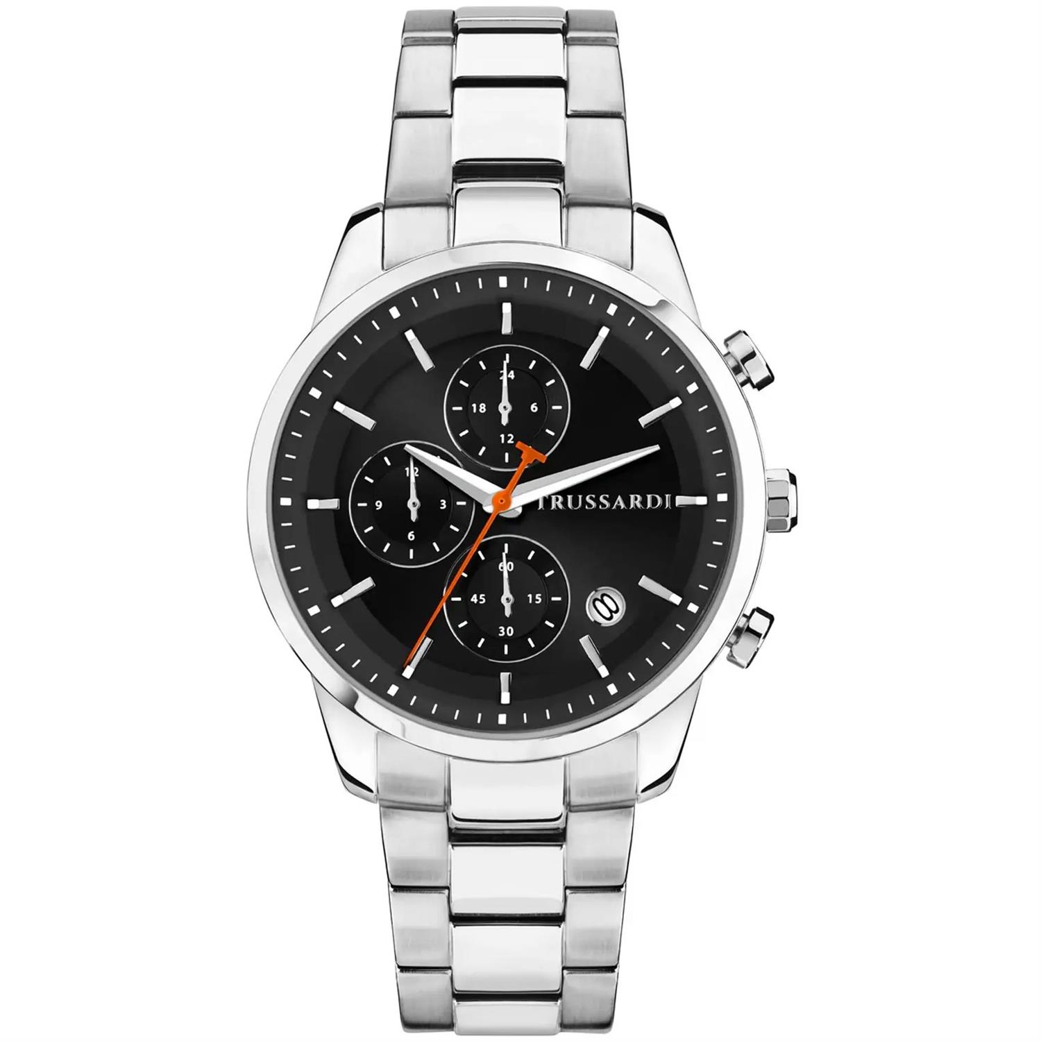 ساعت مچی مردانه Trussardi با طراحی روزانه بند استیل و قاب گرد استیل و صفحه گرد مشکی و قابلیت داشتن تقویم / کرنوگراف و موتور ژاپنی با انرژی باتری و مقاومت در برابر آب تا عمق 50 متر به همراه دو سال گارانتی بین المللی