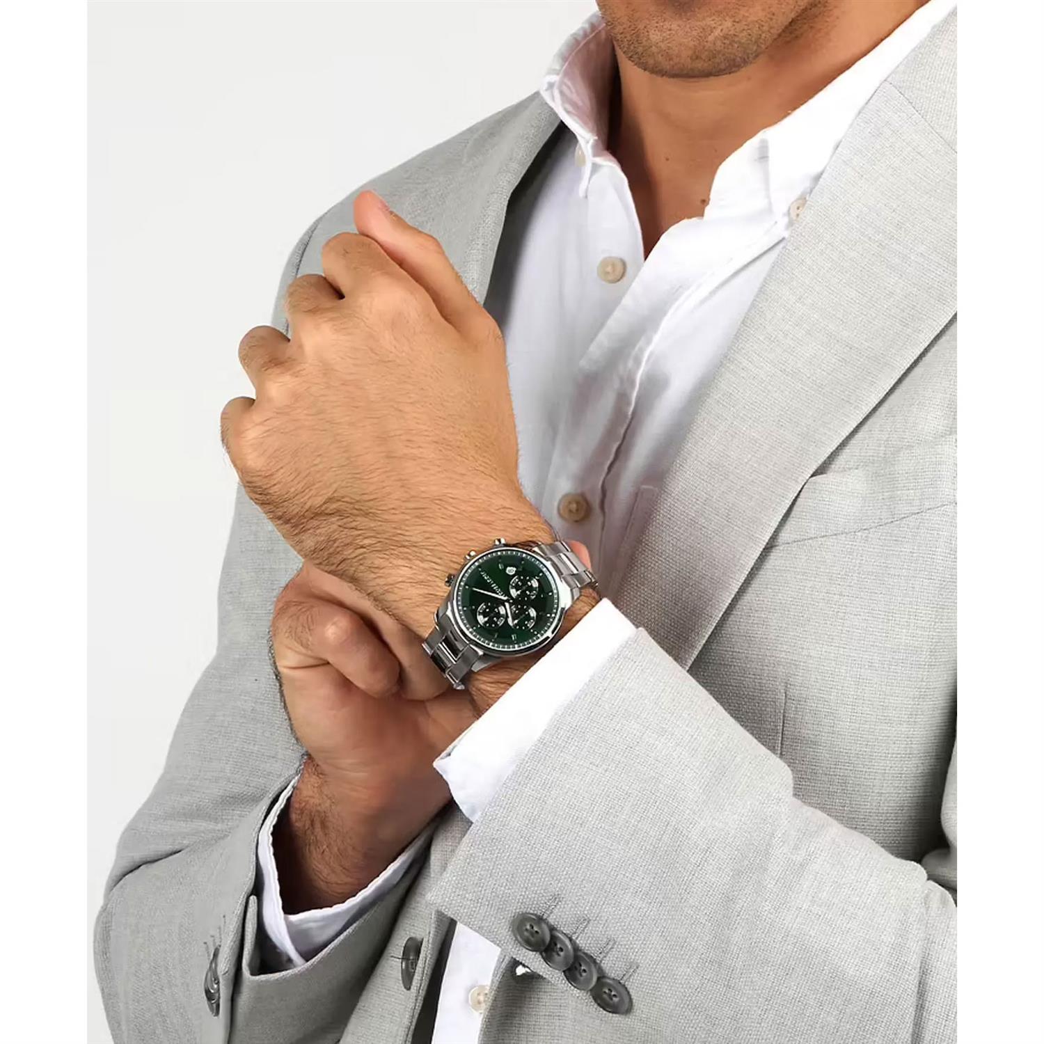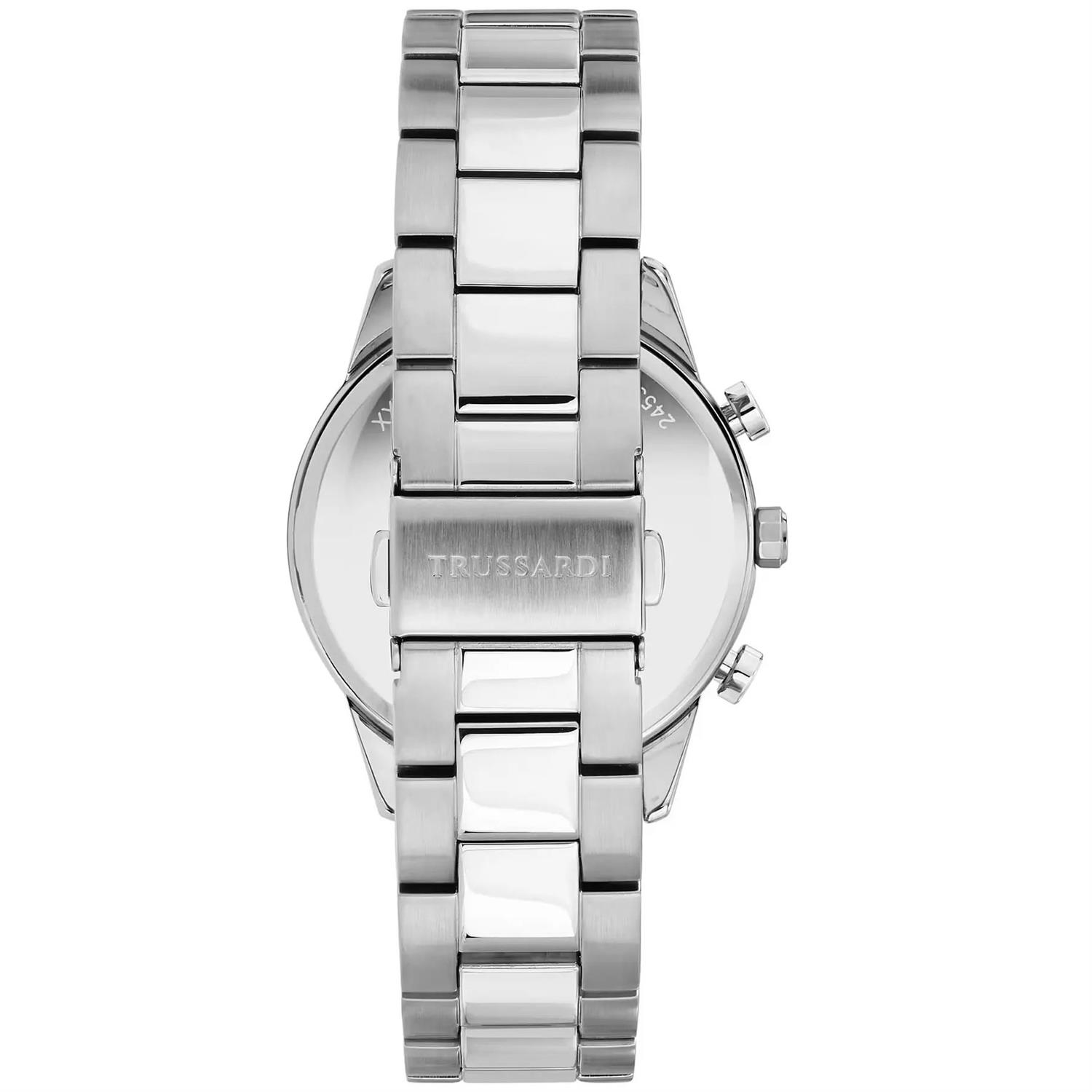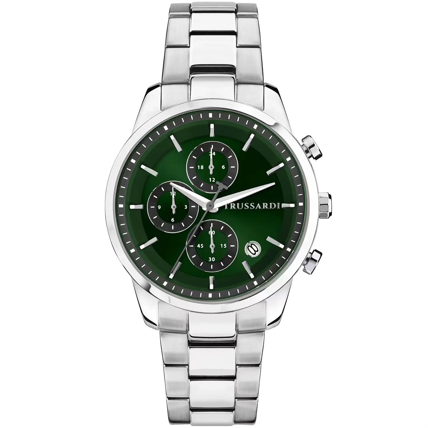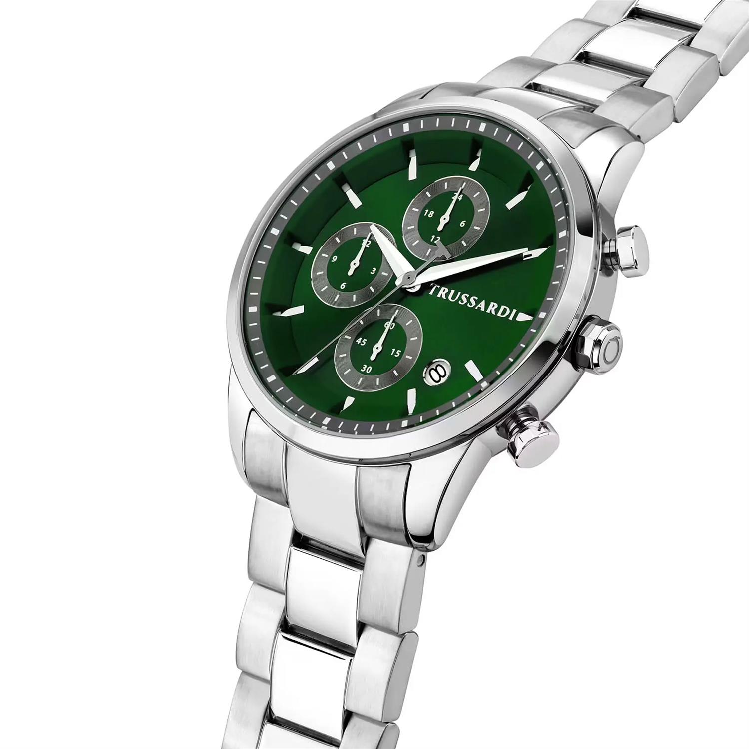 ساعت مچی مردانه Trussardi با طراحی روزانه بند استیل و قاب گرد استیل و صفحه گرد سبز و قابلیت داشتن تقویم / کرنوگراف و موتور ژاپنی با انرژی باتری و مقاومت در برابر آب تا عمق 50 متر به همراه دو سال گارانتی بین المللی
