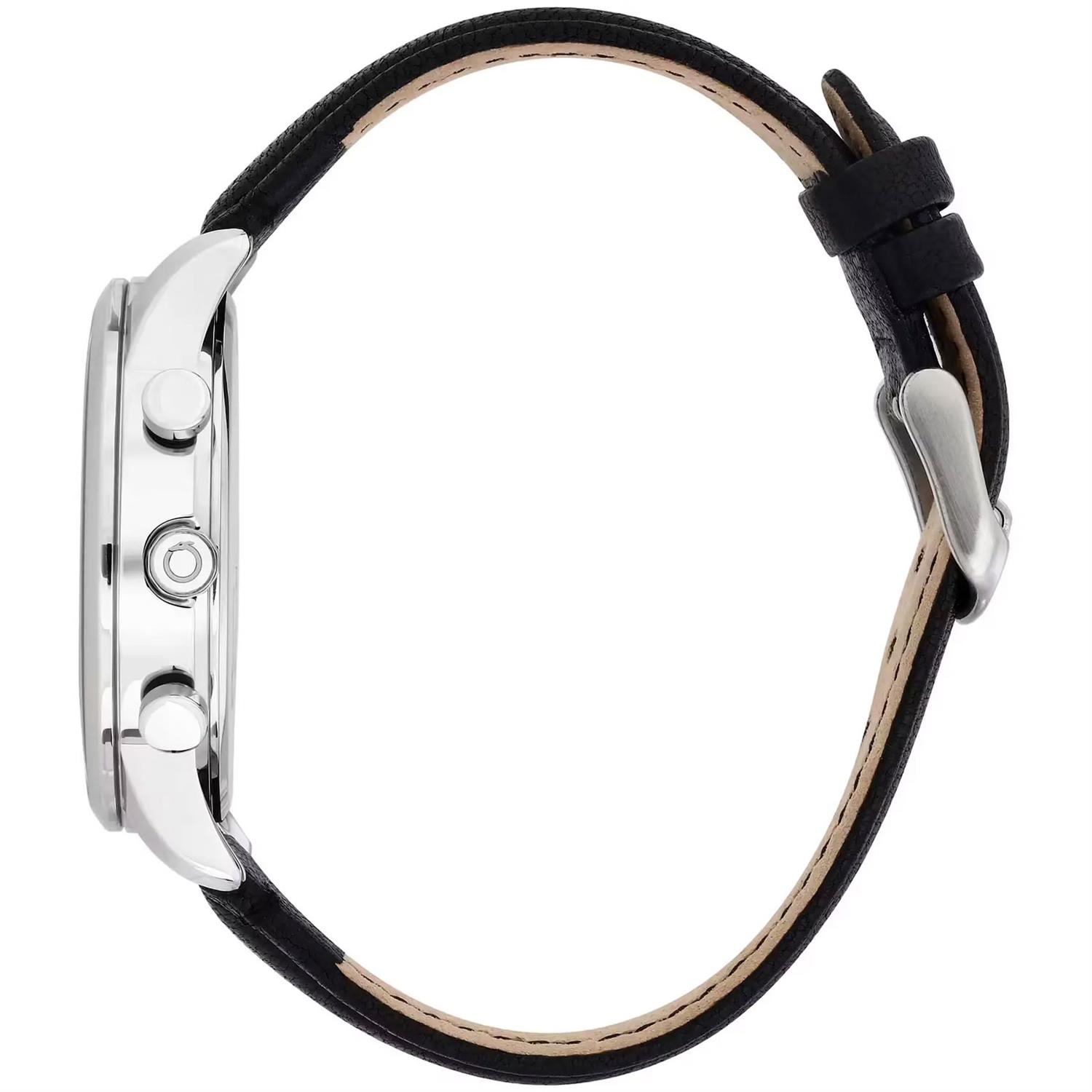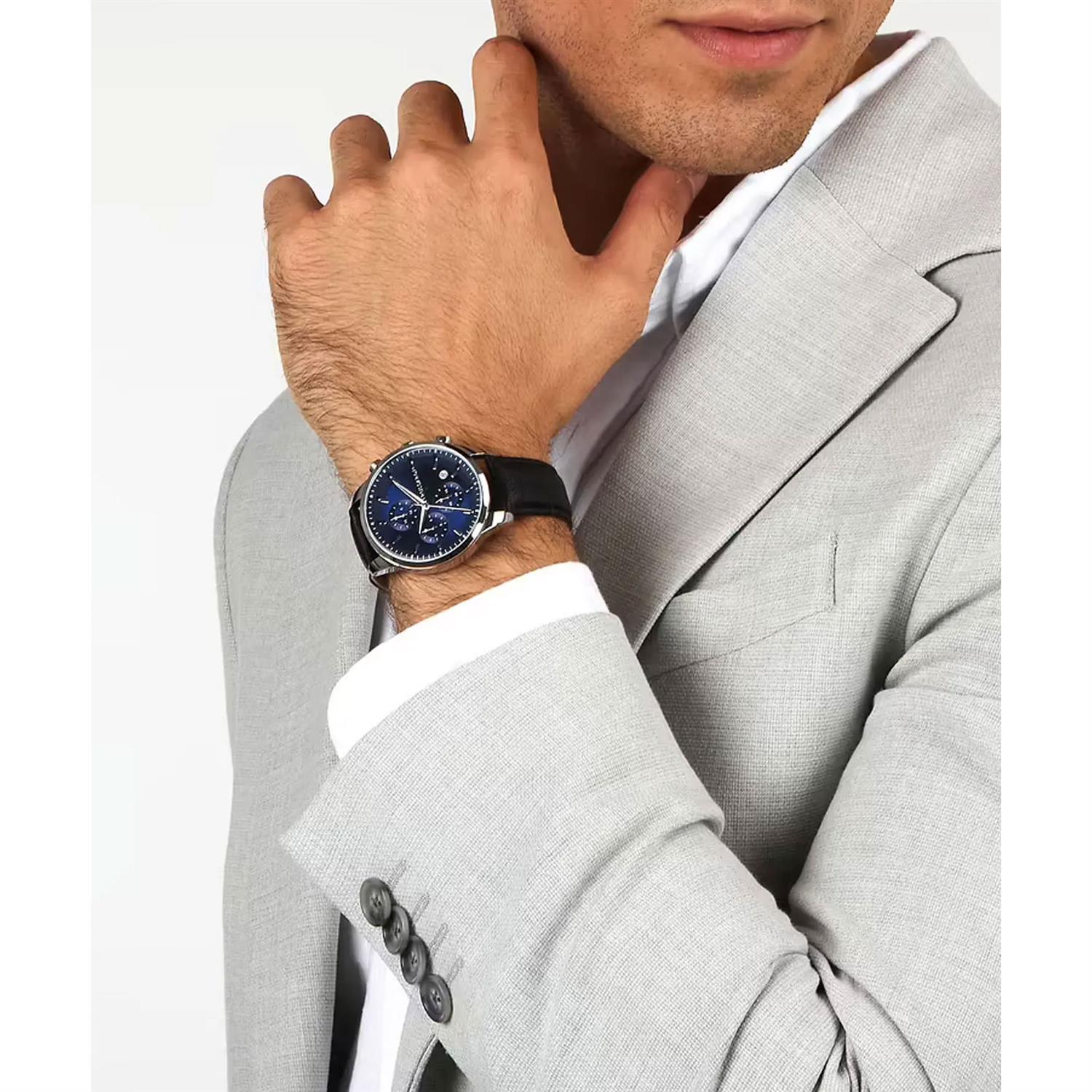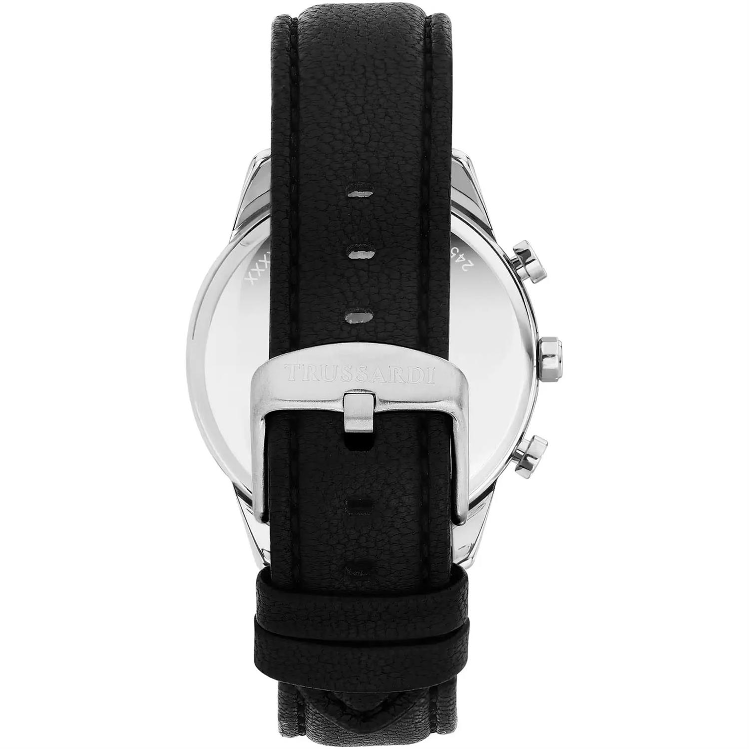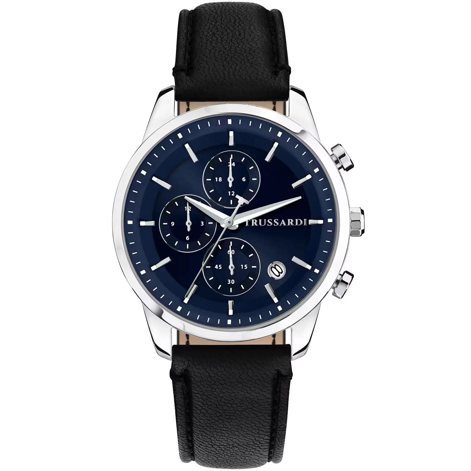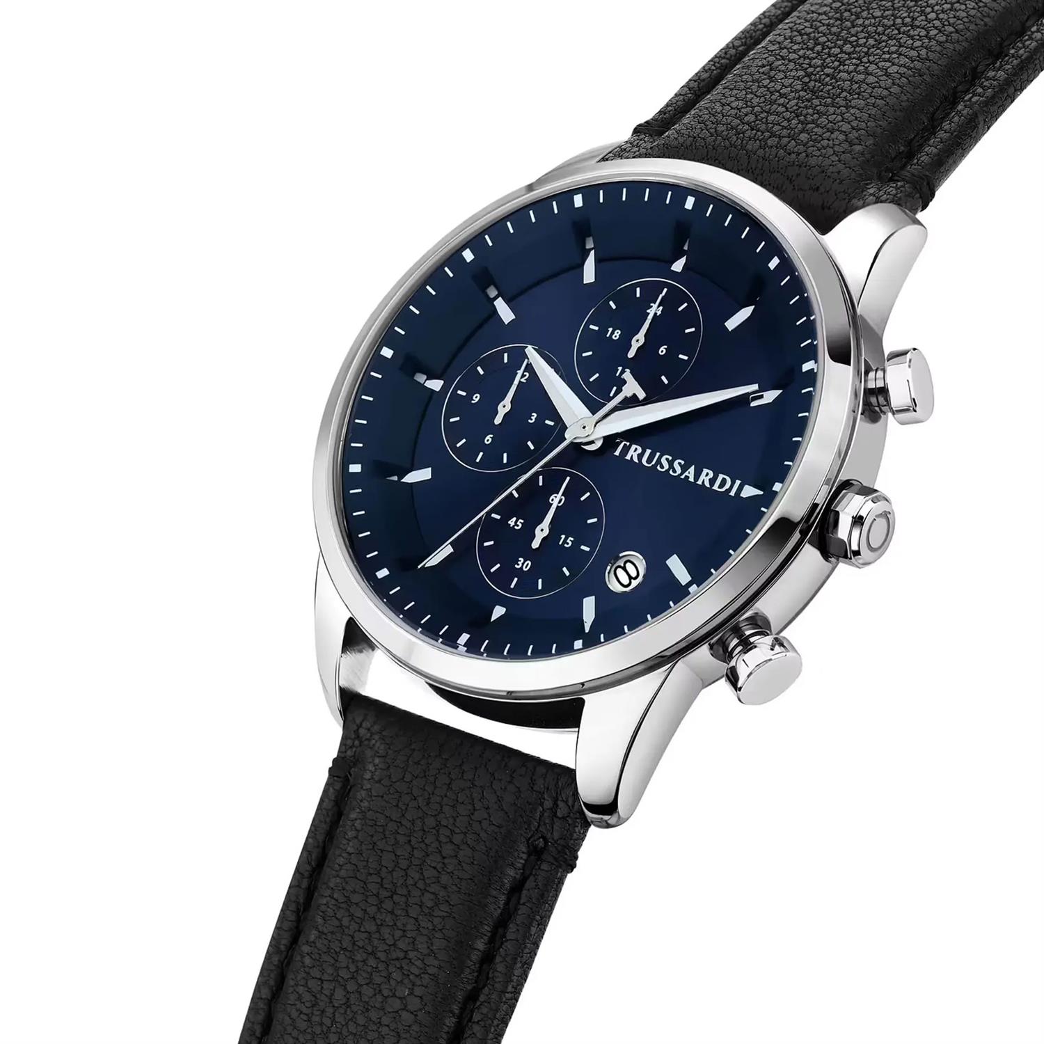 ساعت مچی مردانه Trussardi با طراحی روزانه بند چرمی مشکی و قاب گرد استیل و صفحه گرد سرمه ای و قابلیت داشتن تقویم / کرنوگراف و موتور ژاپنی با انرژی باتری و مقاومت در برابر آب تا عمق 50 متر به همراه دو سال گارانتی بین المللی