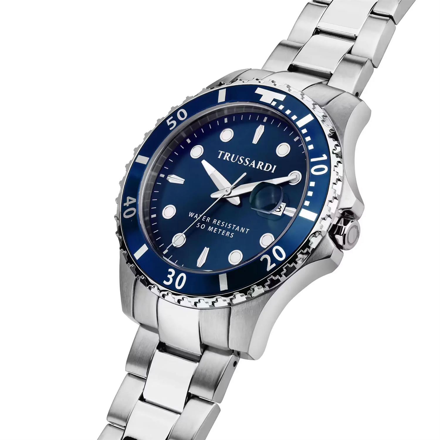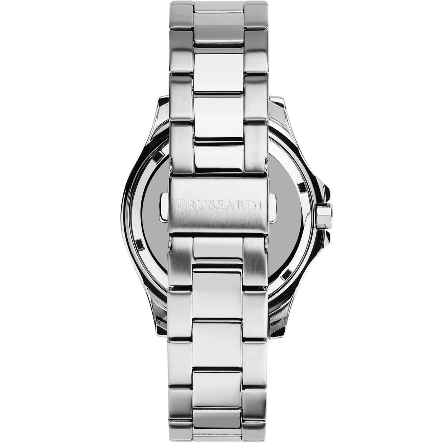 ساعت مچی مردانه Trussardi با طراحی کلاسیک بند استیل و قاب گرد دو رنگ و صفحه گرد سرمه ای با قابلیت داشتن تقویم / شب نما و موتور ژاپنی با انرژی باتری و مقاومت در برابر آب تا عمق 50 متر به همراه دو سال گارانتی بین المللی