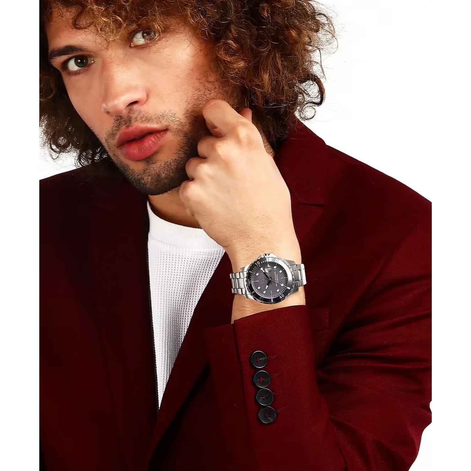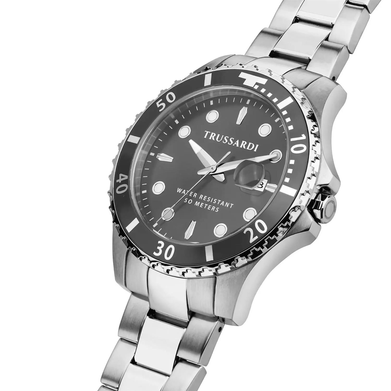 ساعت مچی مردانه Trussardi با طراحی کلاسیک بند استیل و قاب گرد دو رنگ و صفحه گرد طوسی با قابلیت داشتن تقویم / شب نما و موتور ژاپنی با انرژی باتری و مقاومت در برابر آب تا عمق 50 متر به همراه دو سال گارانتی بین المللی