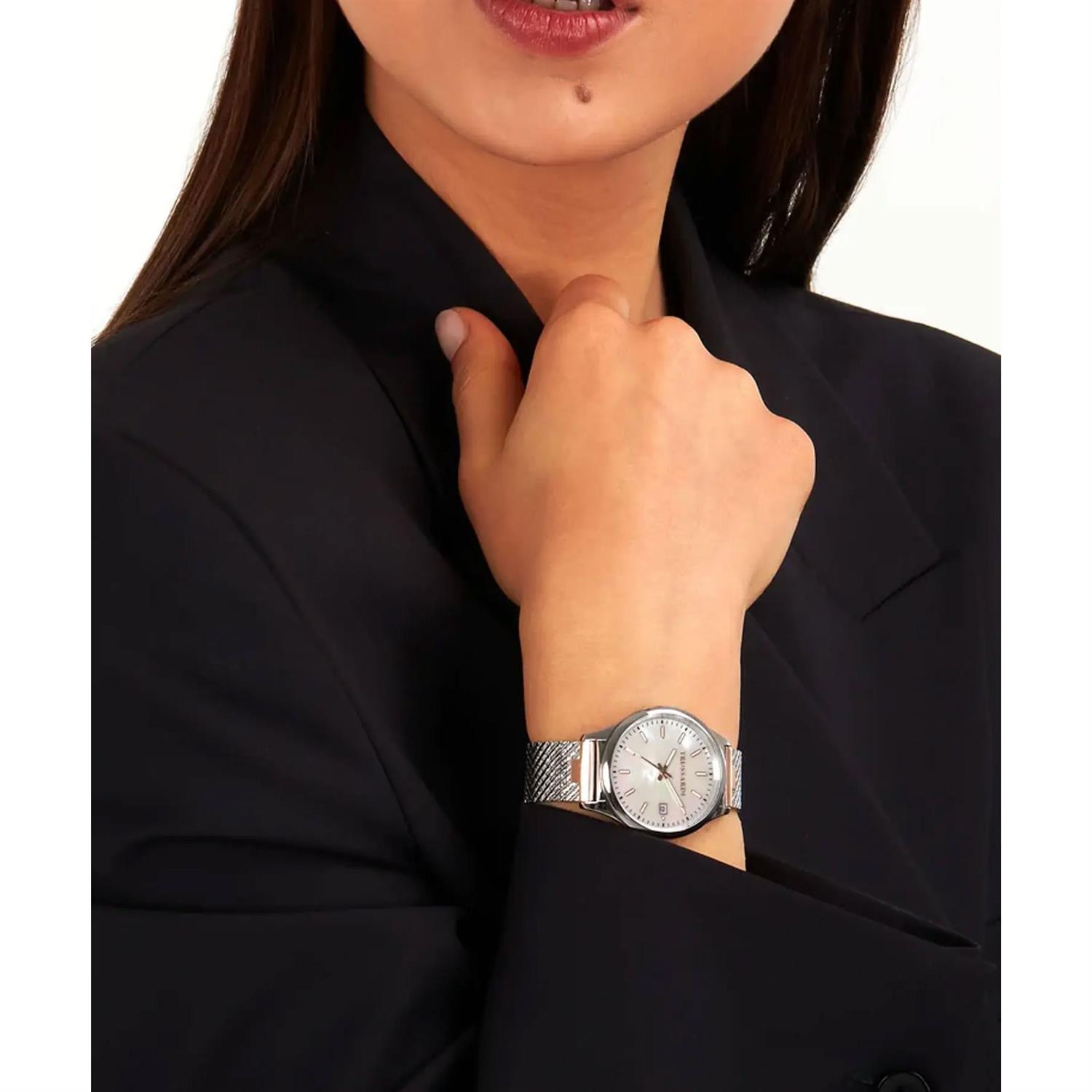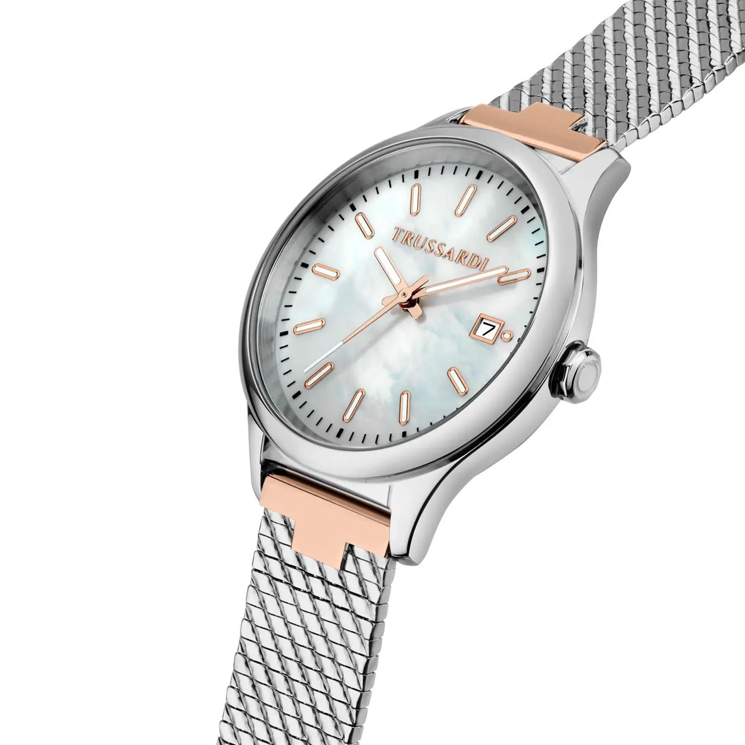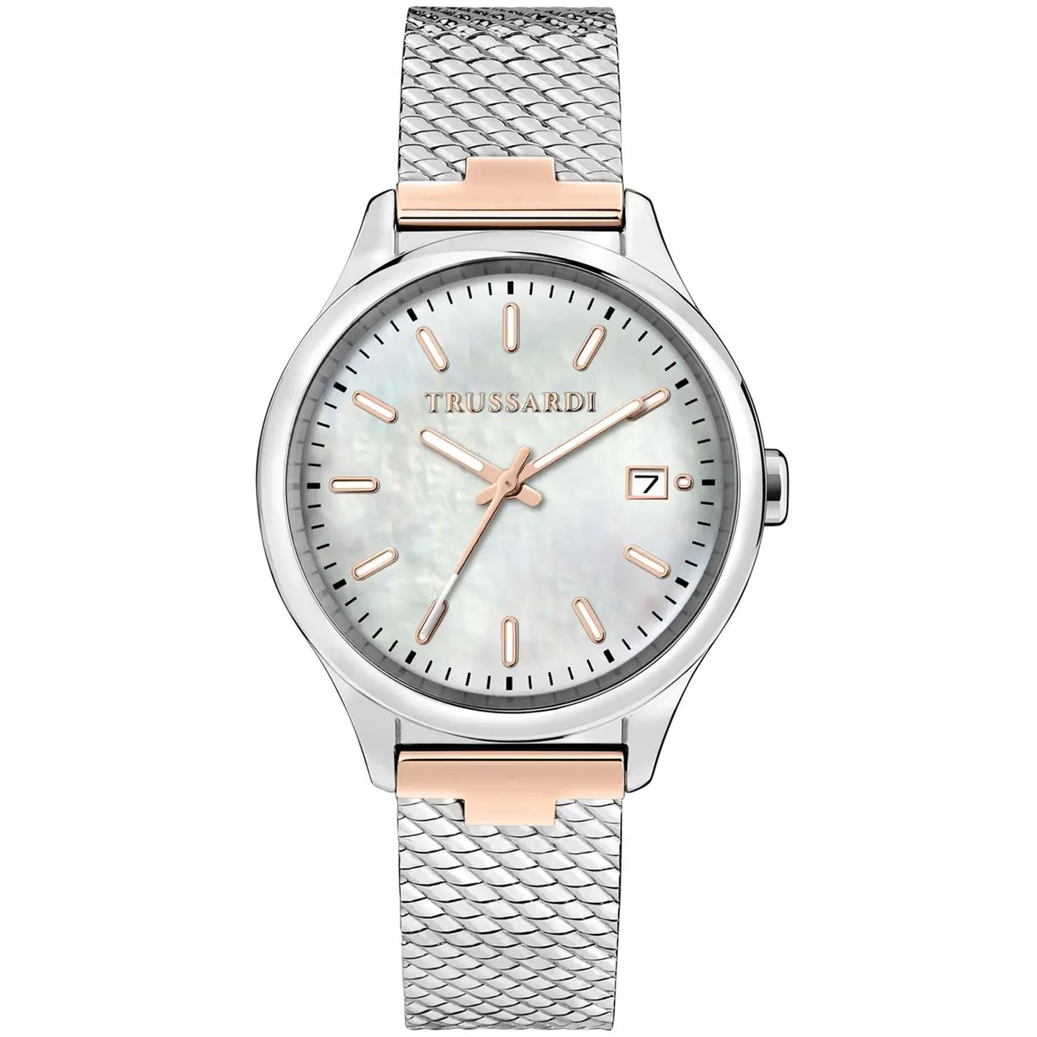 ساعت مچی زنانه Trussardi با طراحی کلاسیک بند استیل مسی و قاب استیل و صفحه گرد سفید صدفی با قابلیت داشتن تقویم شب نما و موتور ژاپنی با انرژی باتری و مقاومت در برابر آب تا عمق 50 متر به همراه گارانتی بین المللی