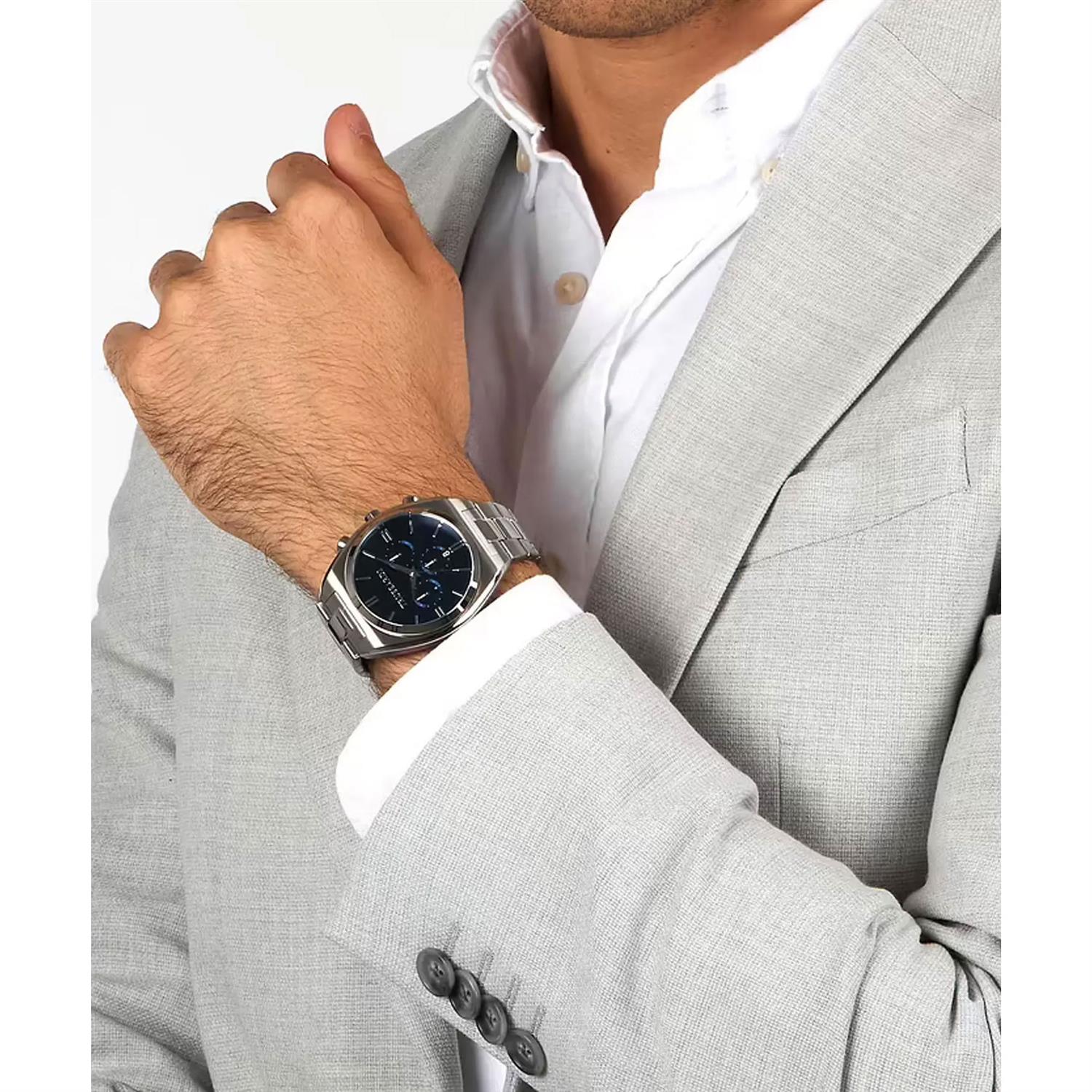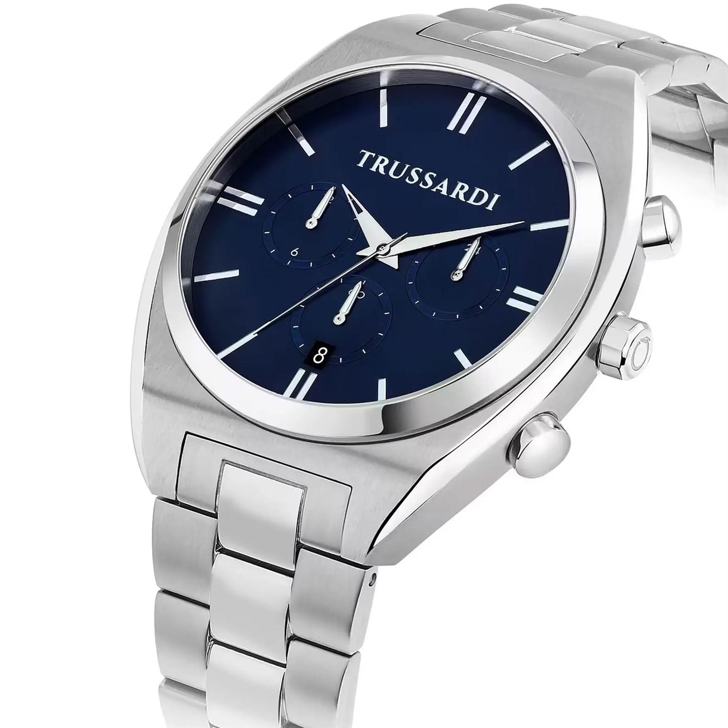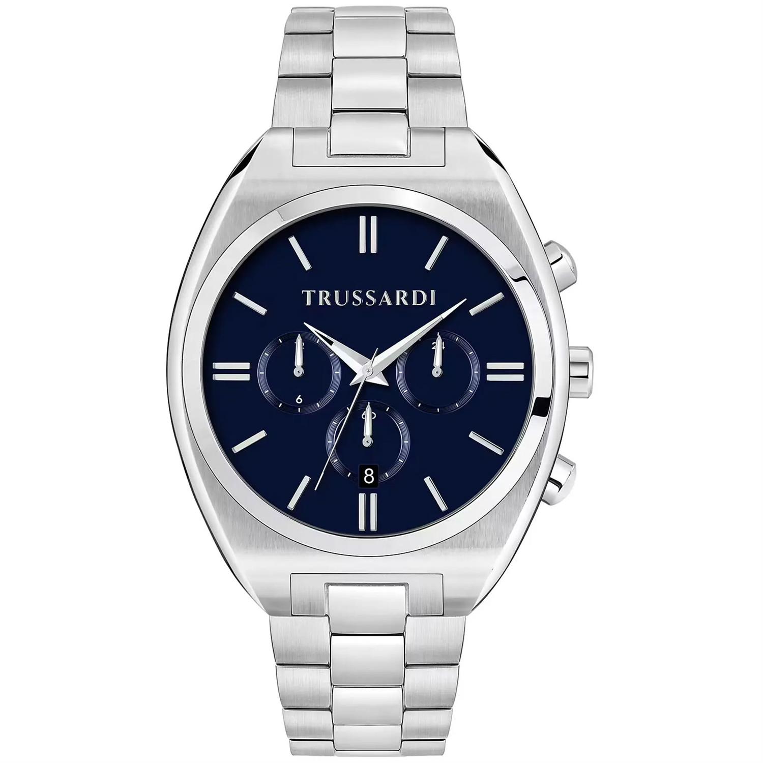 ساعت مچی مردانه Trussardi با طراحی کلاسیک بند استیل و قاب گرد استیل و صفحه گرد سرمه ای با قابلیت داشتن تقویم / کرنوگراف و موتور ژاپنی با انرژی باتری و مقاومت در برابر آب تا عمق 50 متر به همراه دو سال گارانتی بین المللی