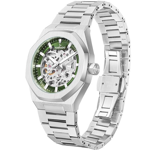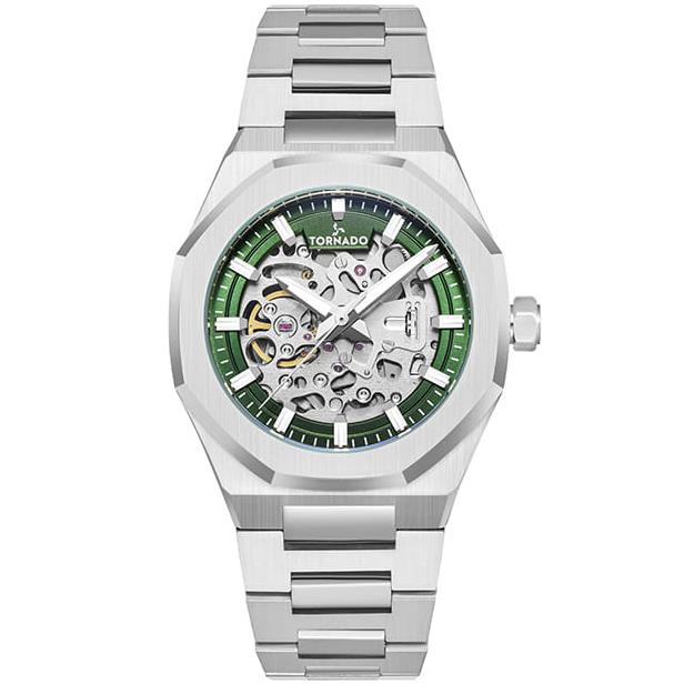 ساعت مچی مردانه تورنادو TORNADO با طراحی روزانه بند استیل و قاب استیل و صفحه اسکلتون سبز با شیشه ضد خراش و موتور اتوماتیک ژاپنی با قابلیت شب نما و انرژی مکانیکی و مقاوم در برابر آب تا عمق 100متر به همراه دو سال گارانتی بین المللی