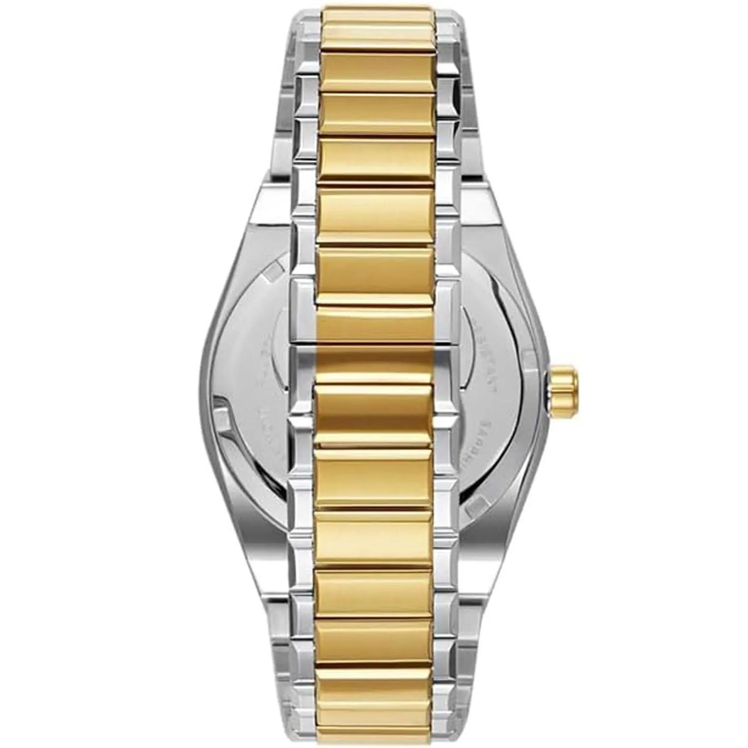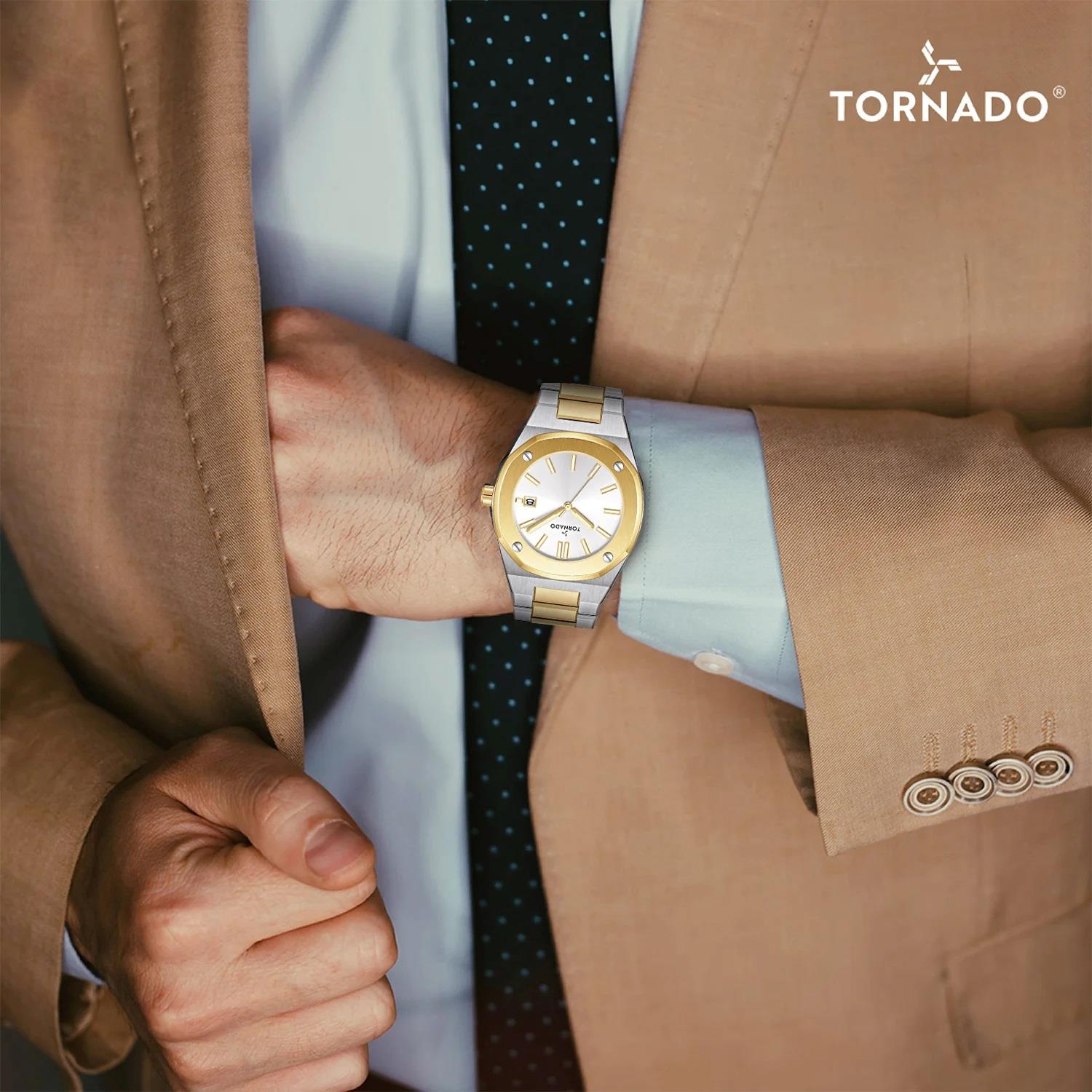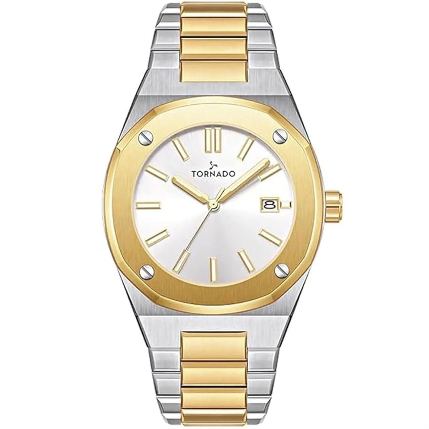 ساعت مچی مردانه تورنادو TORNADO با طراحی روزانه بند استیل طلایی و قاب طلایی استیل و صفحه ی نقره ای با شیشه ضد خراش و موتور ژاپنی با قابلیت شب نما/ تقویم و انرژی باتری و مقاوم در برابر آب تا عمق 100متر به همراه دو سال گارانتی بین المللی