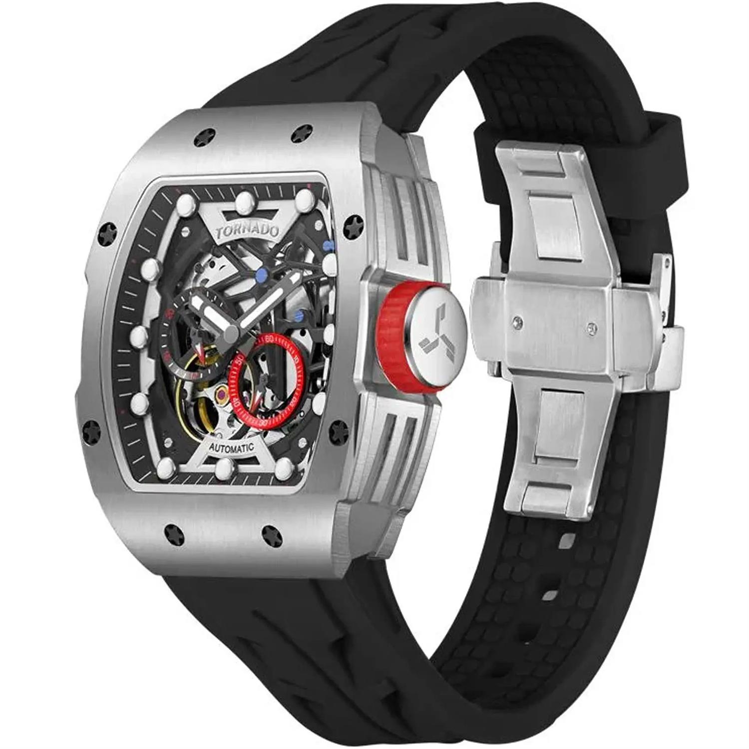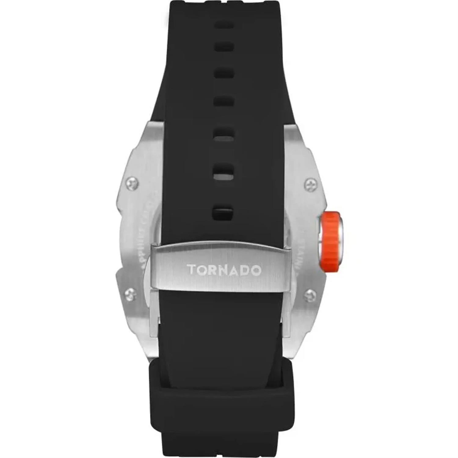 ساعت مچی مردانه تورنادو TORNADO با طراحی روزانه بند سیلیکونی مشکی و قاب مستطیلی استیل و صفحه اسکلتون مشکی با شیشه ضد خراش و موتوراتوماتیک ژاپنی با قابلیت شب نما کرنوگراف و انرژی مکانیکی و مقاوم در برابر آب تا عمق 100متر به همراه دو سال گارانتی بین المللی