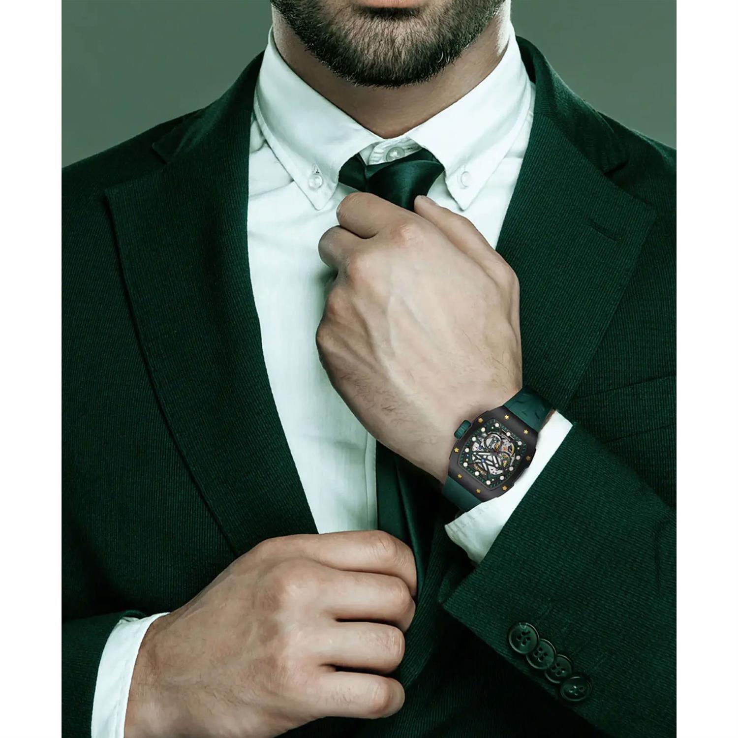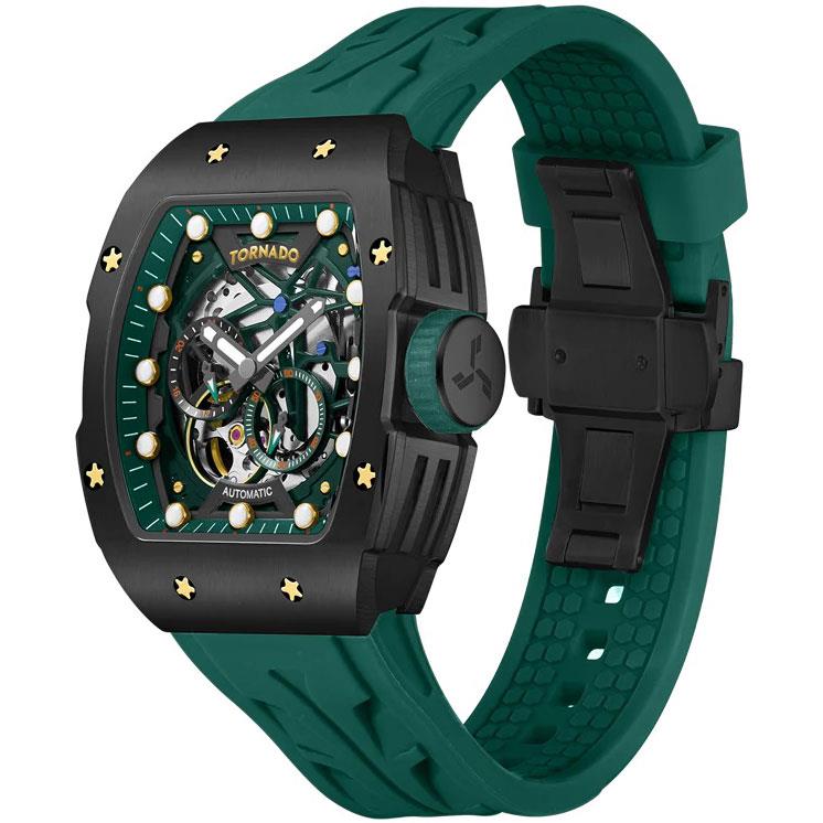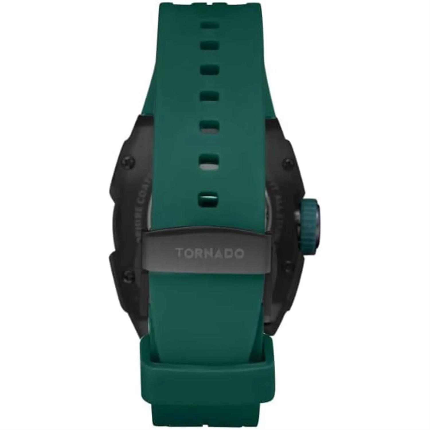 ساعت مچی مردانه تورنادو TORNADO با طراحی روزانه بند سیلیکونی سبز و قاب مستطیلی شکل و صفحه اسکلتون سبز با شیشه ضد خراش و موتوراتوماتیک ژاپنی با قابلیت شب نما کرنوگراف و انرژی مکانیکی و مقاوم در برابر آب تا عمق 100 متر به همراه دو سال گارانتی بین المللی