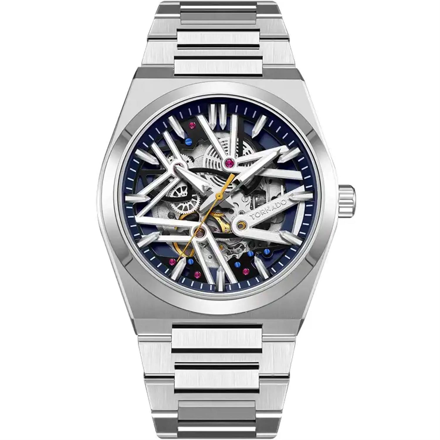 ساعت مچی مردانه تورنادو TORNADO با طراحی روزانه بند استیل و قاب گرد استیل و صفحه اسکلتون مشکی با شیشه ضد خراش و موتور اتوماتیک ژاپنی با قابلیت شب نما و انرژی مکانیکی و مقاوم در برابر آب تا عمق 100 متر به همراه دو سال گارانتی بین المللی