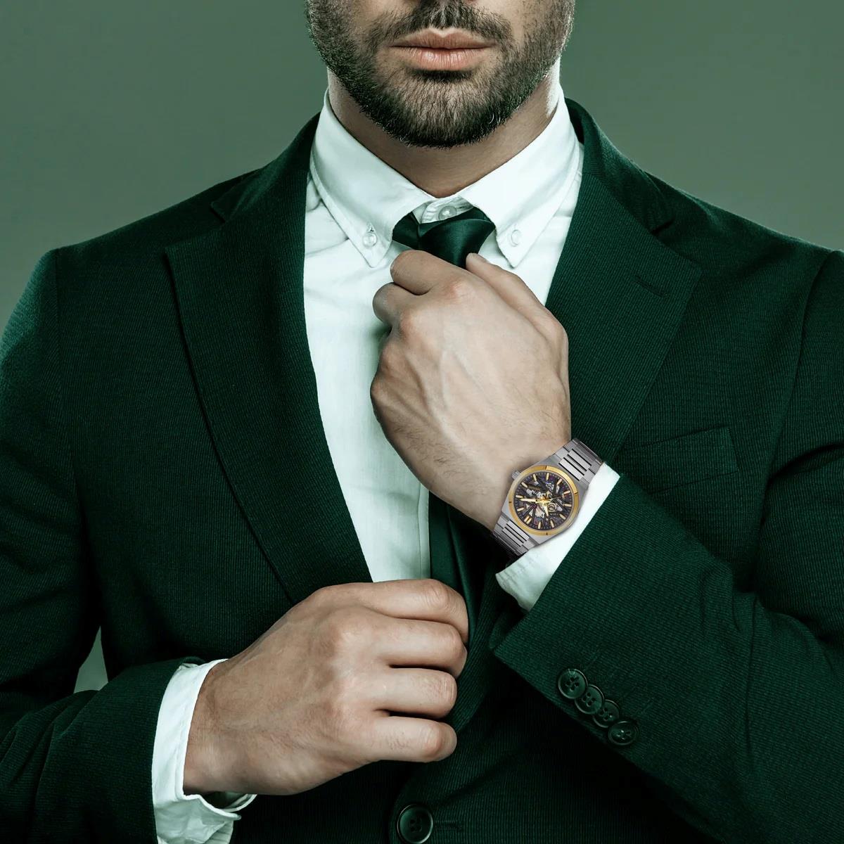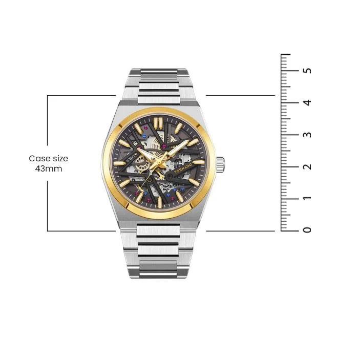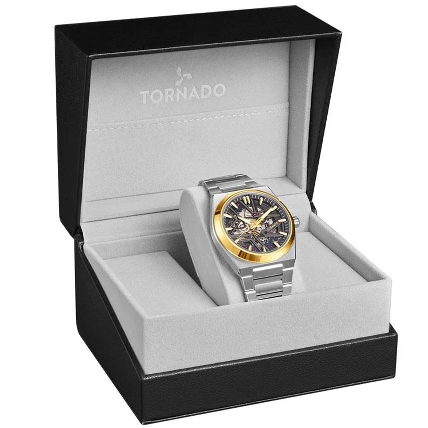 ساعت مچی مردانه تورنادو TORNADO با طراحی روزانه بند استیل و قاب گرد استیل طلایی و صفحه اسکلتون مشکی با شیشه ضد خراش و موتور اتوماتیک ژاپنی با قابلیت شب نما و انرژی مکانیکی و مقاوم در برابر آب تا عمق 100 متر به همراه دو سال گارانتی بین المللی