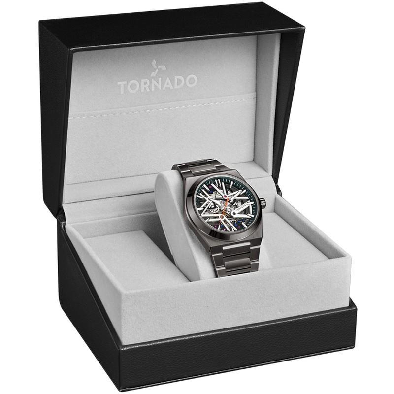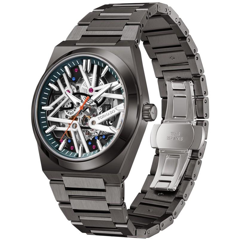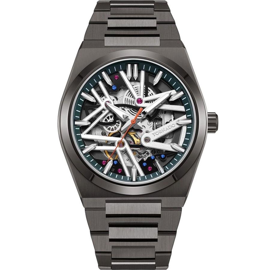 ساعت مچی مردانه تورنادو TORNADO با طراحی روزانه بند فلزی دودی و قاب گرد دودی و صفحه اسکلتون سبز با شیشه ضد خراش و موتور اتوماتیک ژاپنی با قابلیت شب نما و انرژی مکانیکی و مقاوم در برابر آب تا عمق 100متر به همراه دو سال گارانتی بین المللی