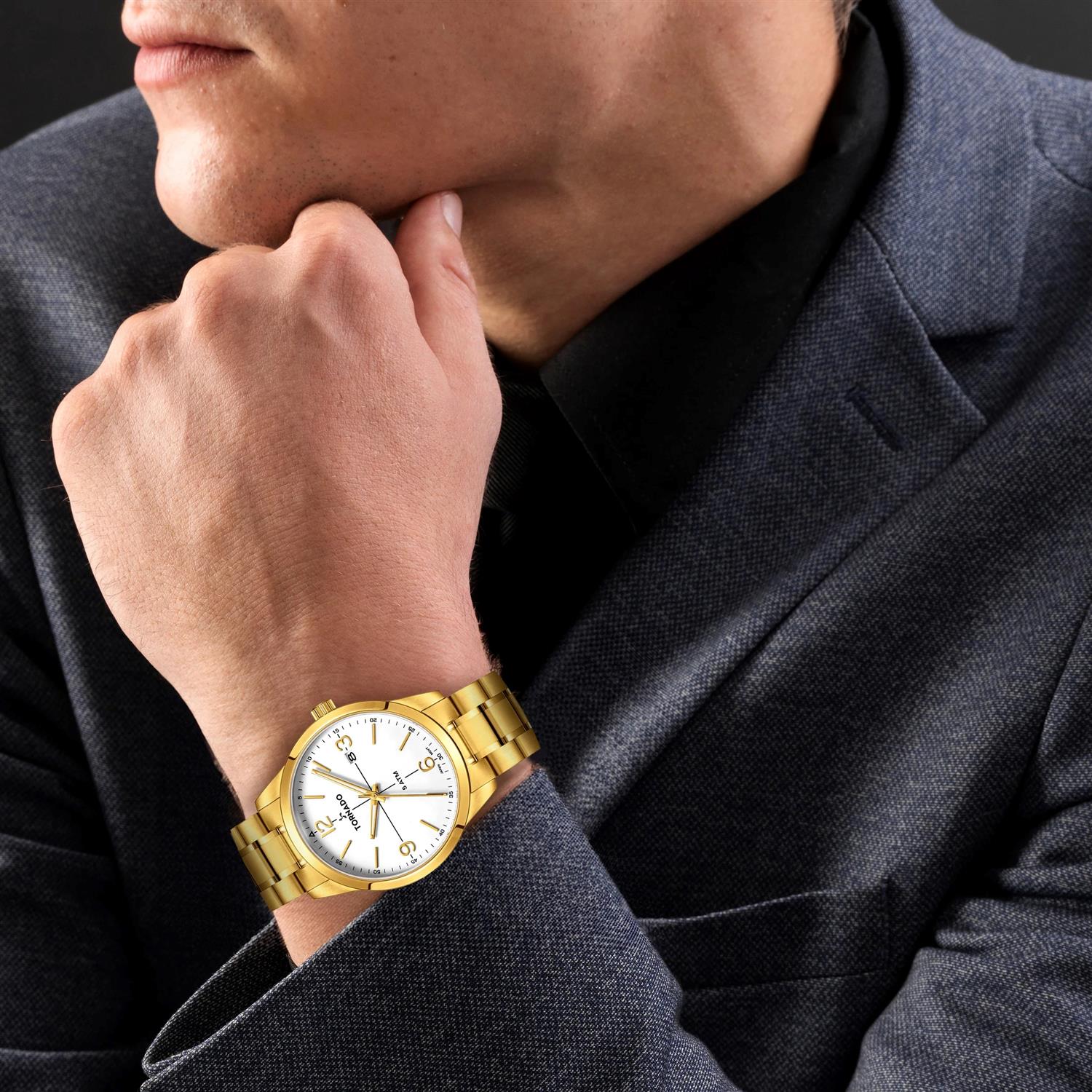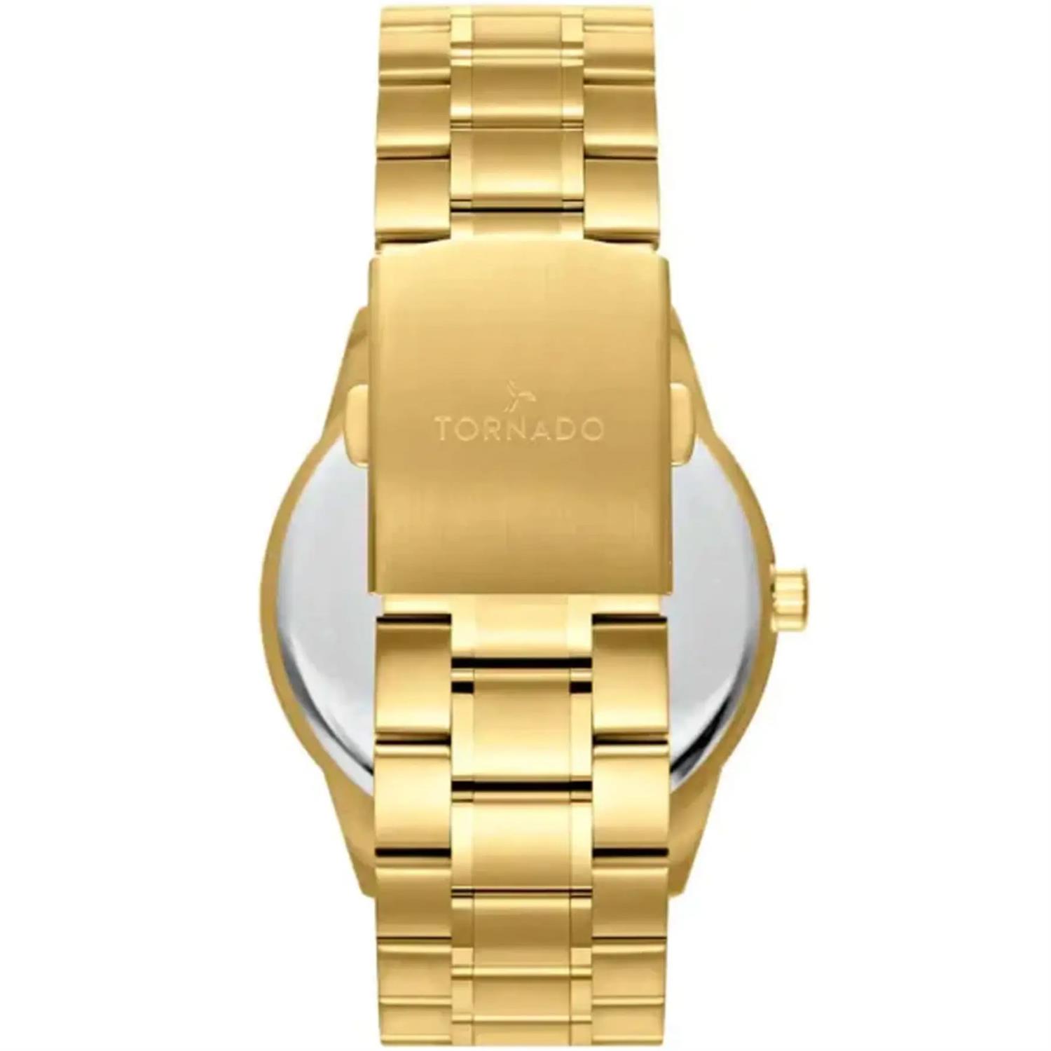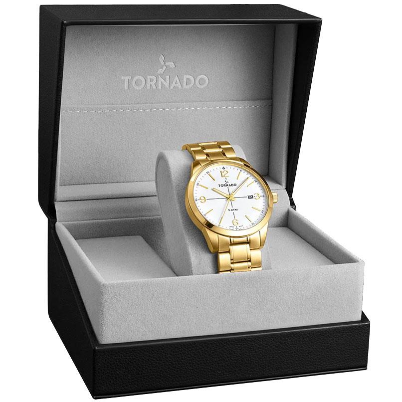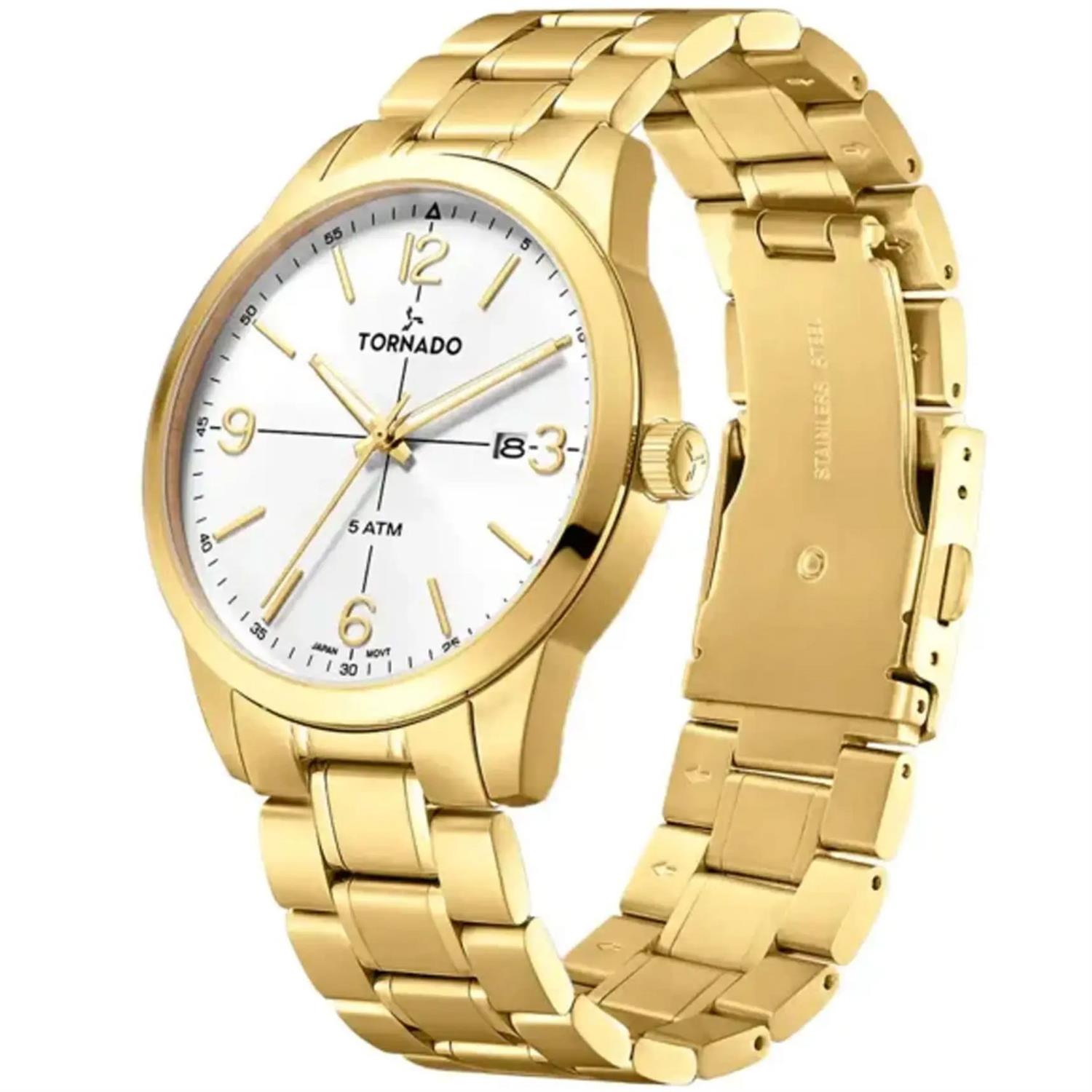 ساعت مچی مردانه تورنادو TORNADO با طراحی روزانه بند فلزی طلایی و قاب گرد فلزی طلایی و صفحه سفید با شیشه ضد خراش و موتور ژاپنی با قابلیت تقویم /شب نما و انرژی باتری و مقاوم در برابر آب تا عمق 50 متر به همراه دو سال گارانتی بین المللی