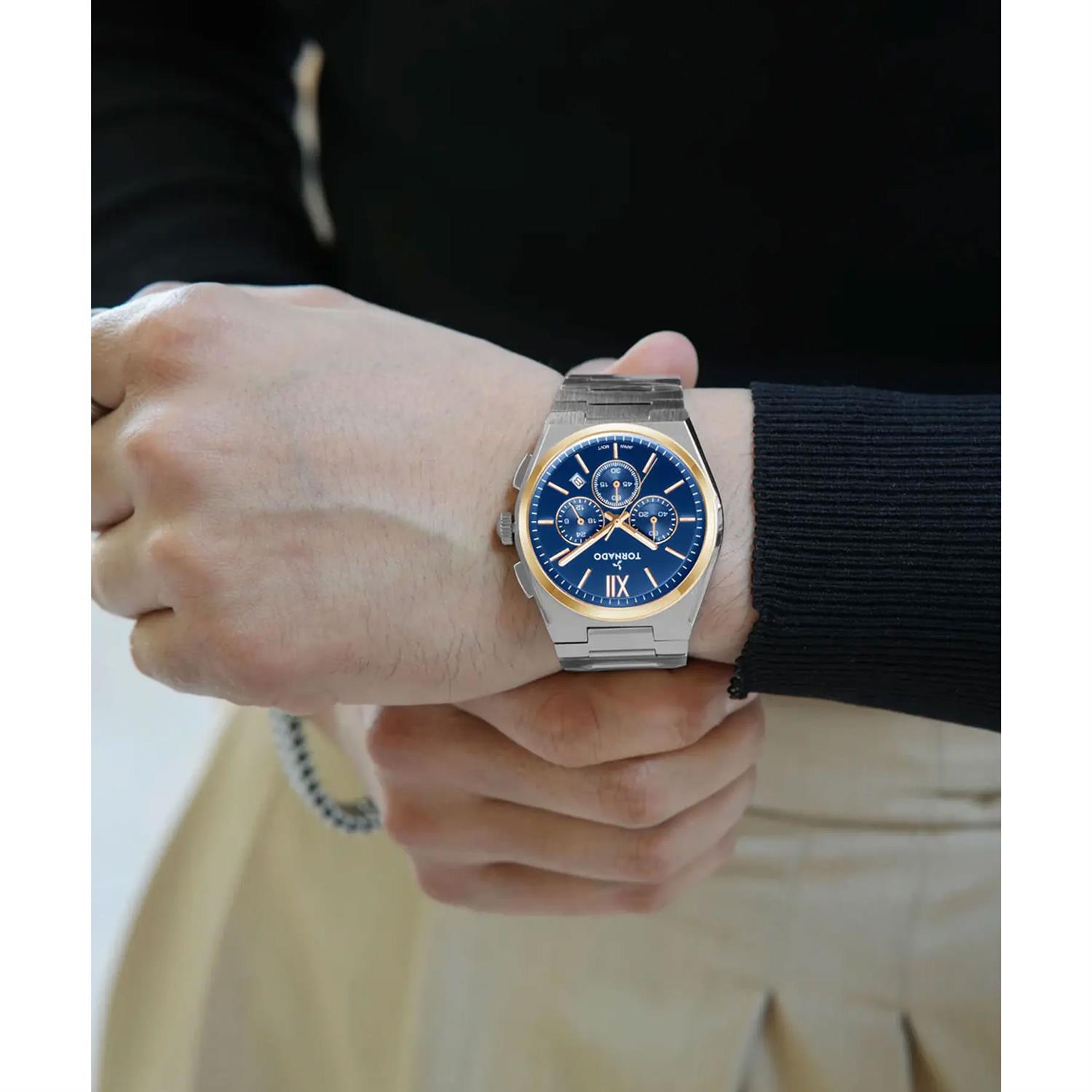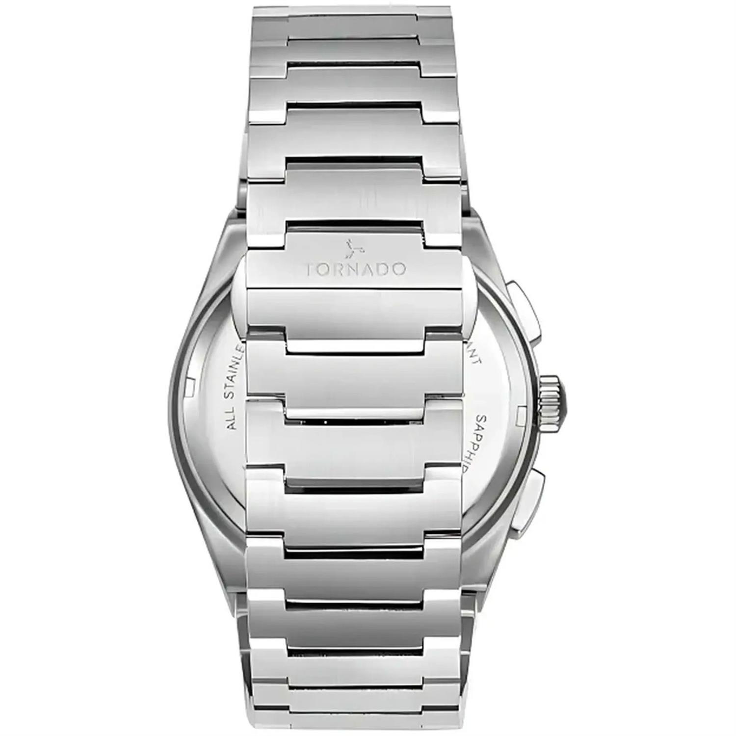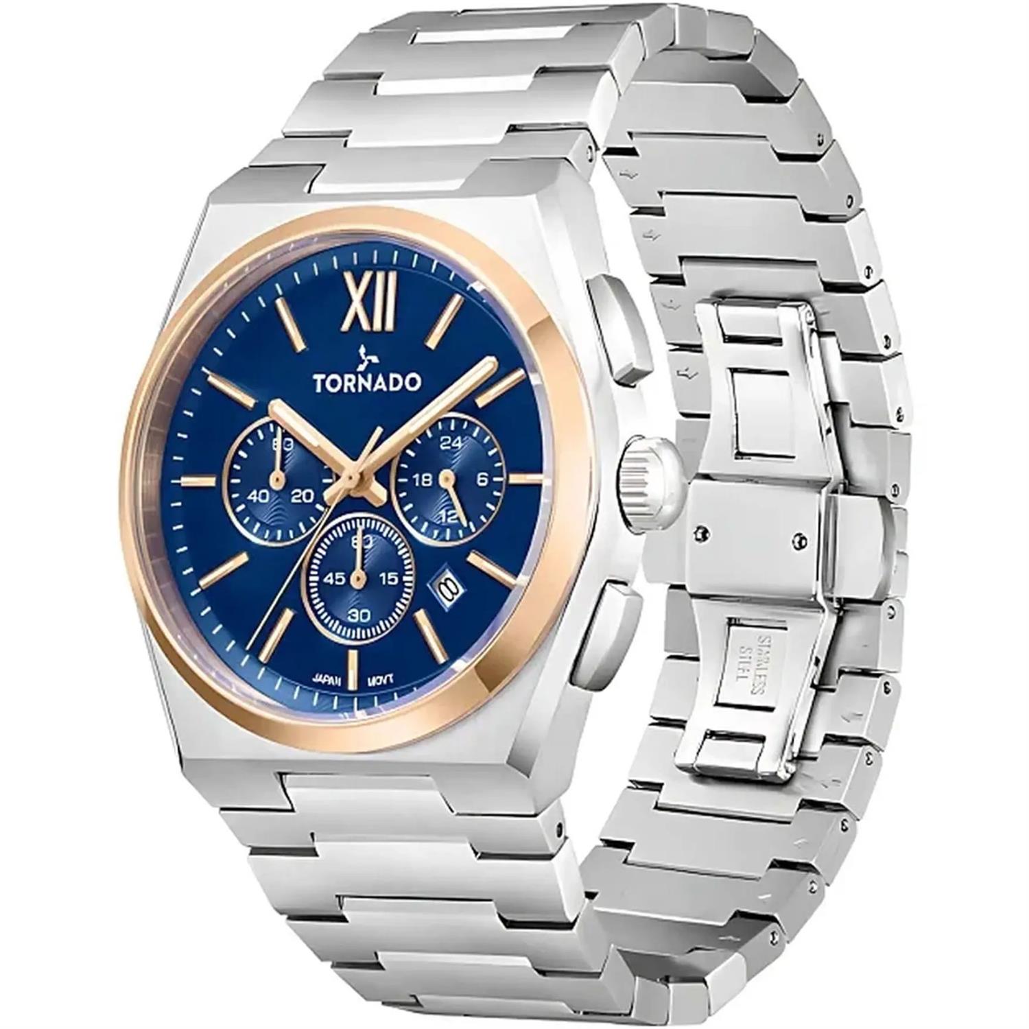 ساعت مچی مردانه تورنادو TORNADO با طراحی روزانه بند استیل و قاب گرد مسی استیل و صفحه سرمه ای با شیشه ضد خراش و موتور ژاپنی با قابلیت شب نما تقویم کرنوگراف و انرژی باتری و مقاوم در برابر آب تا عمق 100 متر به همراه دو سال گارانتی بین المللی