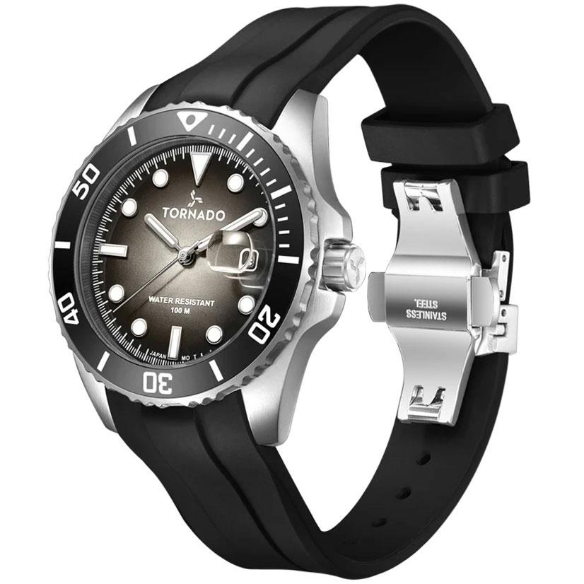 ساعت مچی مردانه تورنادو TORNADO با طراحی روزانه بند سیلیکونی مشکی و قاب استیل مشکی و صفحه طوسی مشکی با موتور ژاپنی با قابلیت شب نما تقویم زه چرخان و انرژی باتری و مقاوم در برابر آب تا عمق 100متر به همراه دو سال گارانتی بین المللی