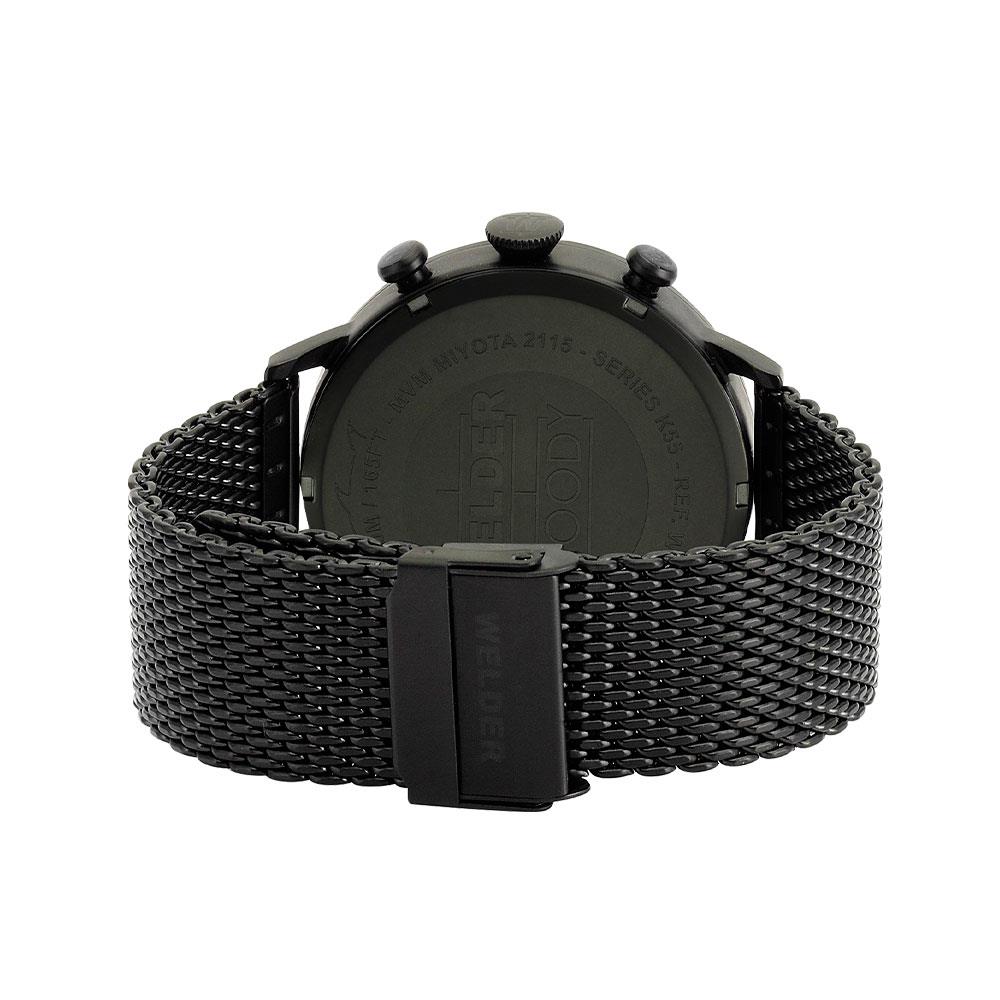 ساعت مچی مردانه ولدر WELDER با طراحی روزانه بند فلزی حصیربافت مشکی و قاب مشکی با صفحه گرد سرمه ای شیشه فتوکرومیک با موتور ژاپنی و انرژی باطری وقابلیت داشتن تقویم / دوزمانه و مقاوم در برابر آب تا عمق 50 متر به همراه دو سال گارانتی شرکتی