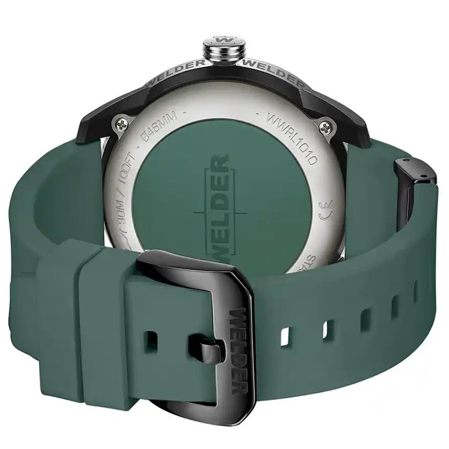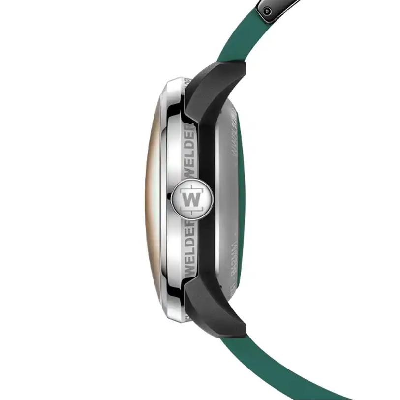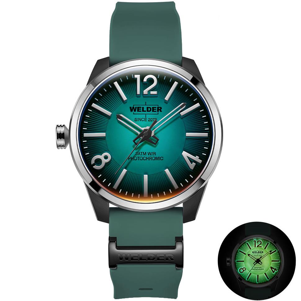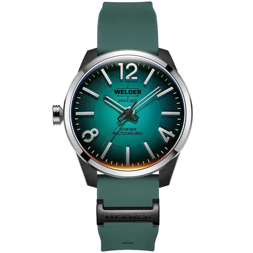 ساعت مچی مردانه ولدر WELDER با طراحی روزانه بند سیلیکونی سبزو قاب استیل مشکی با صفحه سبزو شیشه فتوکرومیک با موتور ژاپنی و قابلیت نورپشت صفحه با انرژی باطری و مقاوم در برابر آب تا عمق 30 متر به همراه دو سال گارانتی شرکتی