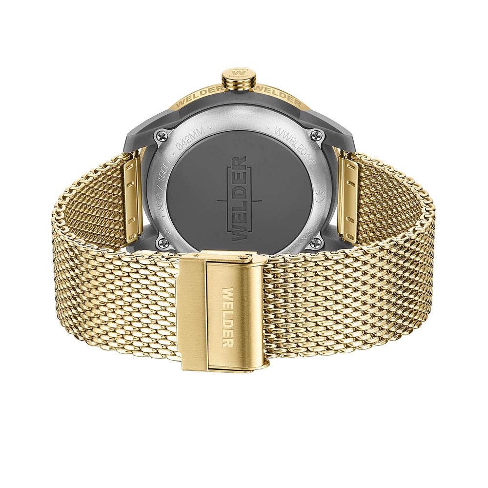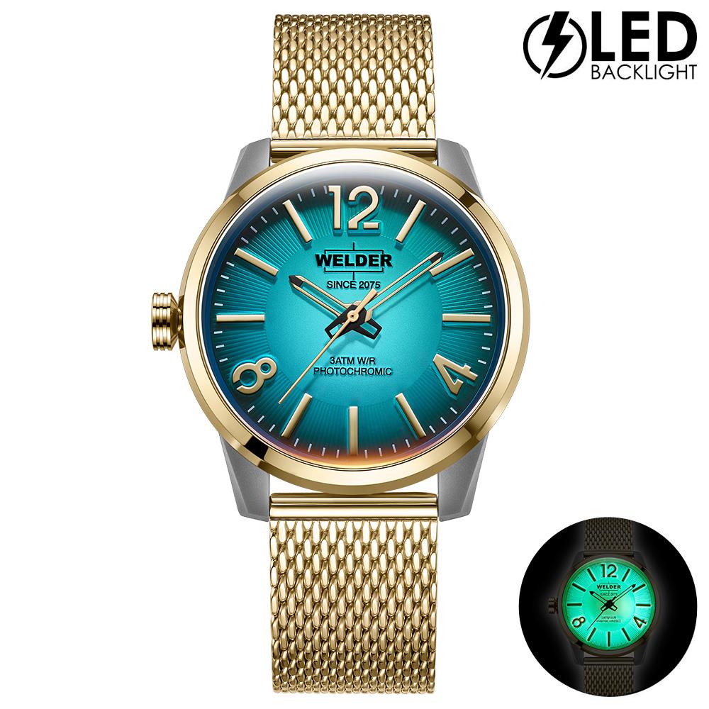 ساعت مچی مردانه ولدر WELDER با طراحی روزانه بند حصیر بافت طلایی و قاب گرد استیل طلایی با صفحه گرد آبی شیشه فتوکرومیک با موتور ژاپنی  و انرژی باطری و قابلیت داشتن نورپشت صفحه و مقاوم در برابر آب تا عمق 30 متر به همراه دو سال گارانتی شرکتی