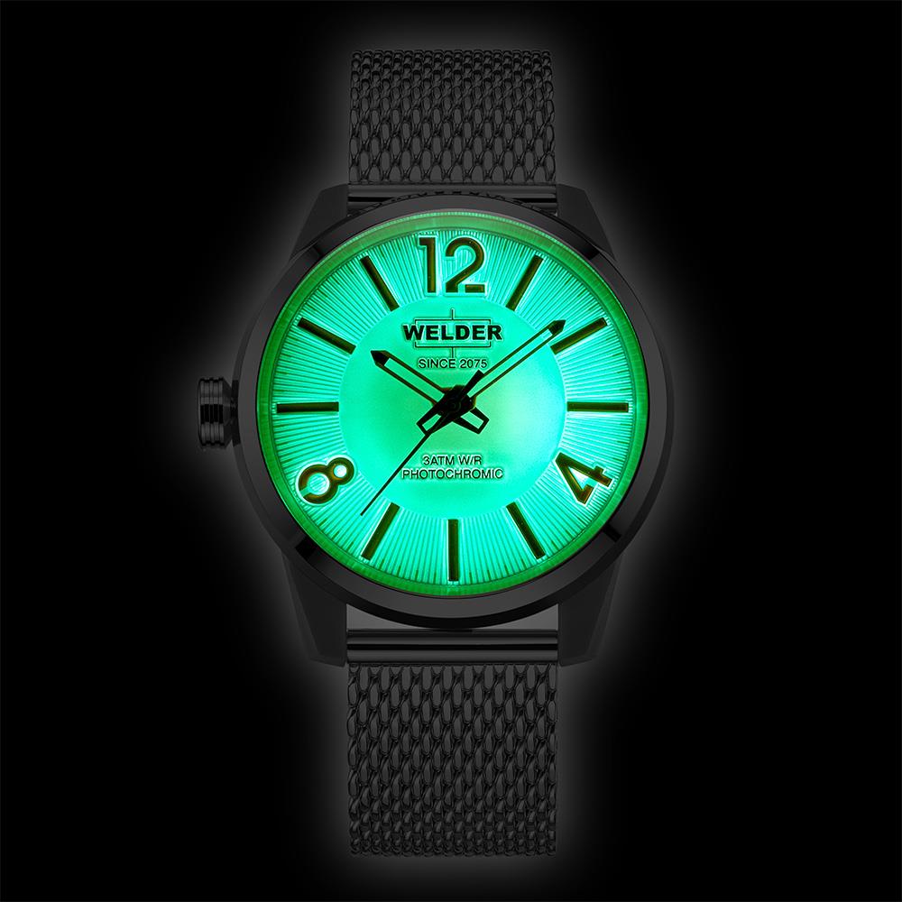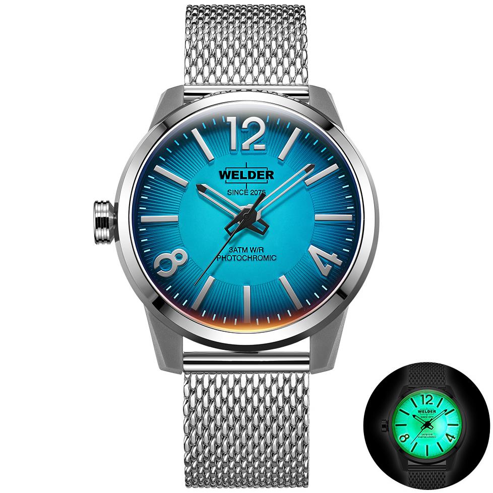 ساعت مچی زنانه ولدر WELDER با طراحی روزانه بند حصیربافت استیل و قاب گرد استیل با صفحه گرد آبی شیشه فتوکرومیک با موتور ژاپنی و انرژی باطری و قابلیت داشتن نورپشت صفحه و مقاوم در برابر آب تا عمق 30 متر به همراه دو سال گارانتی شرکتی