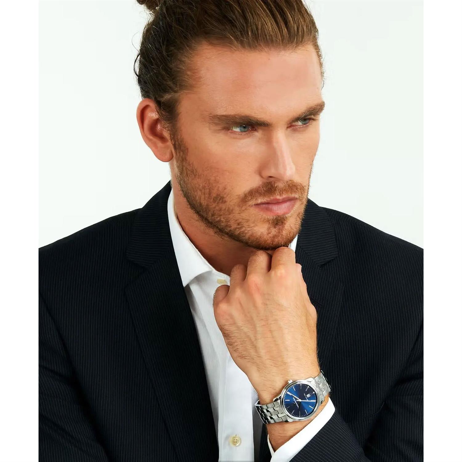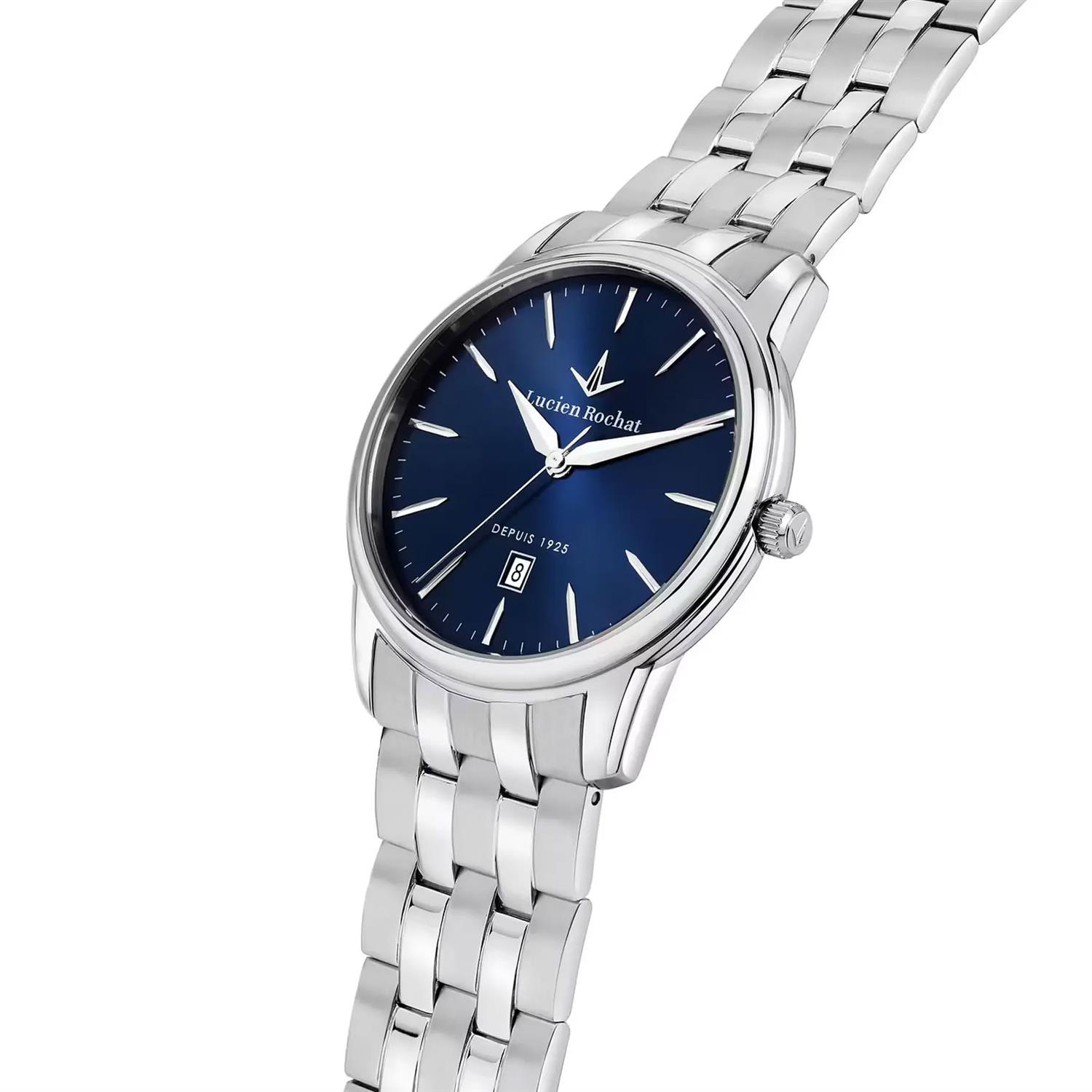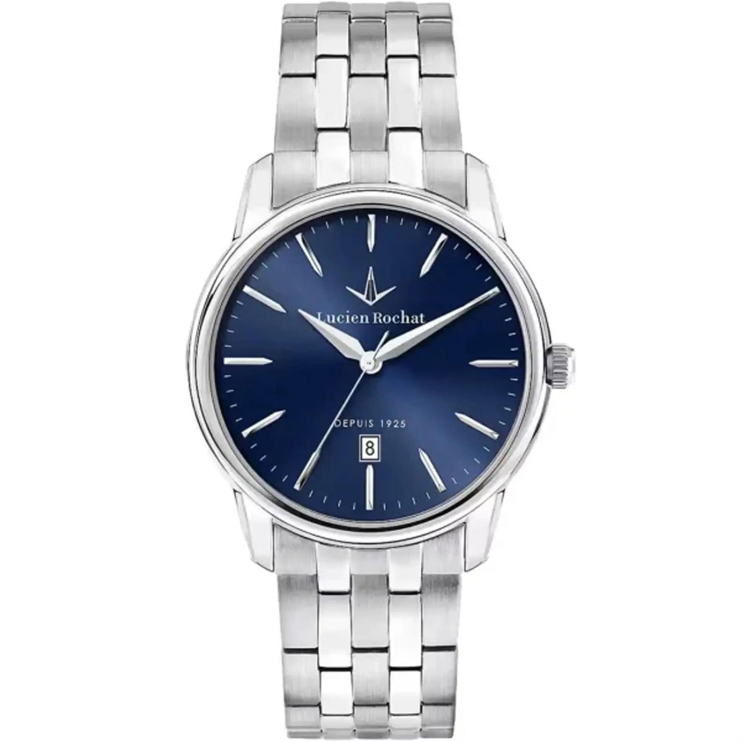 ساعت مچی مردانه لوسین روشا lucian rochat با طراحی روزانه بند استیل و قاب گرد استیل و صفحه گرد سرمه ای با شیشه ضد خراش و قابلیت تقویم و موتور ژاپنی با انرژی باتری و مقاوم در برابر آب تا عمق 30 متر به همراه گارانتی بین المللی