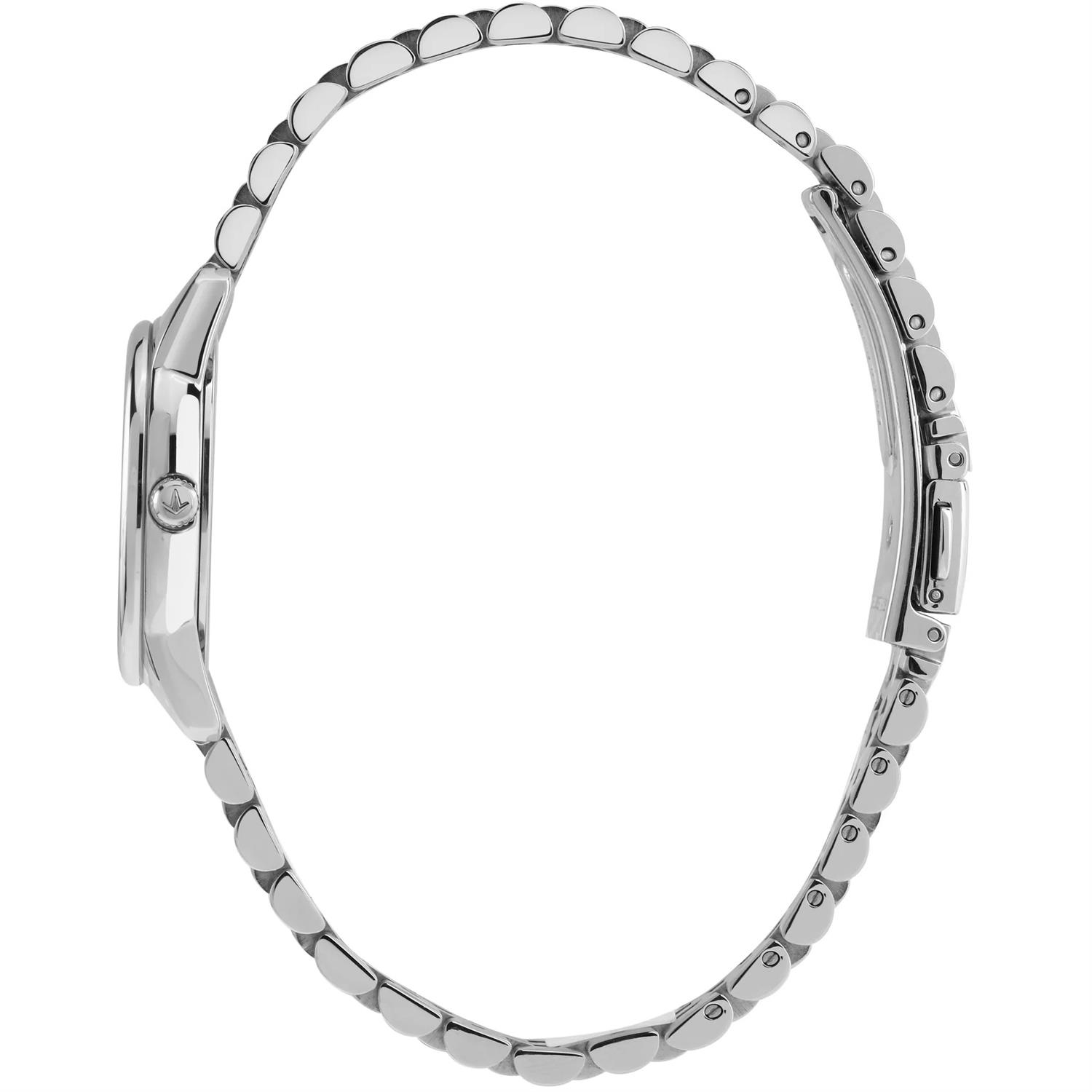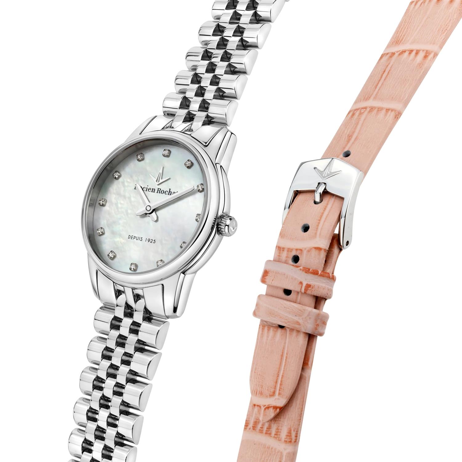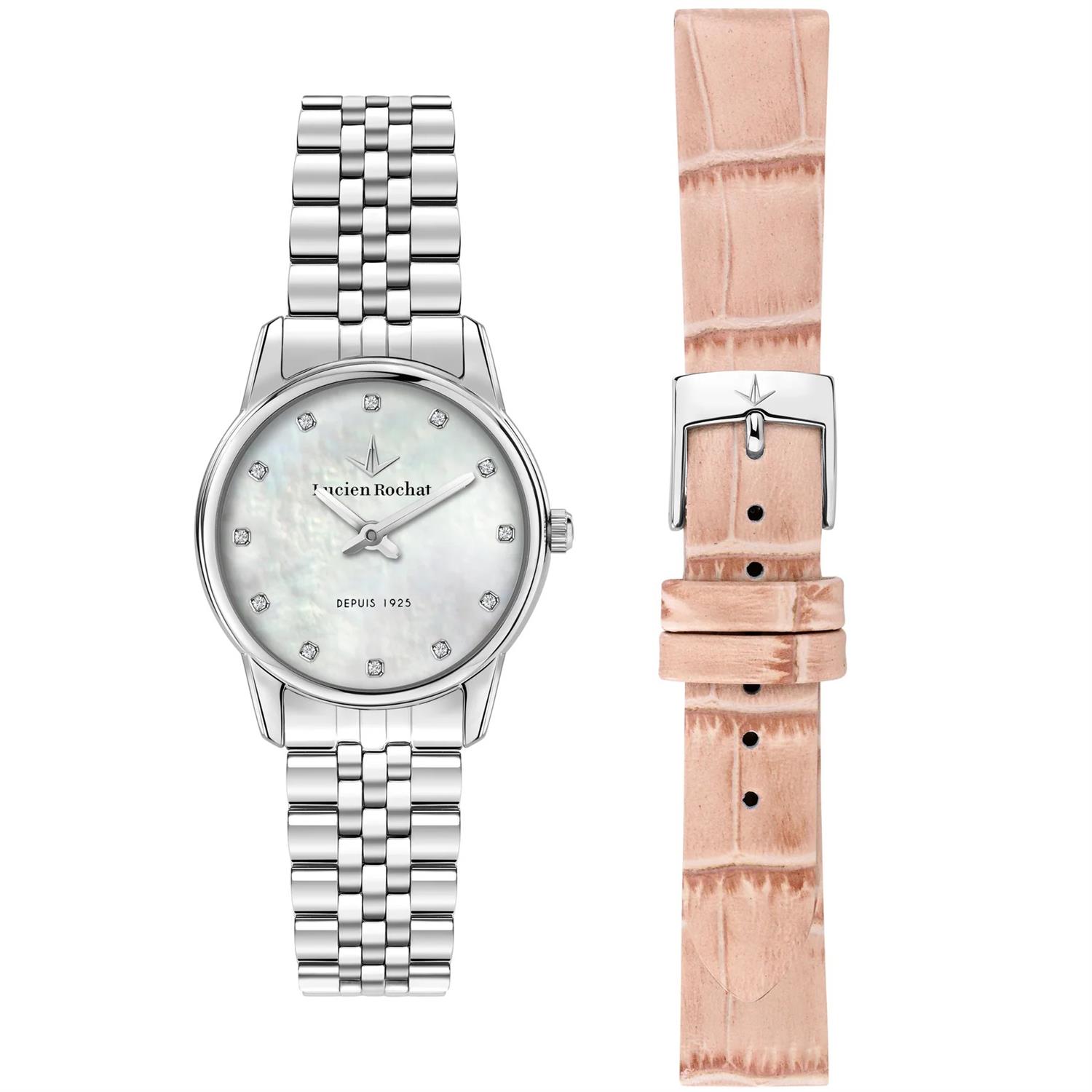 ساعت مچی زنانه لوسین روشا lucian rochat با طراحی کلاسیک بند استیل / قاب استیل صفحه مزین به نگین سفید صدفی با شیشه ضد خراش و موتور ژاپنی با انرژی باتری و مقاوم در برابر آب تا عمق 30 متر به همراه گارانتی بین المللی