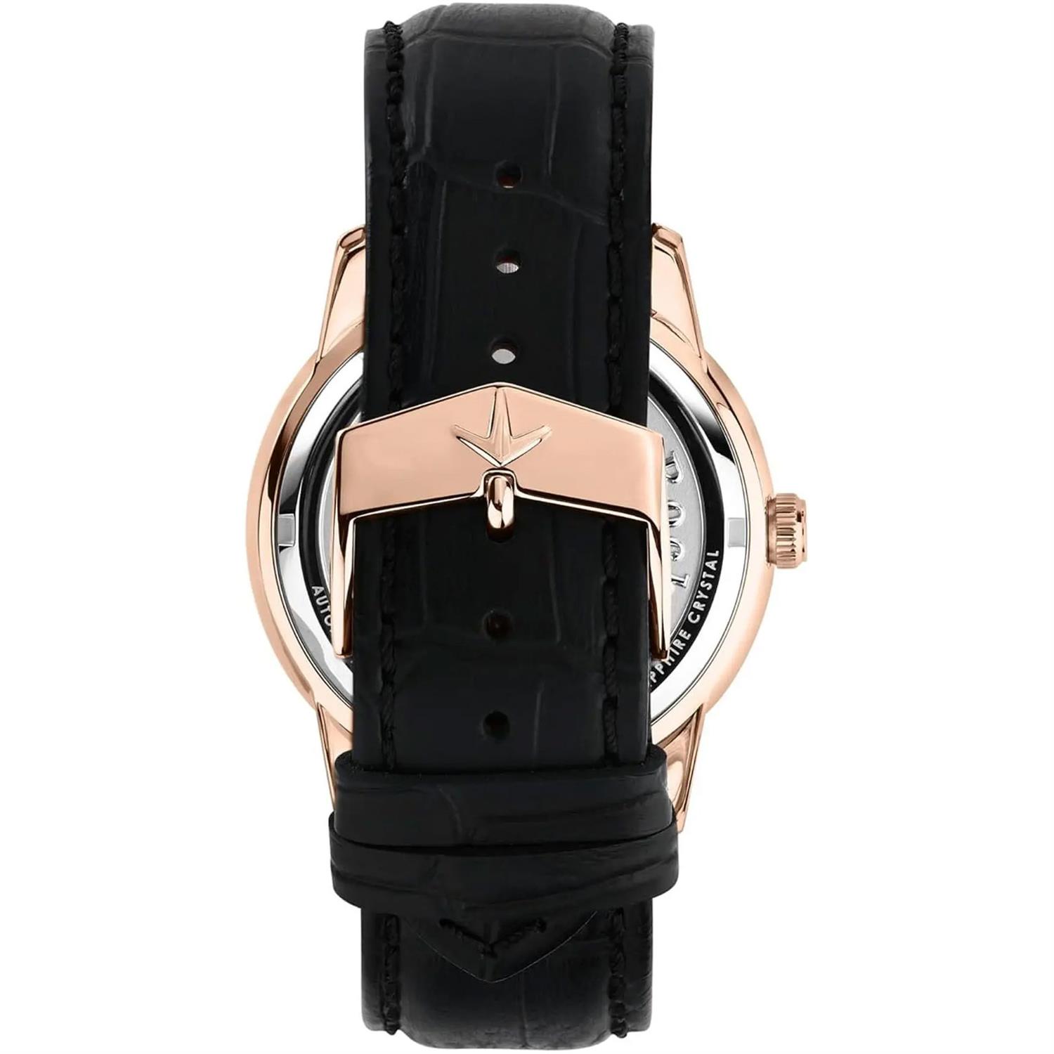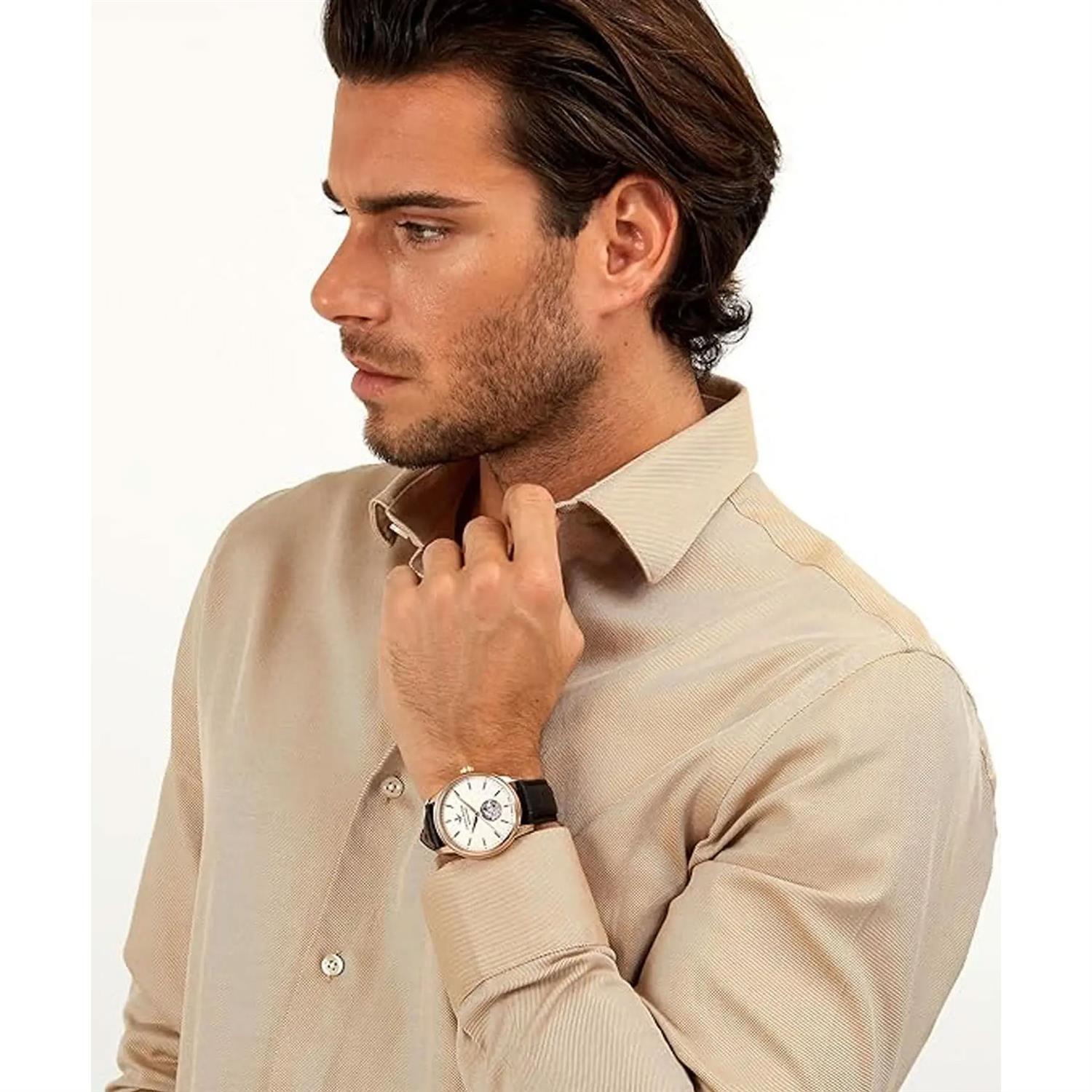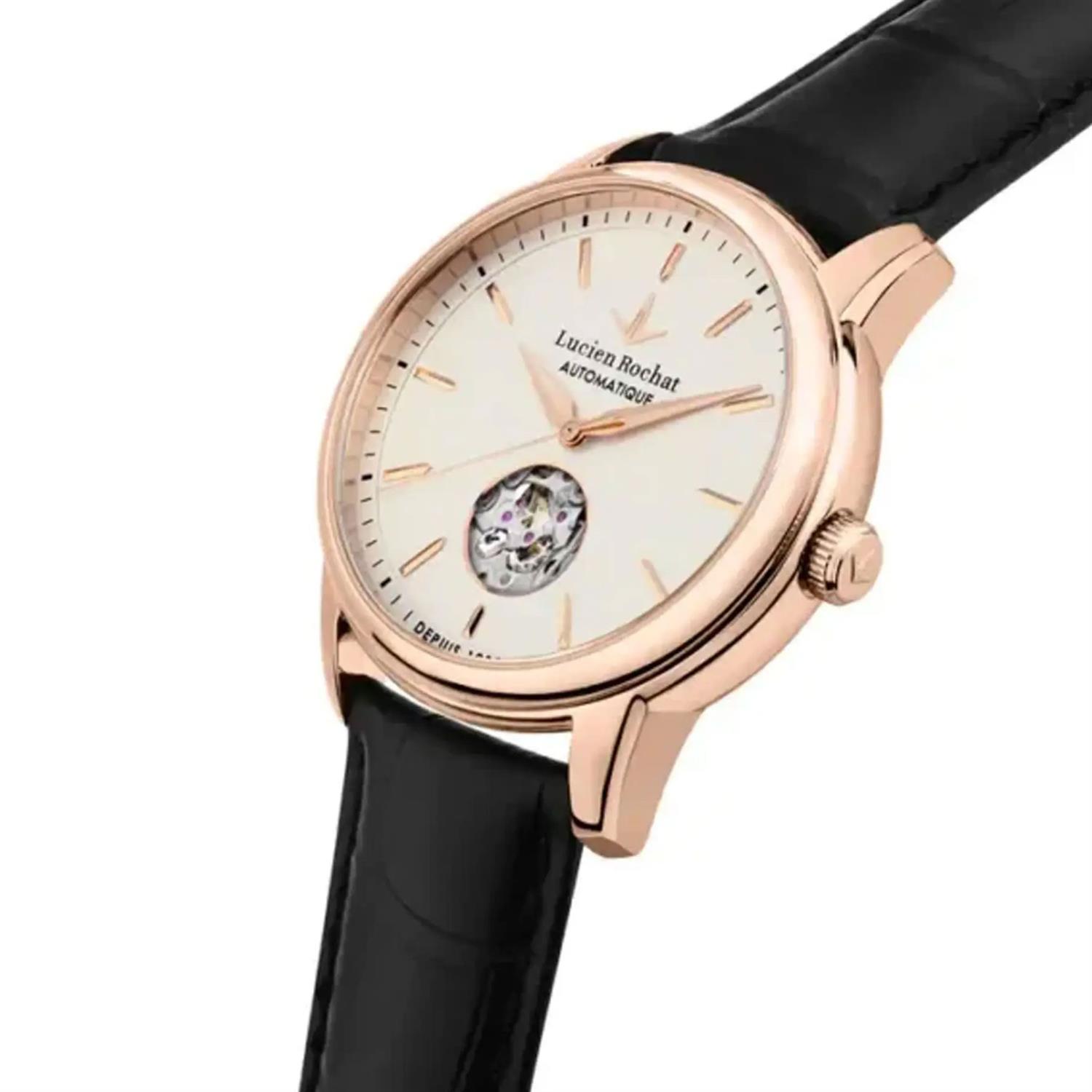 ساعت مچی مردانه لوسین روشا lucian rochat با طراحی روزانه بند چرمی مشکی / قاب گرد مسی و صفحه قلب باز سفید با شیشه ضد خراش و موتور اتوماتیک ژاپنی با انرژی مکانیکی و مقاوم در برابر آب تا عمق 30 متر به همراه گارانتی بین المللی
