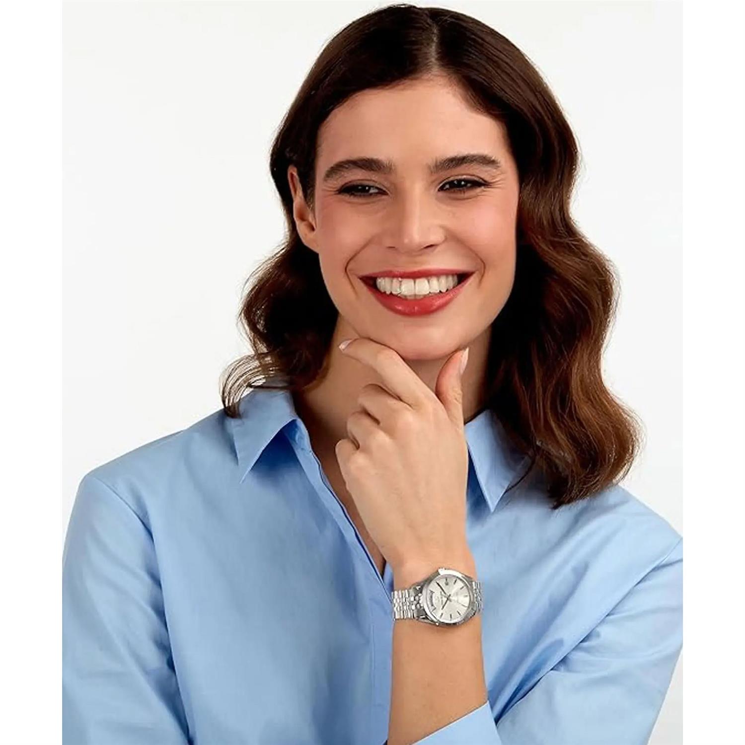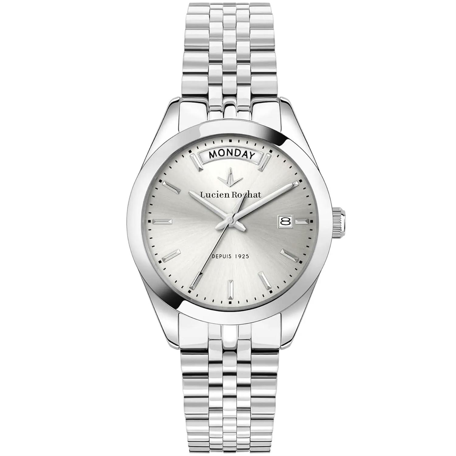 ساعت مچی زنانه لوسین روشا lucian rochat با طراحی کلاسیک بند استیل / قاب استیل صفحه گرد نقره ای و موتور ژاپنی با انرژی باتری و قابلیت داشتن تقویم / روزهای هفته و مقاوم در برابر آب تا عمق 30 متر به همراه گارانتی بین المللی