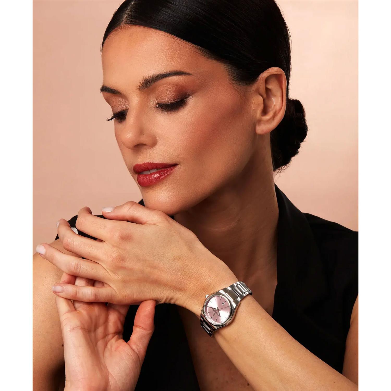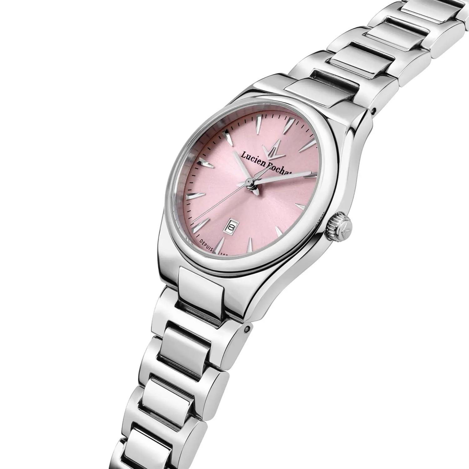 ساعت مچی زنانه لوسین روشا lucian rochat با طراحی کلاسیک بند استیل / قاب استیل و صفحه صورتی با شیشه ضد خراش وقابلیت داشتن تقویم و موتور ژاپنی با انرژی باتری و مقاوم در برابر آب تا عمق 30 متر به همراه گارانتی بین المللی