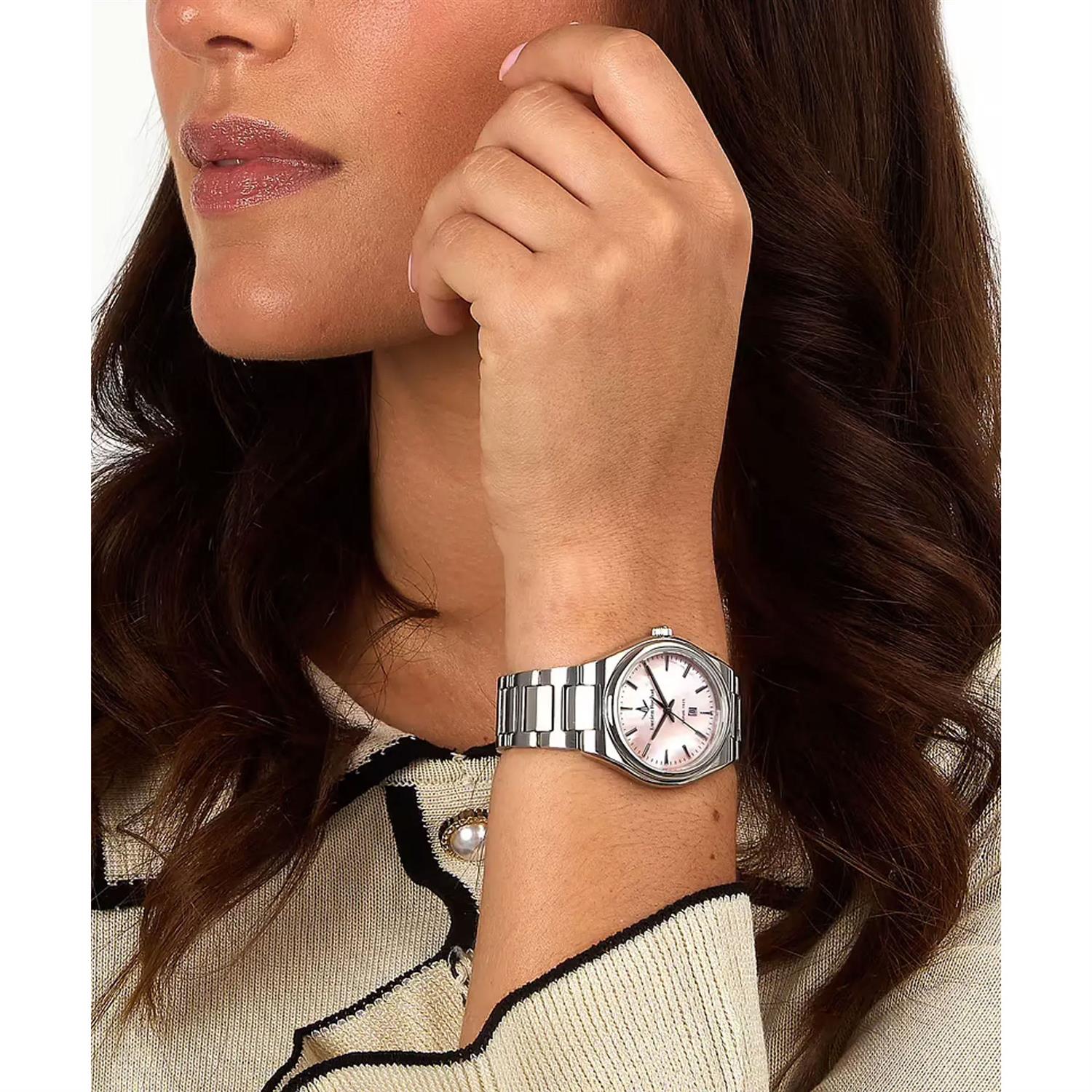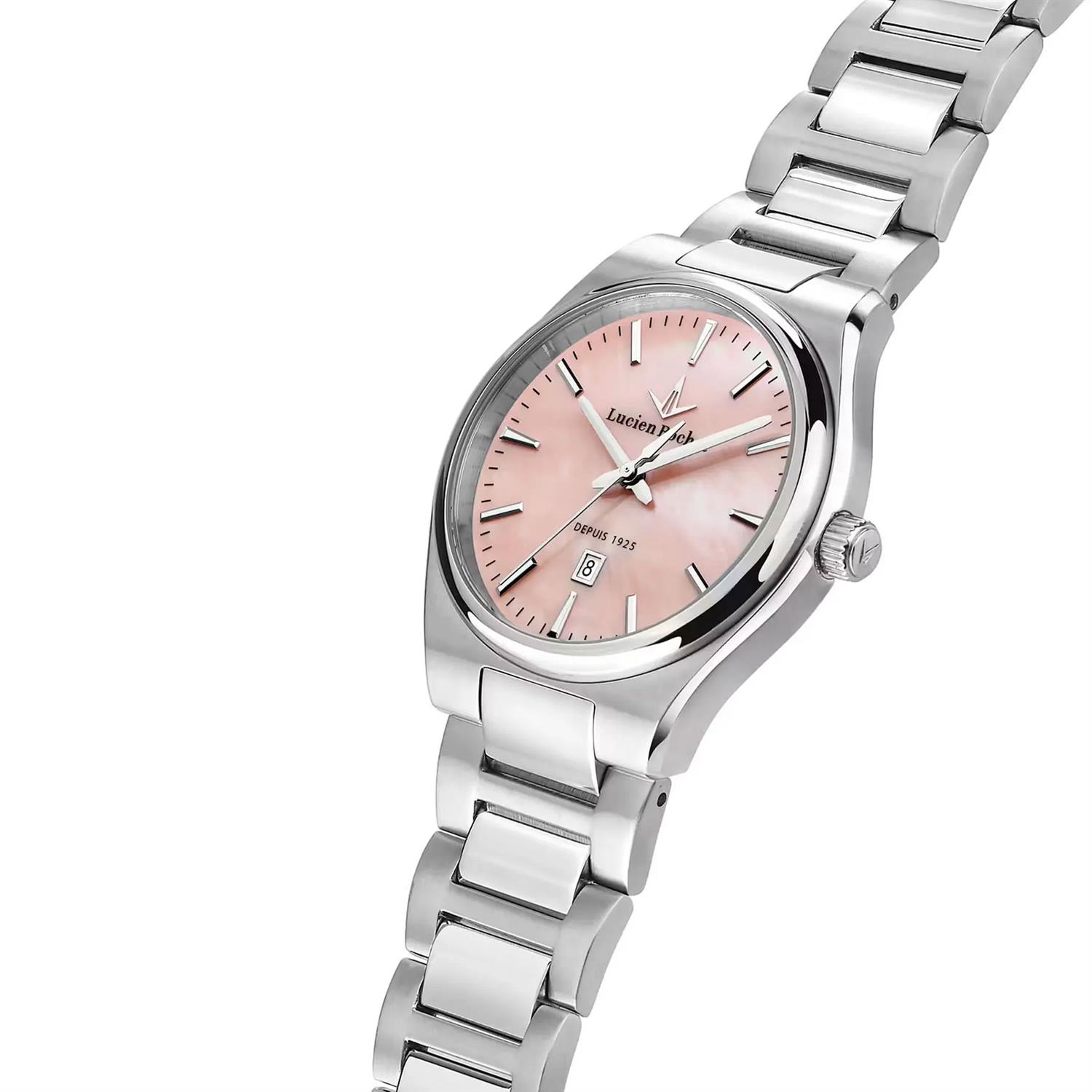 ساعت مچی زنانه لوسین روشا lucian rochat با طراحی کلاسیک بند استیل / قاب استیل صفحه صورتی صدفی و موتور ژاپنی با انرژی باتری و قابلیت داشتن تقویم و مقاوم در برابر آب تا عمق 30 متر به همراه گارانتی بین المللی