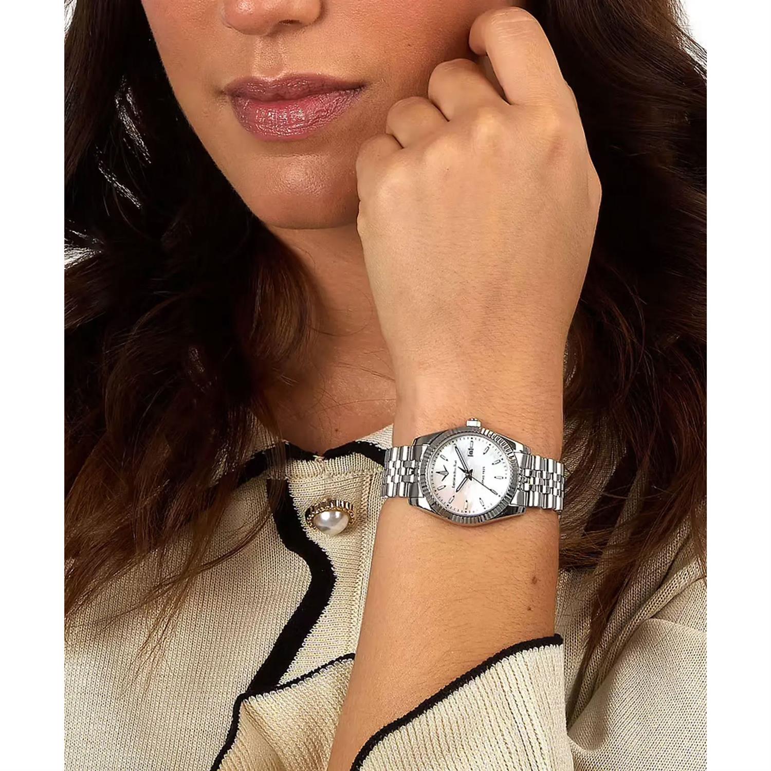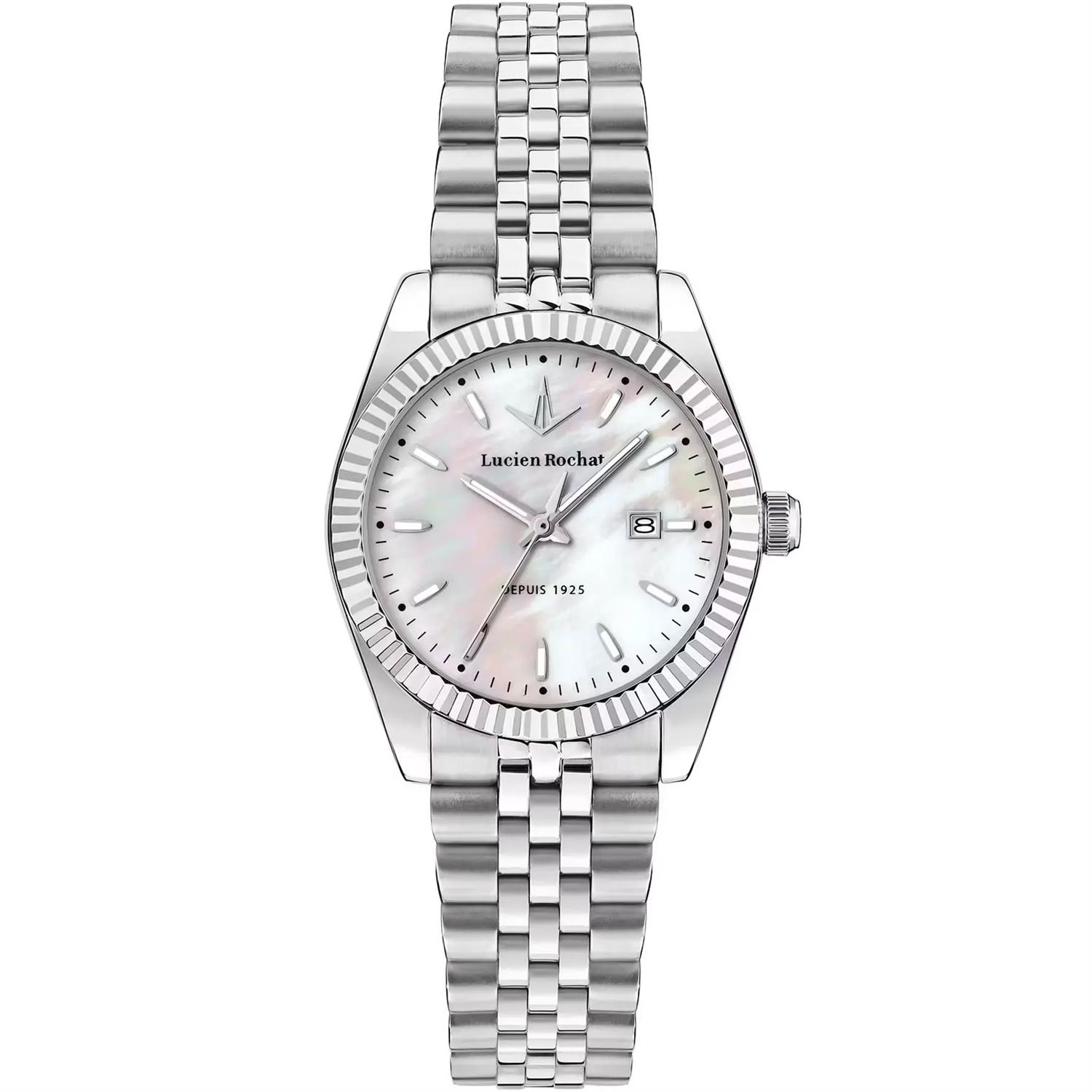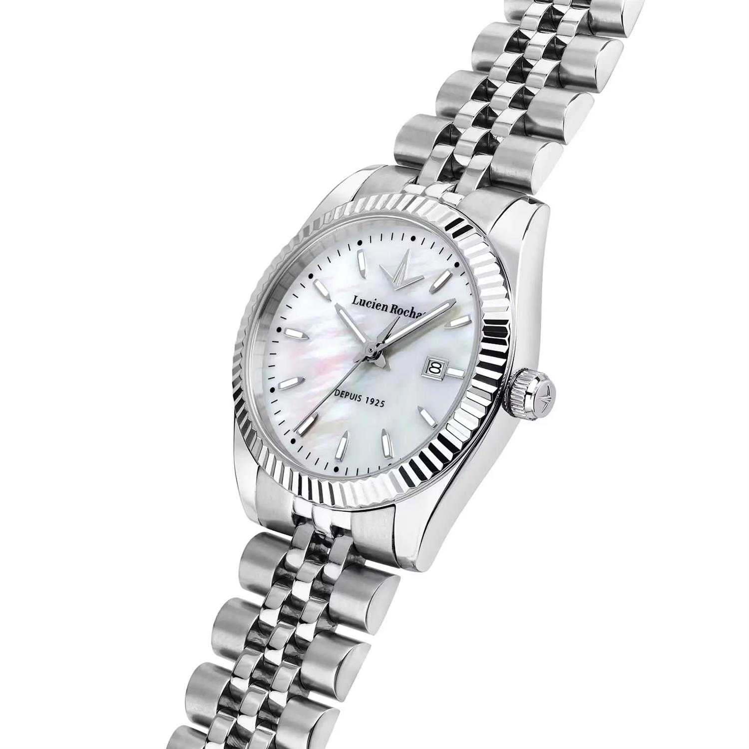 ساعت مچی زنانه لوسین روشا lucian rochat با طراحی کلاسیک بند استیل / قاب استیل صفحه سفید صدفی با شیشه ضد خراش وقابلیت داشتن تقویم / شب نما و موتور ژاپنی با انرژی باتری و مقاوم در برابر آب تا عمق 50 متر به همراه گارانتی بین المللی