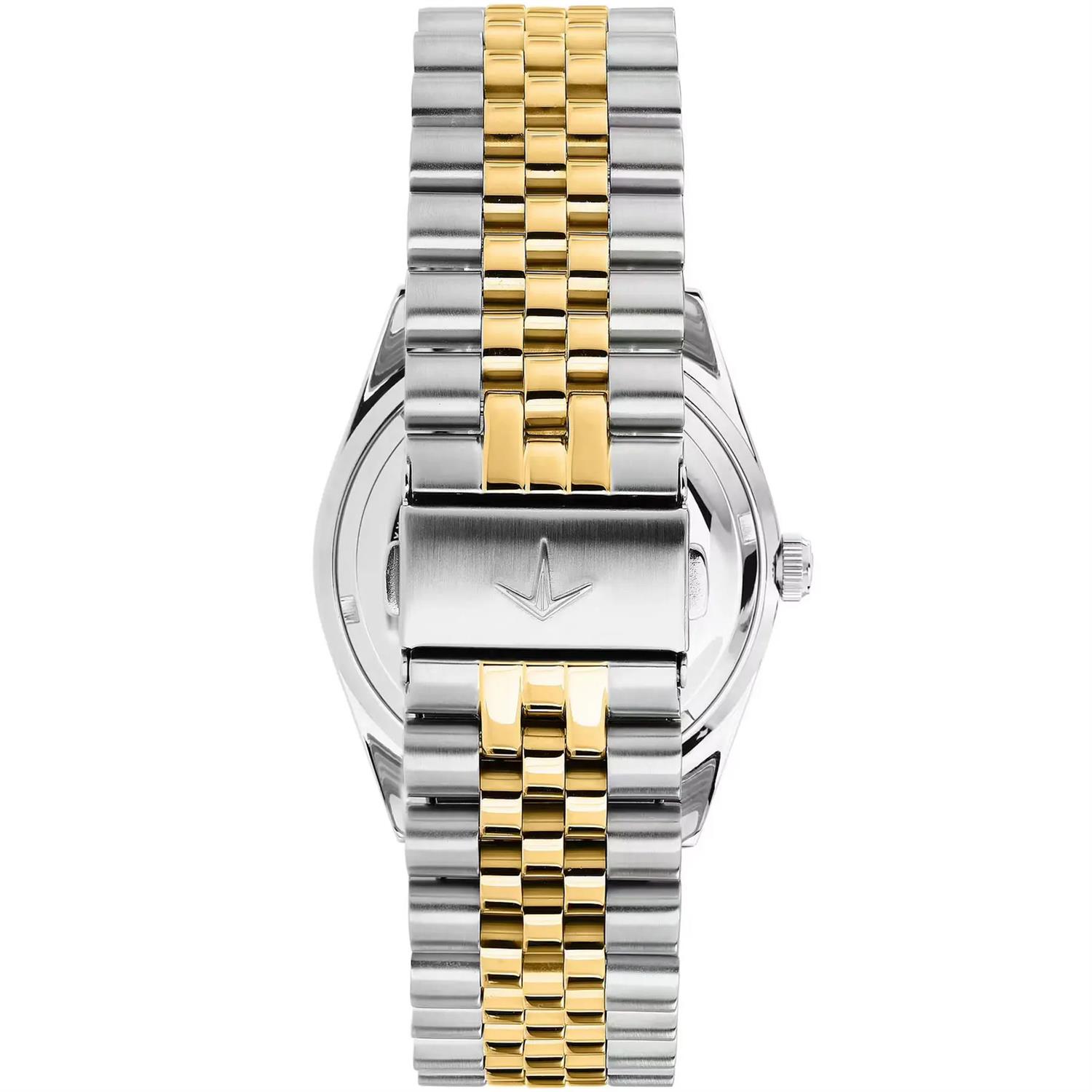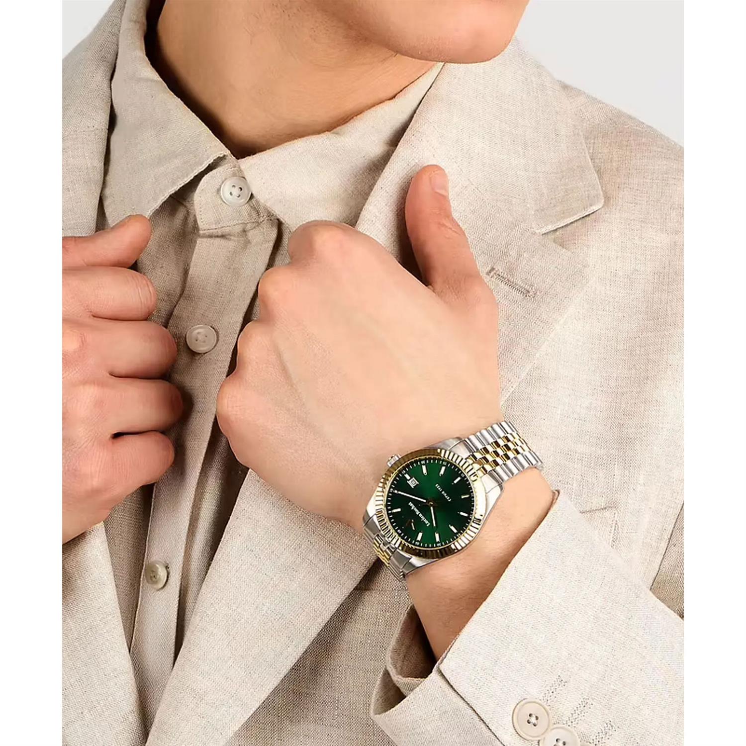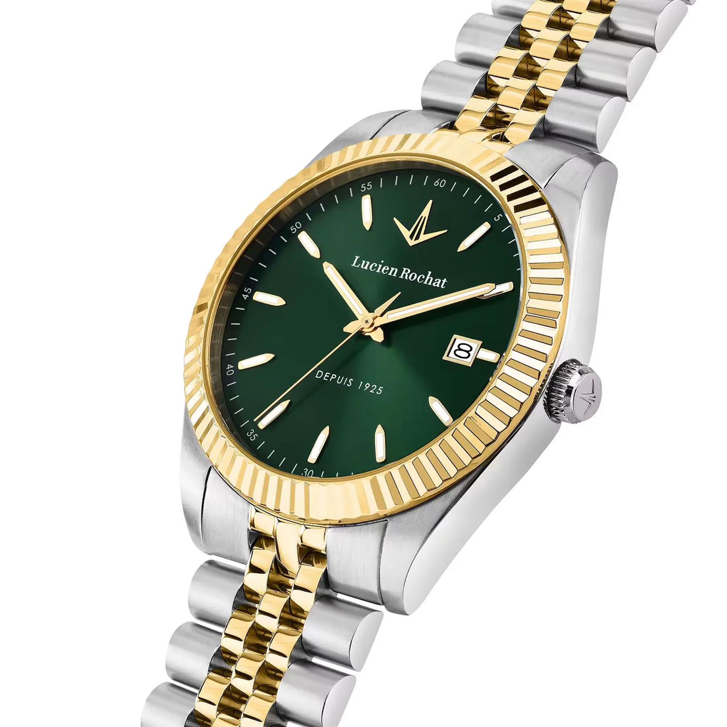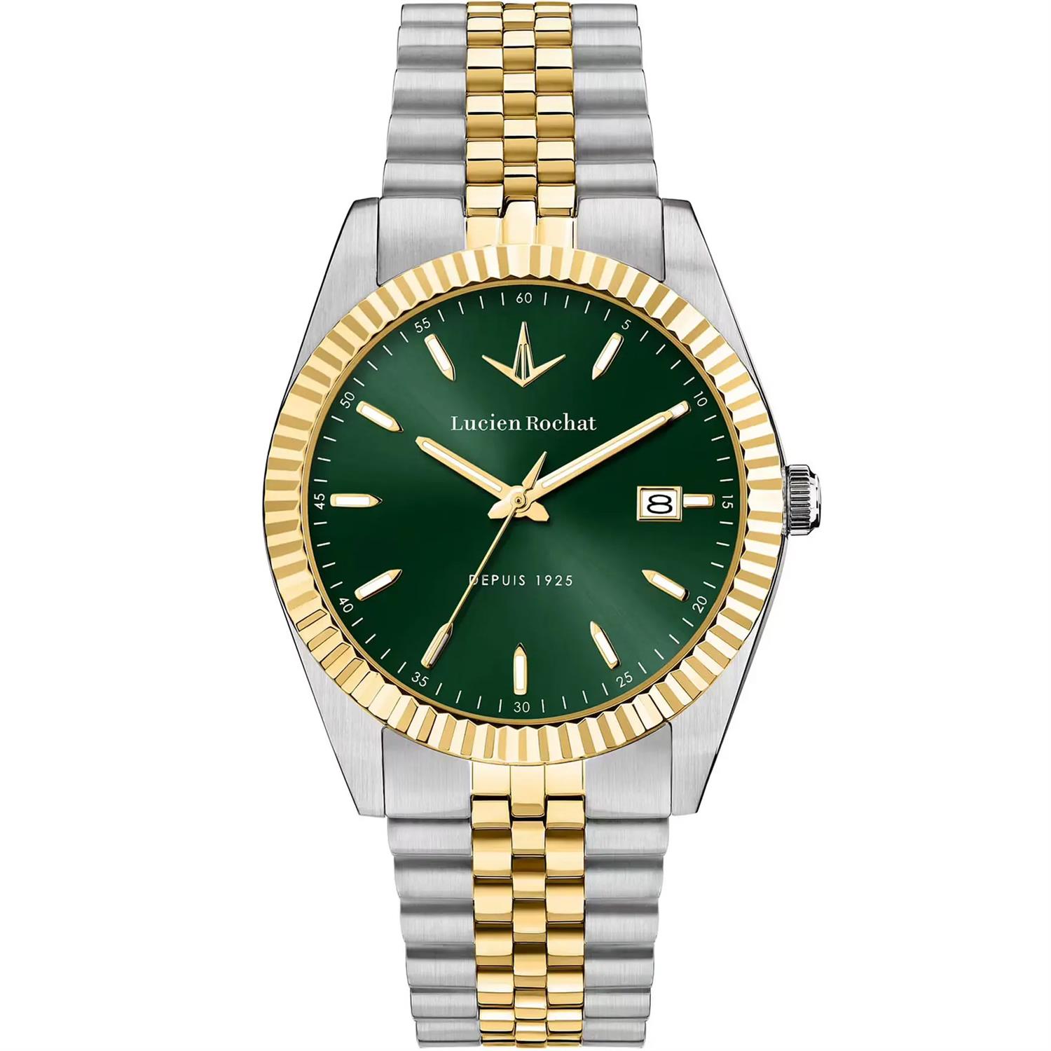 ساعت مچی مردانه لوسین روشا lucian rochat با طراحی روزانه بند استیل طلایی و قاب گرد طلایی استیل و صفحه گرد سبز با قابلیت تقویم /شب نما و موتور ژاپنی با انرژی باتری و مقاوم در برابر آب تا عمق 50 متر به همراه گارانتی بین المللی