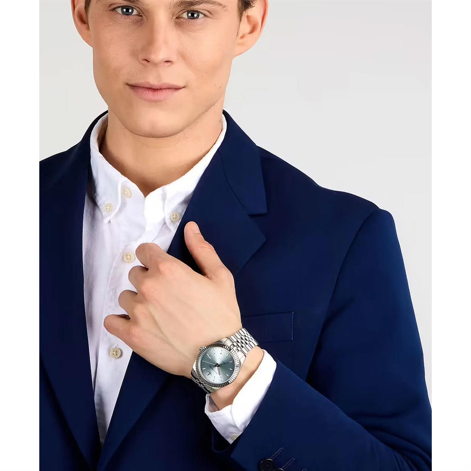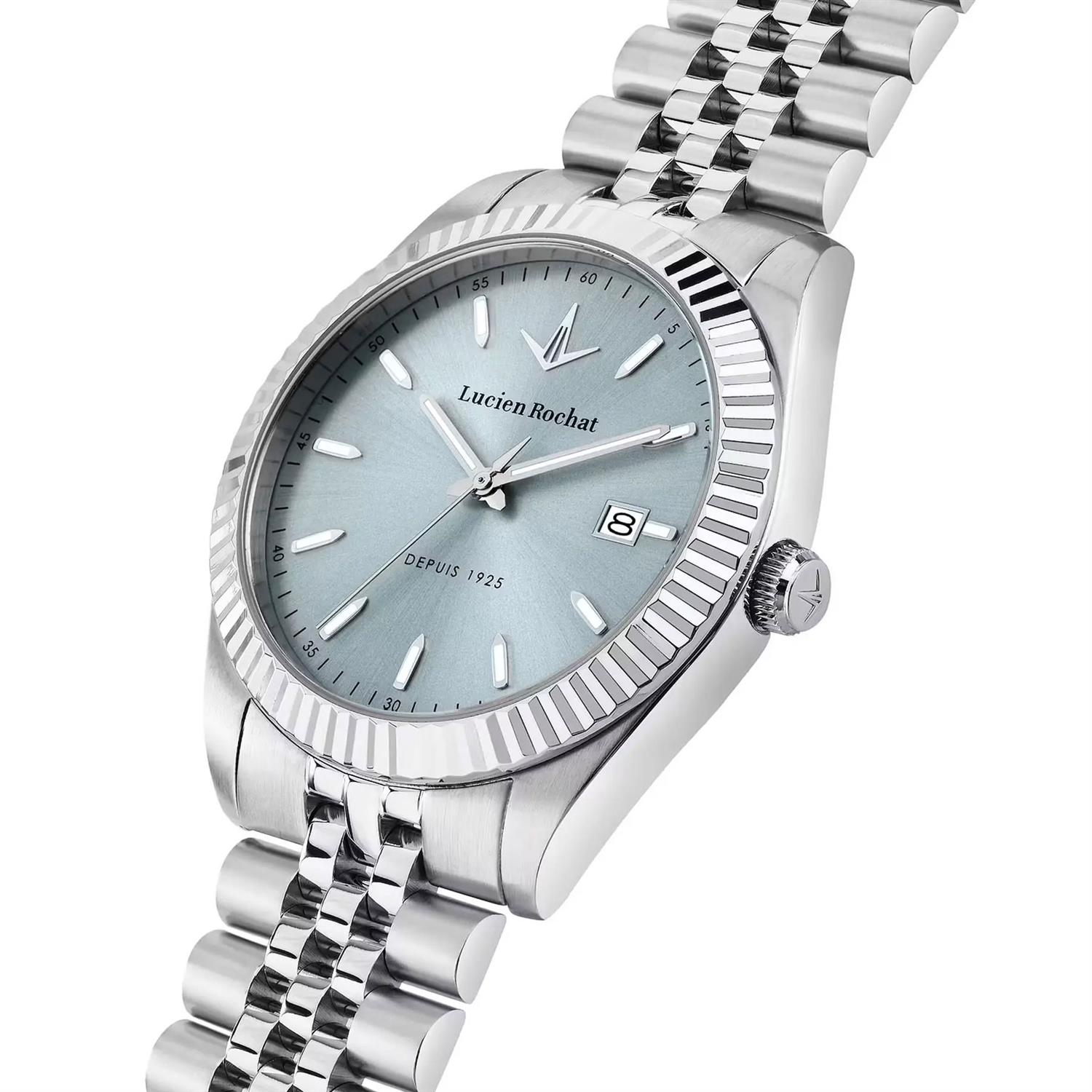ساعت مچی مردانه لوسین روشا lucian rochat با طراحی روزانه بند استیل و قاب گرد استیل و صفحه گرد نقره ای با قابلیت تقویم /شب نما و موتور ژاپنی با انرژی باتری و مقاوم در برابر آب تا عمق 50 متر به همراه گارانتی بین المللی