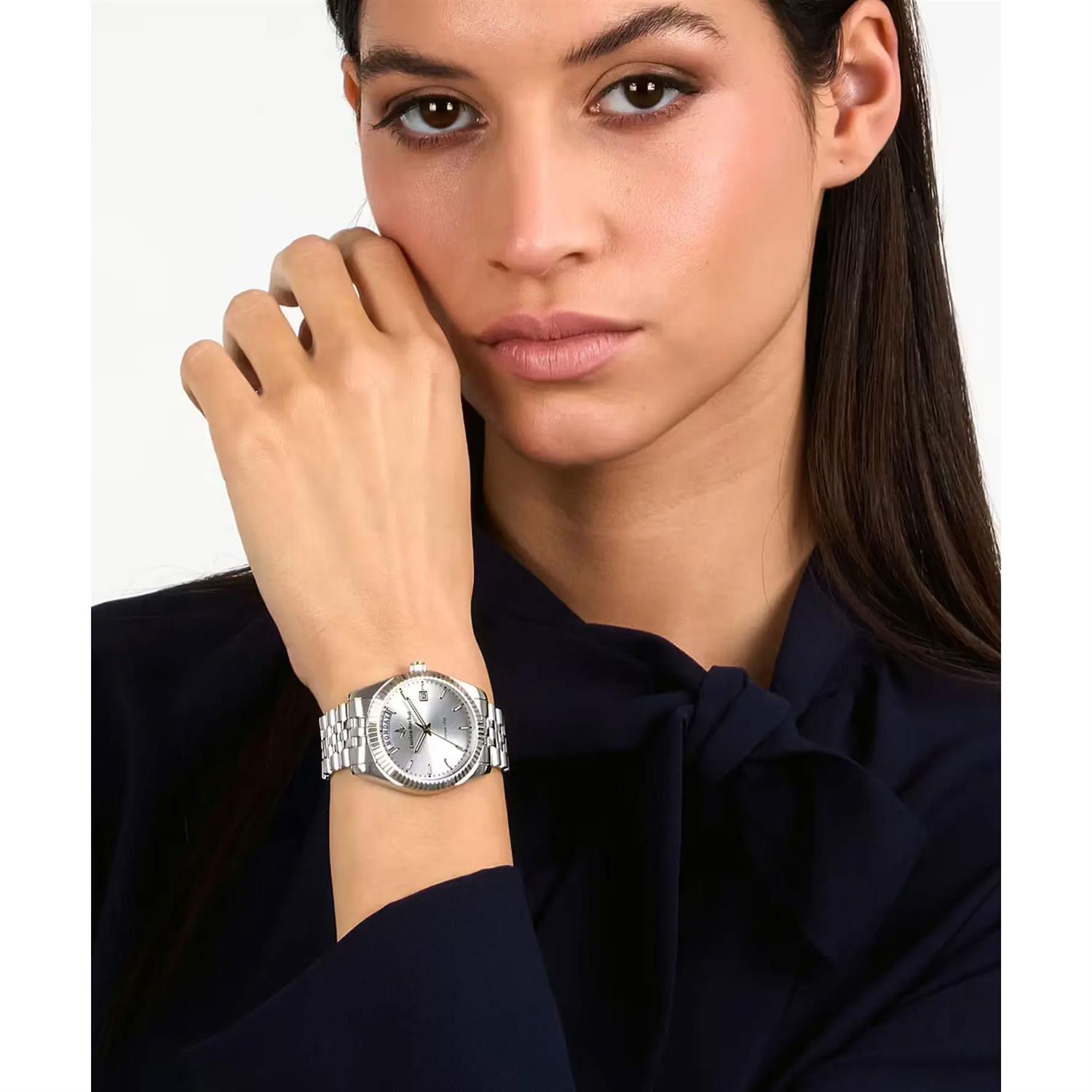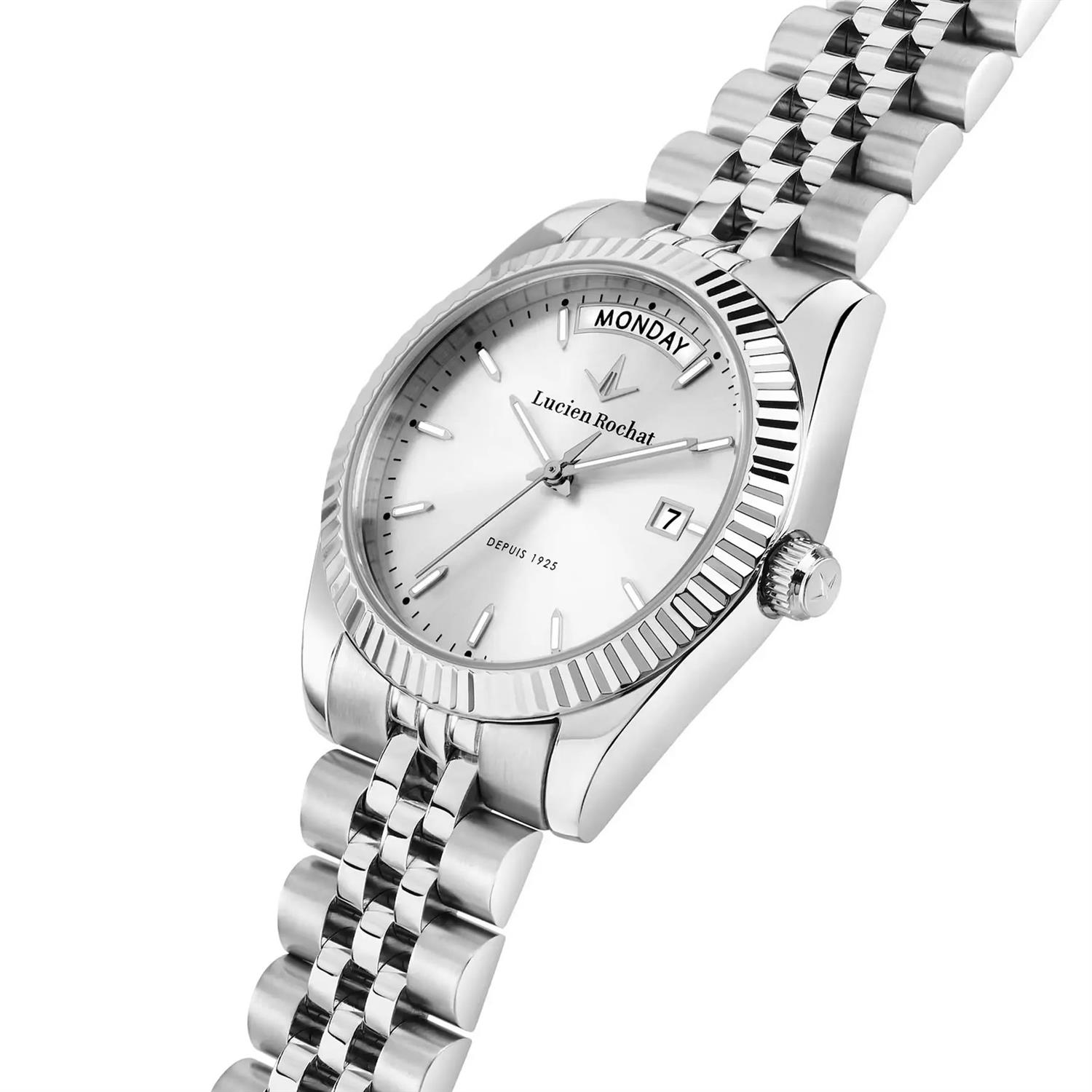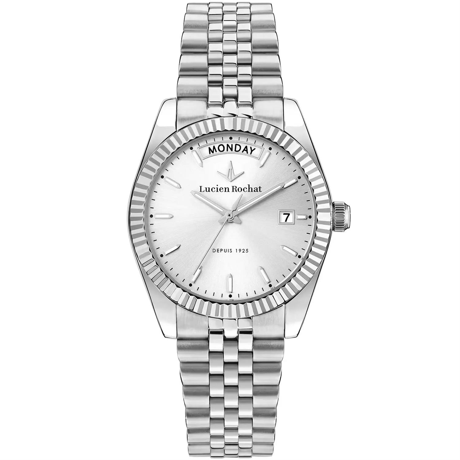 ساعت مچی زنانه لوسین روشا lucian rochat با طراحی کلاسیک بند استیل / قاب گرد استیل و صفحه نقره ای با شیشه ضد خراش و موتور ژاپنی با انرژی باتری و قابلیت داشتن تقویم / شب نما / روزهای هفته و مقاوم در برابر آب تا عمق 50 متر به همراه گارانتی بین المللی