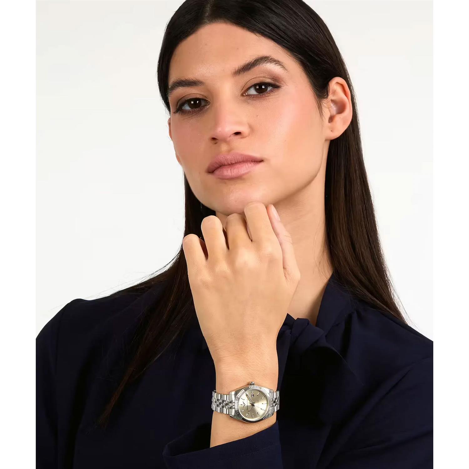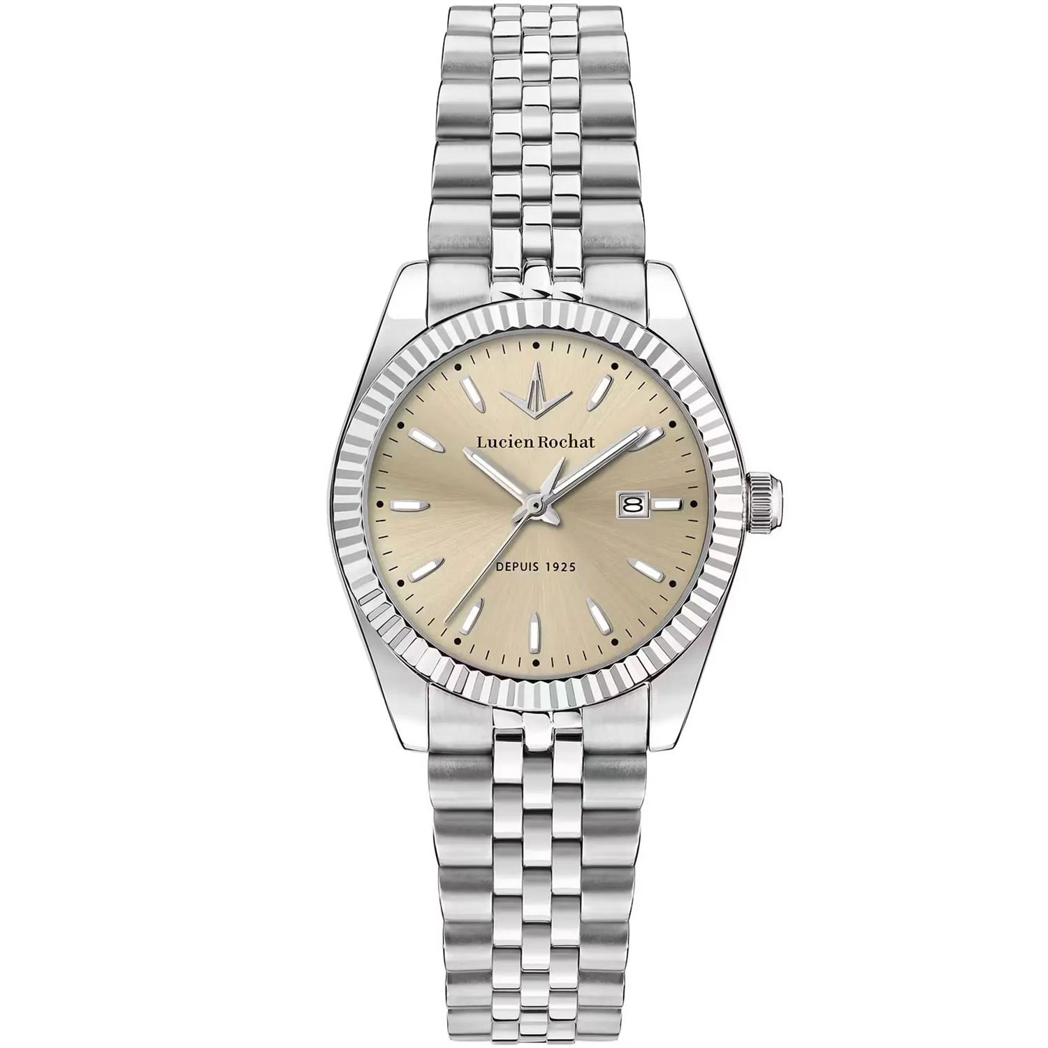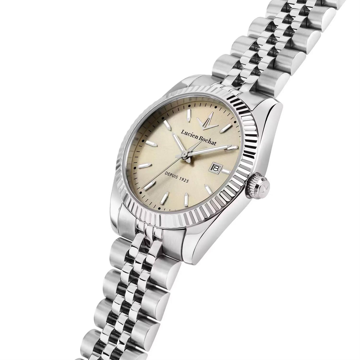 ساعت مچی زنانه لوسین روشا lucian rochat با طراحی کلاسیک بند استیل / قاب گرد استیل صفحه کرم با قابلیت داشتن تقویم /شب نما و موتور ژاپنی با انرژی باتری و مقاوم در برابر آب تا عمق 30 متر به همراه گارانتی بین المللی
