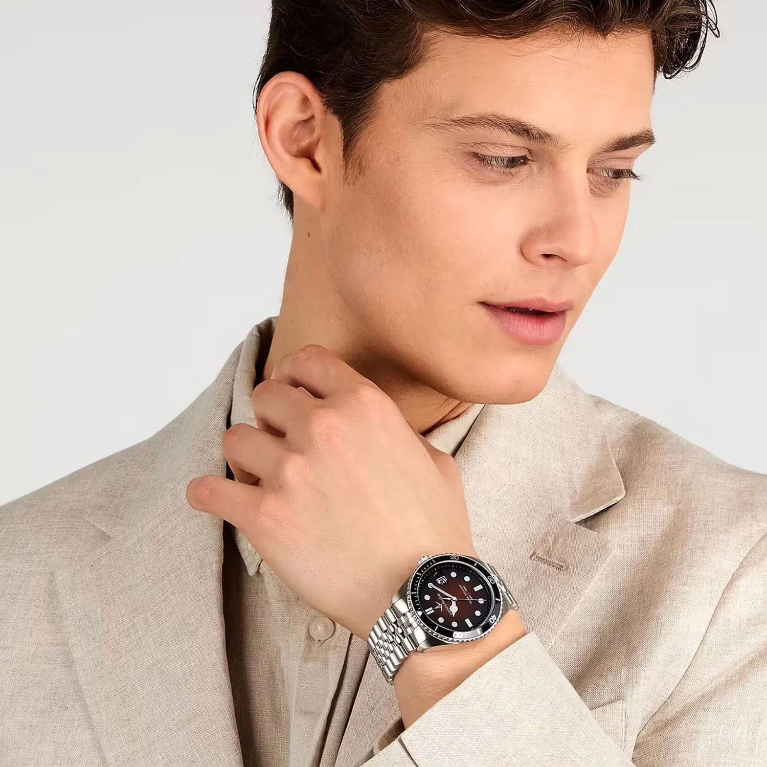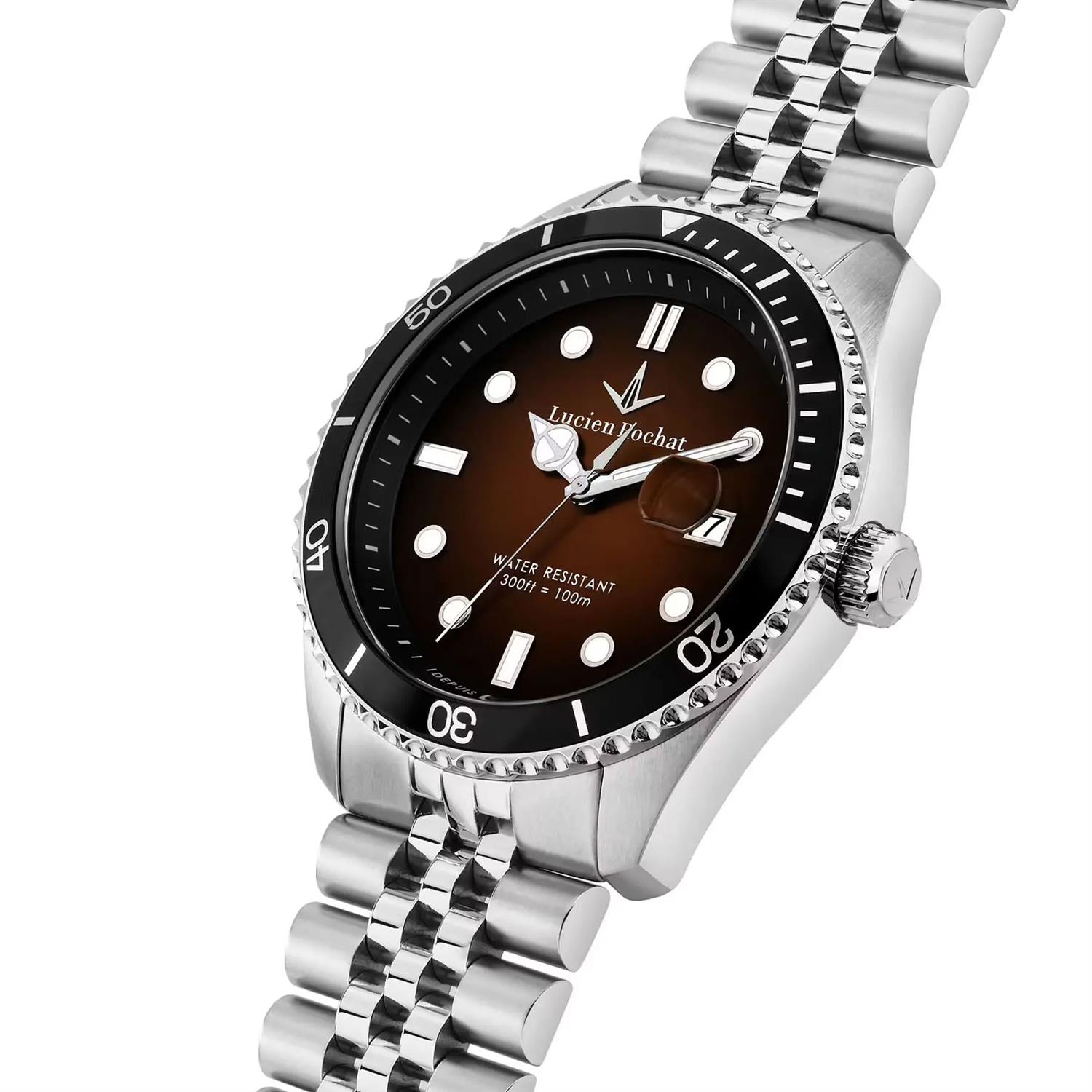 ساعت مچی مردانه لوسین روشا lucian rochat با طراحی روزانه بند استیل و قاب گرد سرمه ای استیل و صفحه گرد قهوه ای با قابلیت تقویم /شب نما/ زه چرخان و موتور ژاپنی با انرژی باتری و مقاوم در برابر آب تا عمق 100 متر به همراه گارانتی بین المللی
