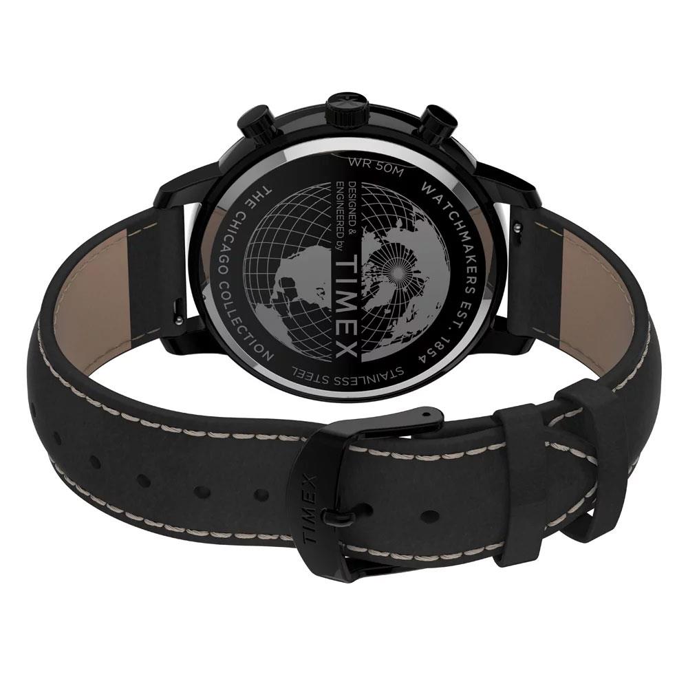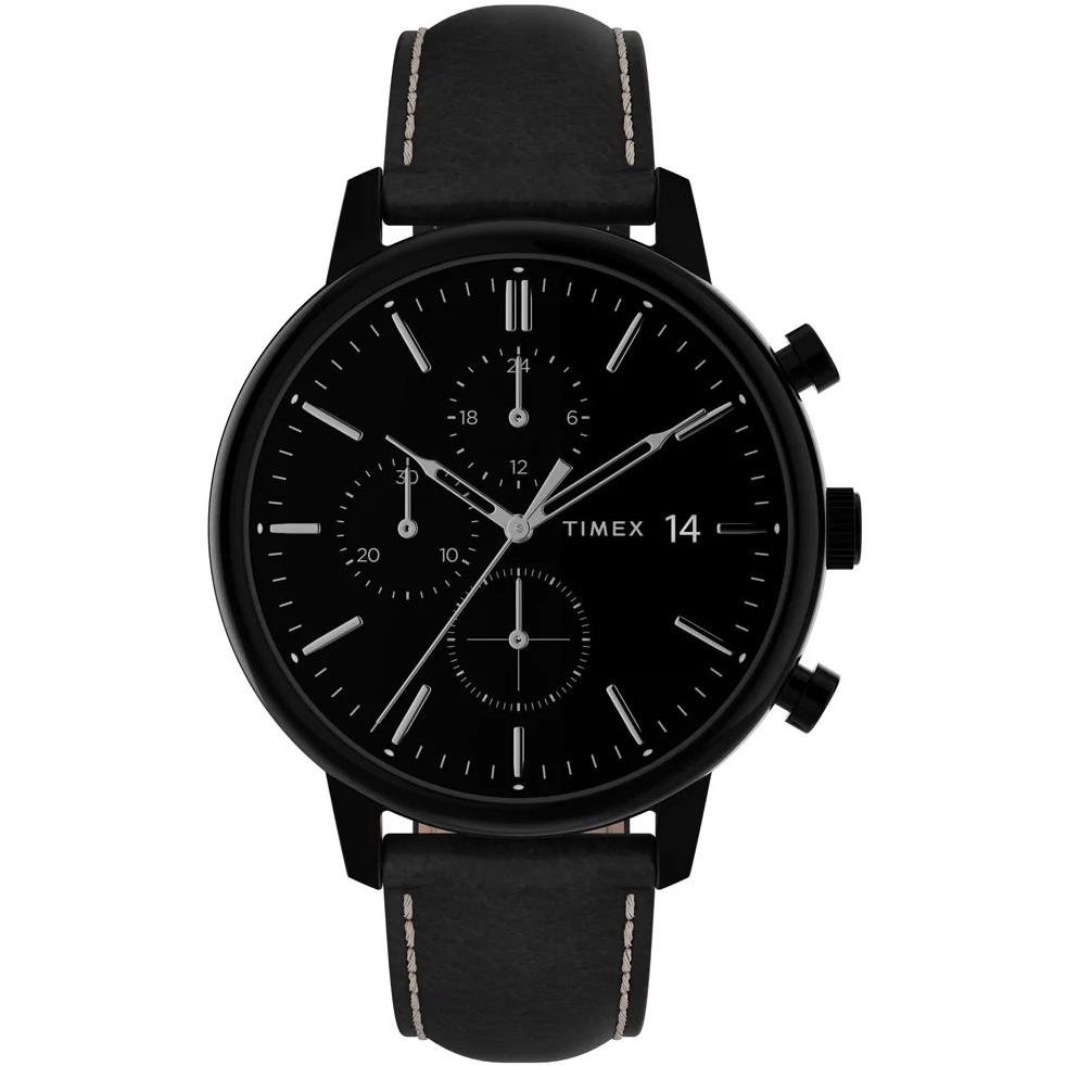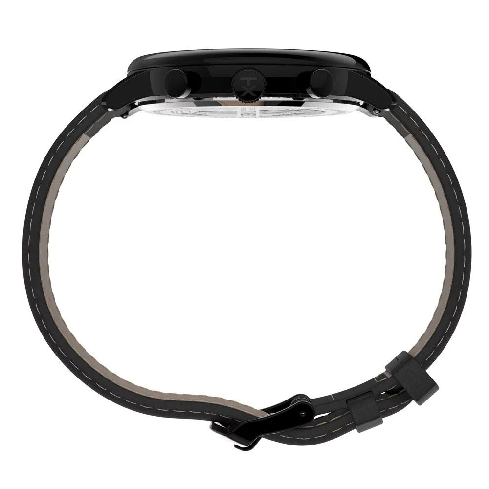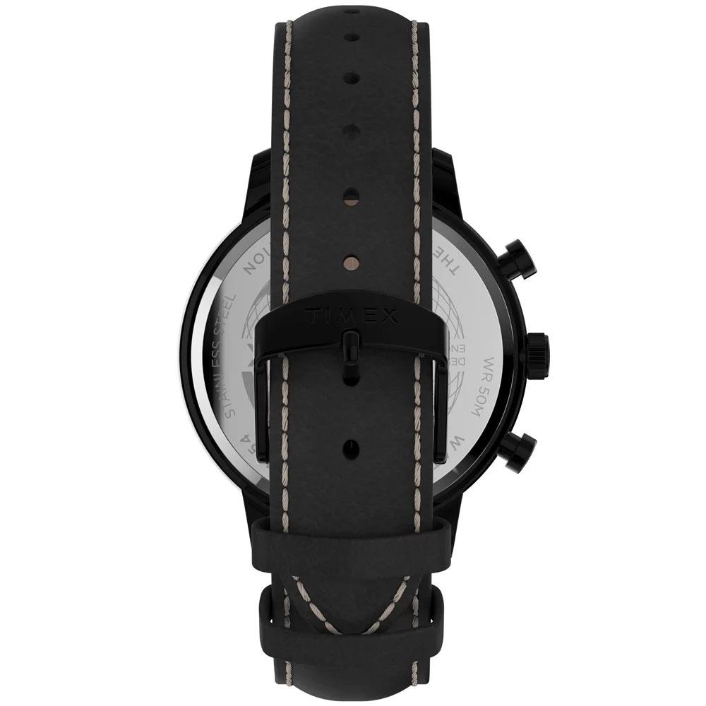 ساعت مچی مردانه تایمکس timex با طراحی اسپرت بند چرمی مشکی و قاب گرد مشکی با صفحه مشکی و قابلیت داشتن تقویم / کرنوگراف و موتوراکودرایو ژاپنی و مقاوم در برابر آب تا عمق 50 متر به همراه گارانتی بین المللی