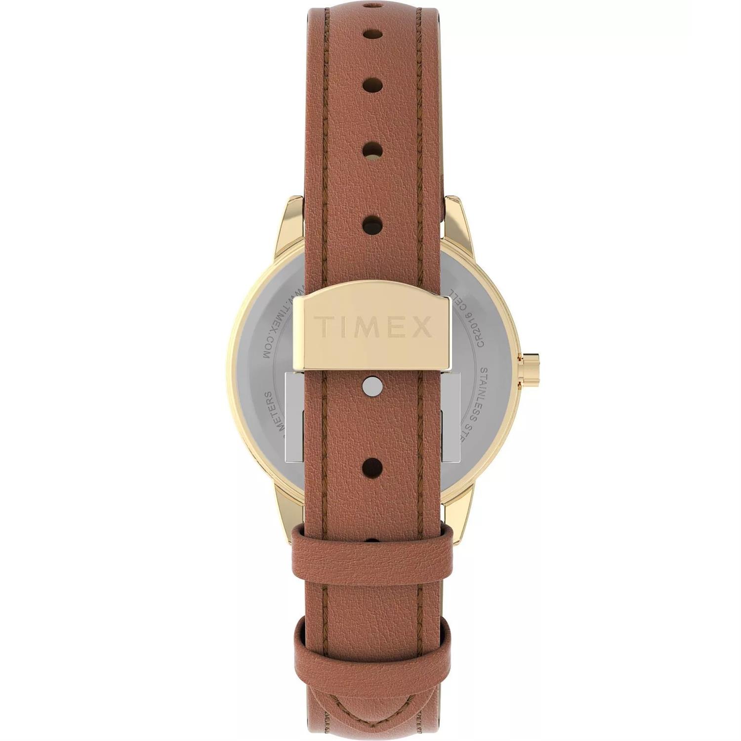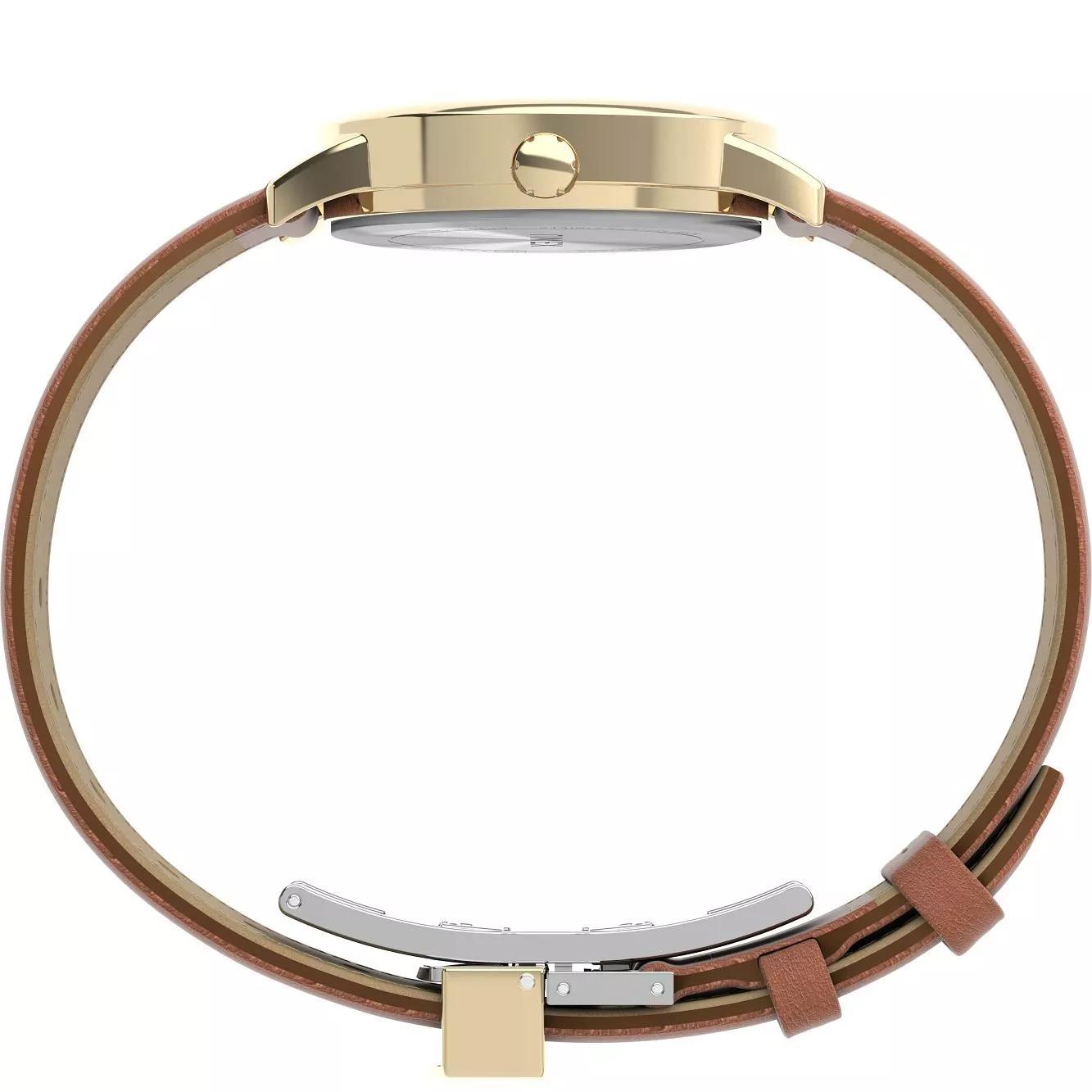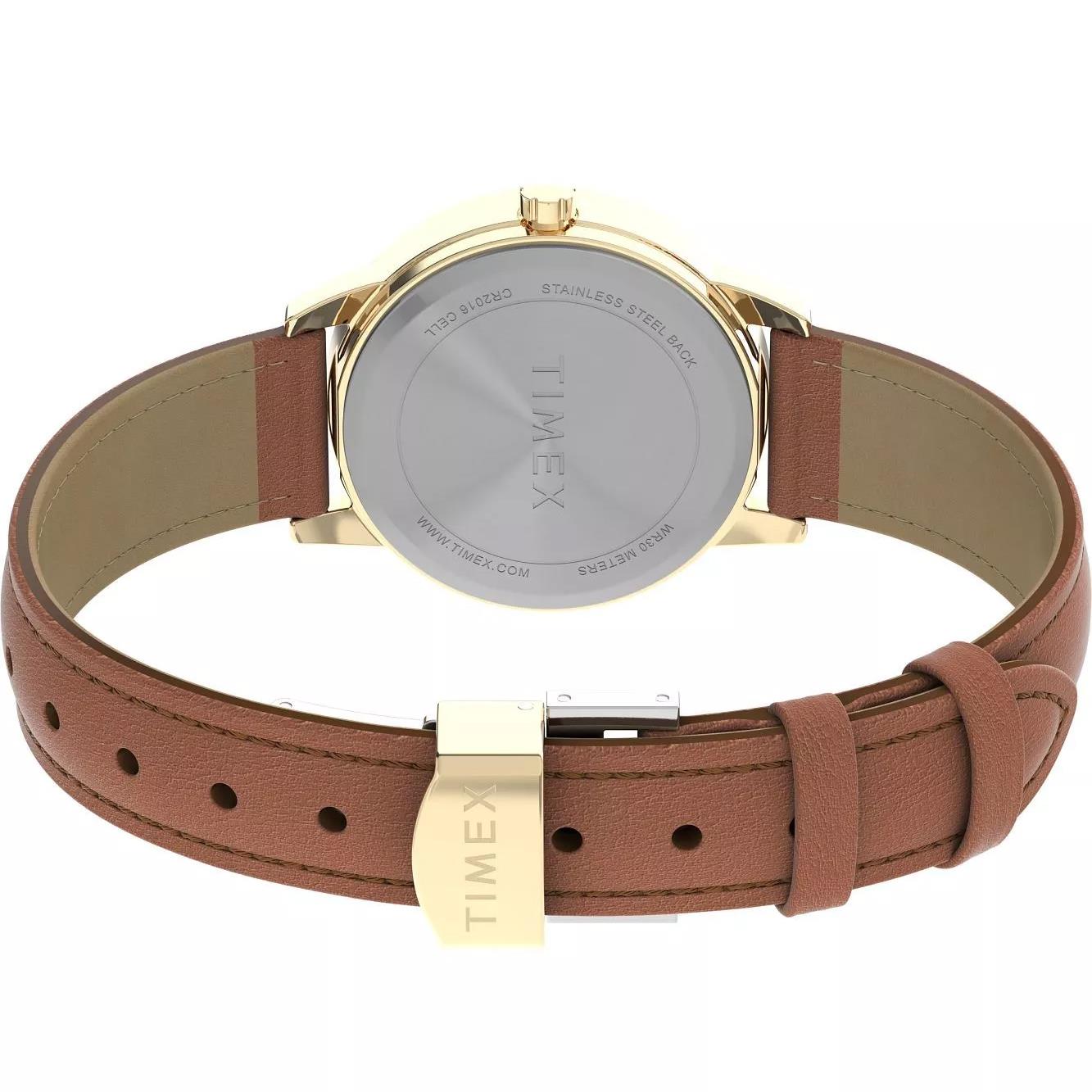 ساعت مچی زنانه تایمکس timex با طراحی کلاسیک بند چرمی قهوه ای و قاب گرد طلایی با صفحه گرد طلایی و موتور ژاپنی با انرژی باطری و مقاوم در برابر آب تا عمق 30 متر به همراه گارانتی بین المللی