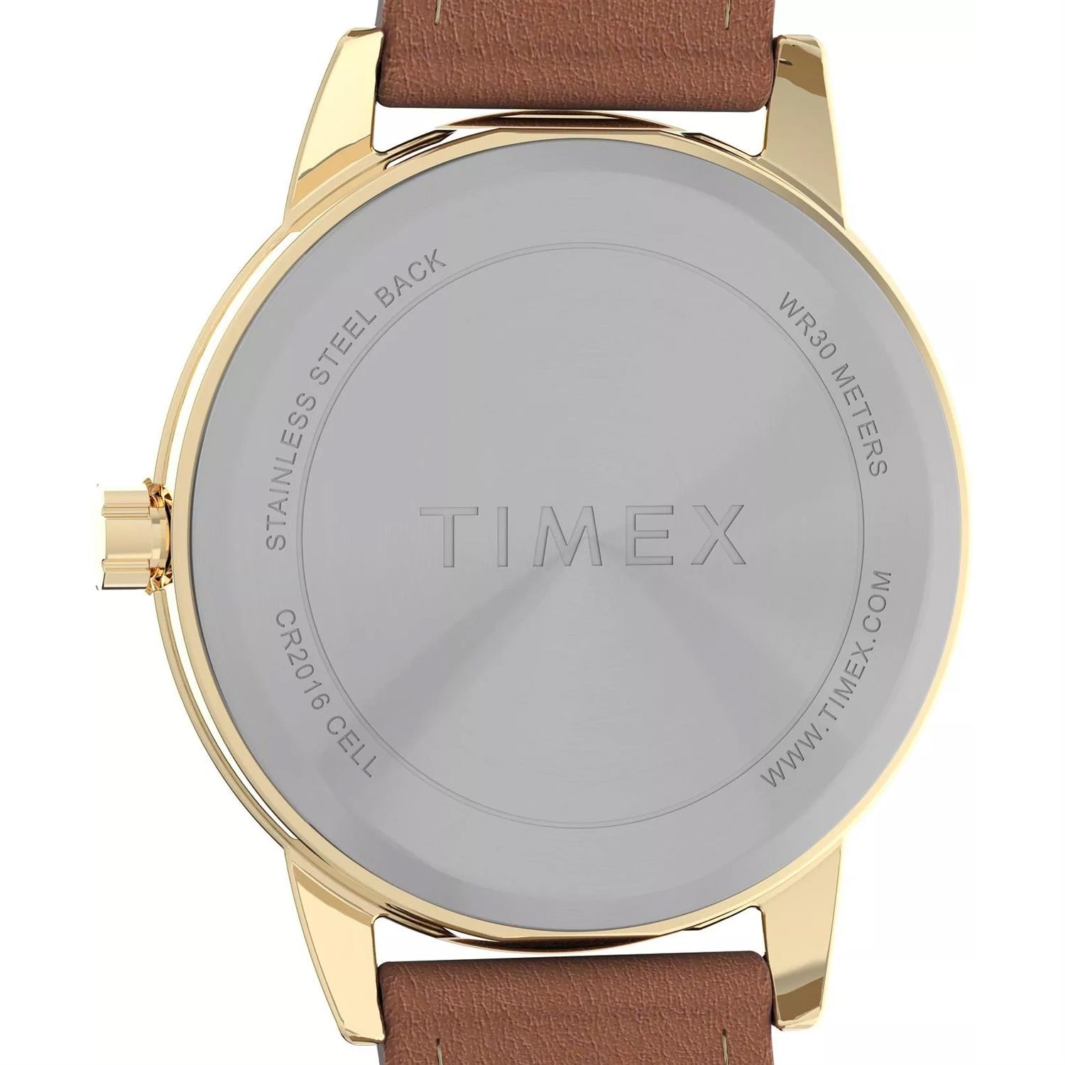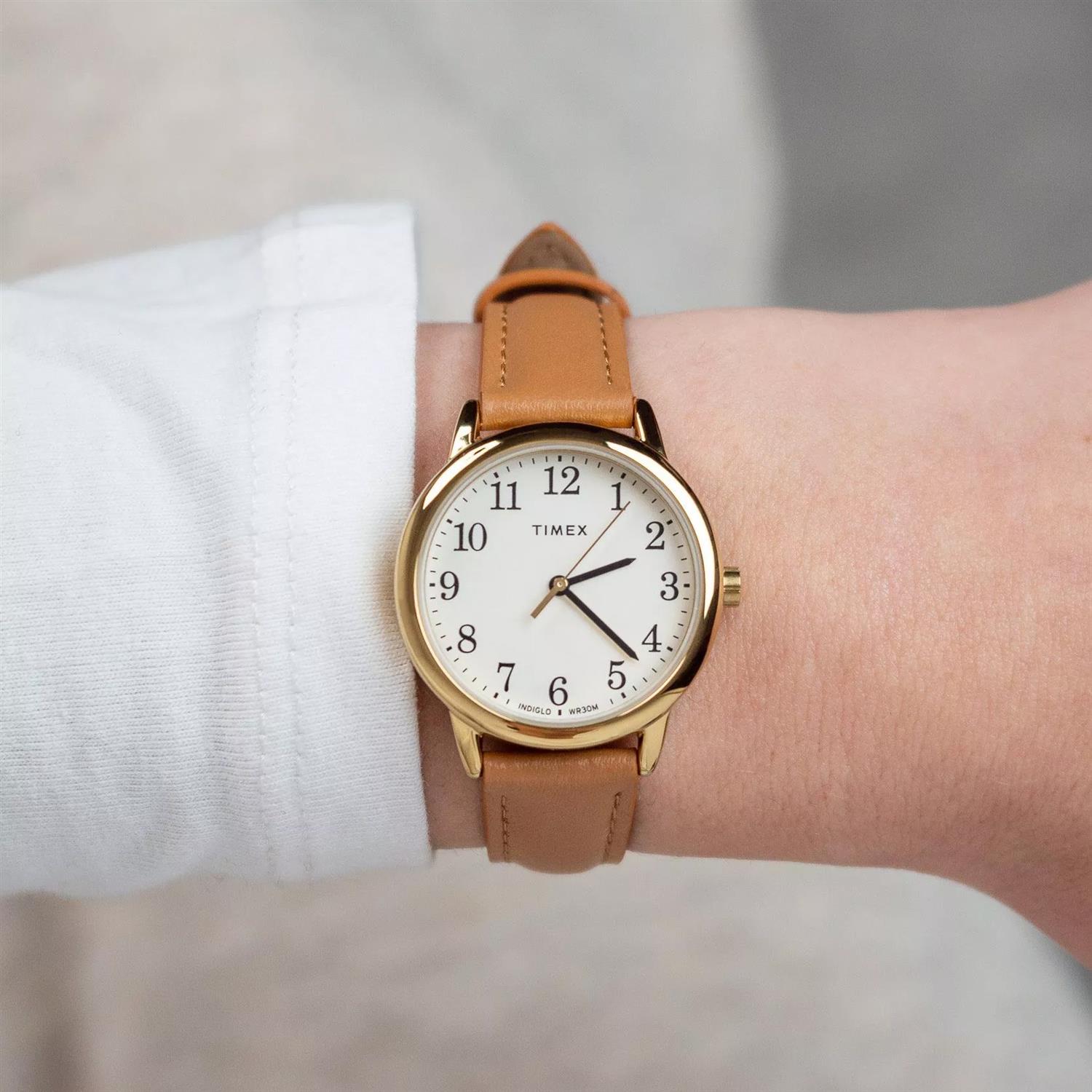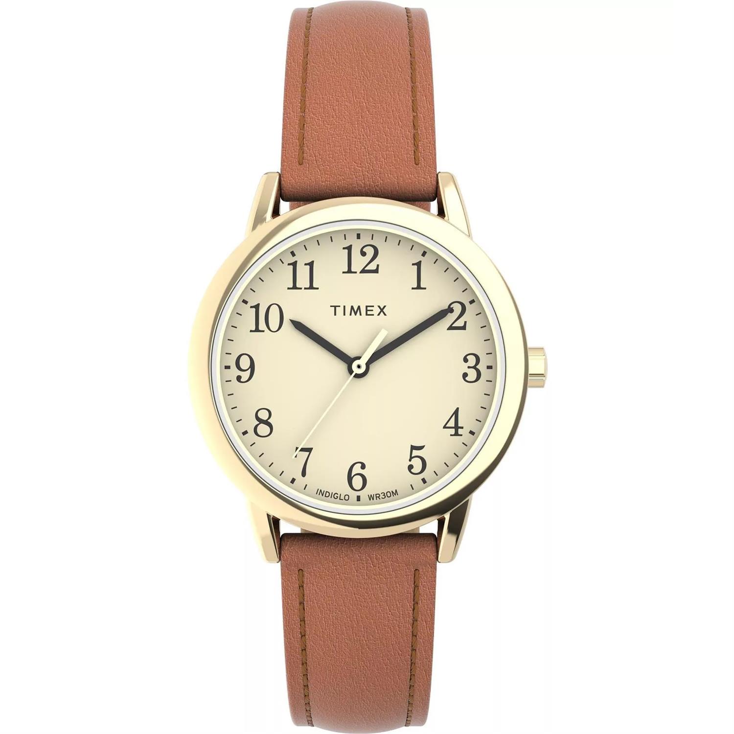 ساعت مچی زنانه تایمکس timex با طراحی کلاسیک بند چرمی قهوه ای و قاب گرد طلایی با صفحه گرد طلایی و موتور ژاپنی با انرژی باطری و مقاوم در برابر آب تا عمق 30 متر به همراه گارانتی بین المللی