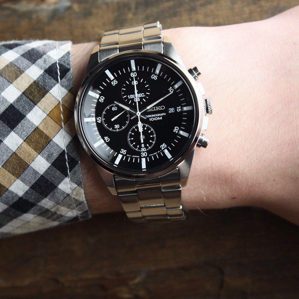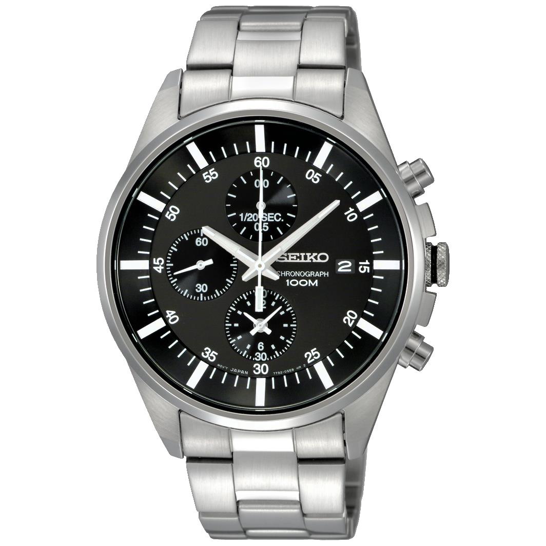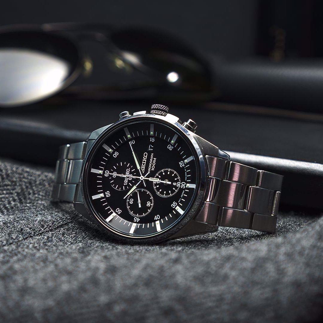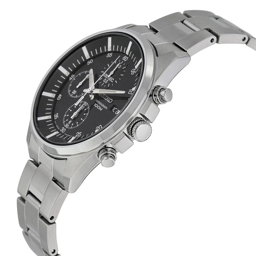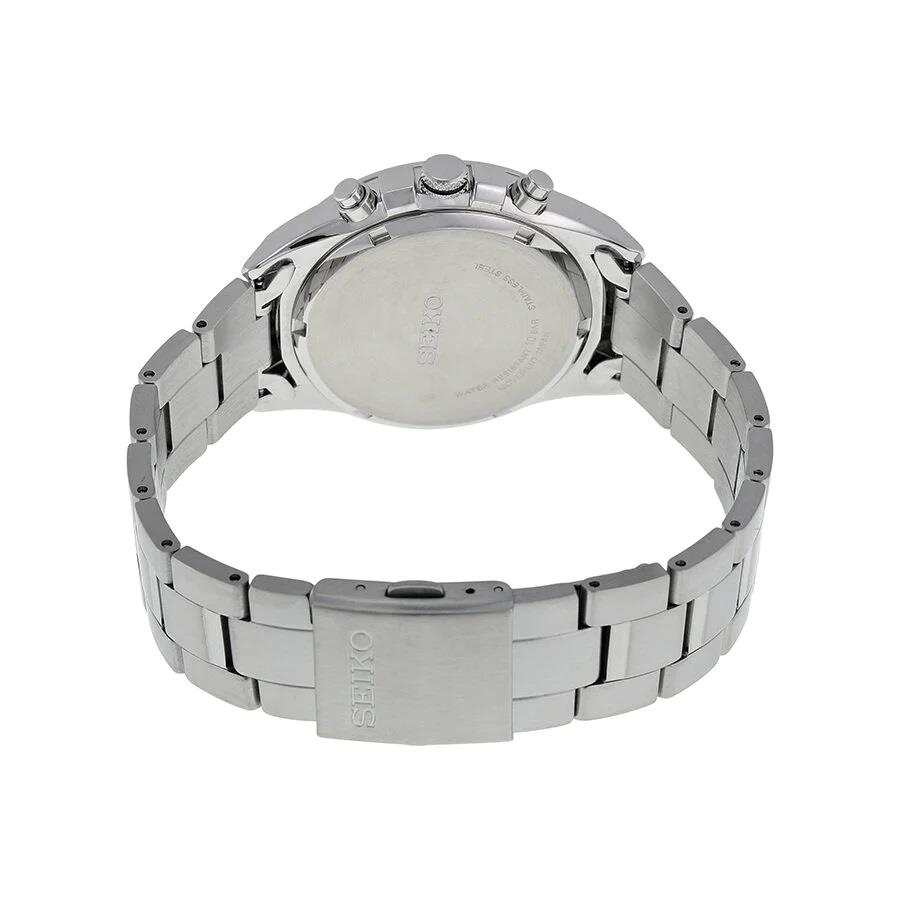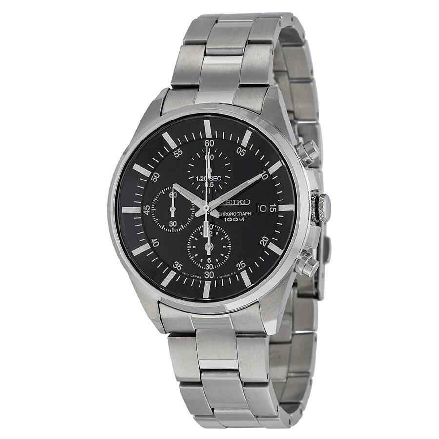 ساعت مچی مردانه سیکو seiko با طراحی روزانه بند استیل, قاب گرد استیل و صفحه گرد مشکی و قابلیت داشتن تقویم کرنوگراف شبنما و موتور ژاپنی با انرژی باتری و مقاوم در برابر آب تا عمق 100 متر به همراه گارانتی بین المللی