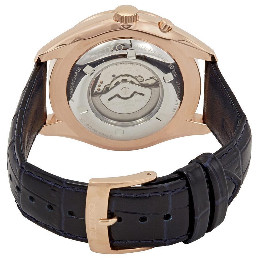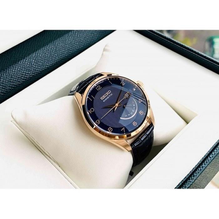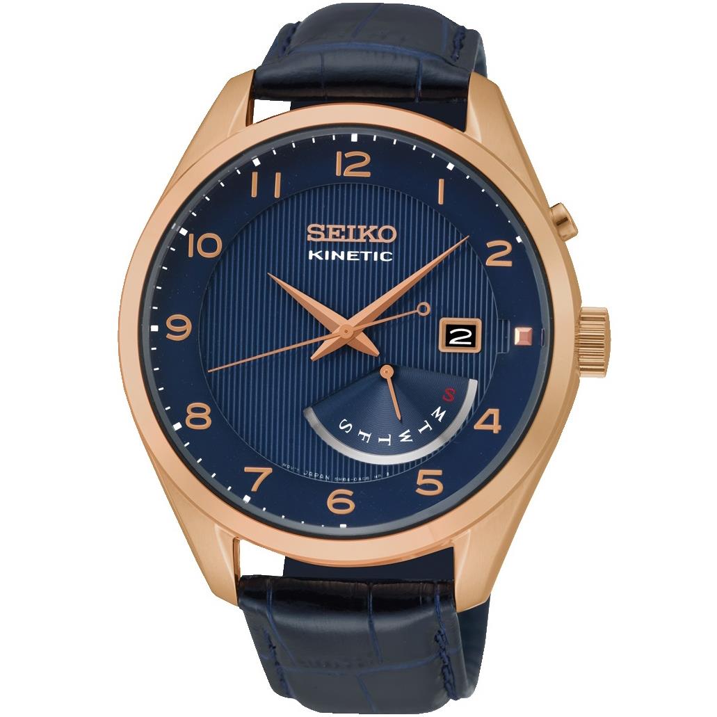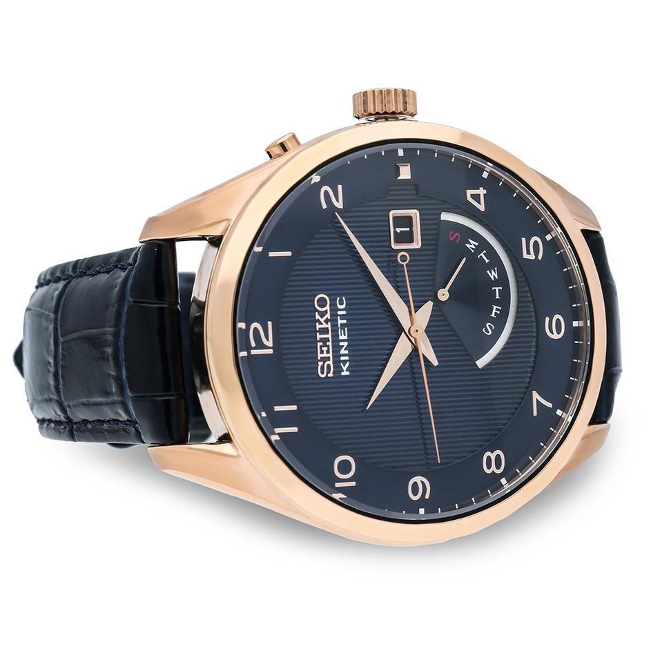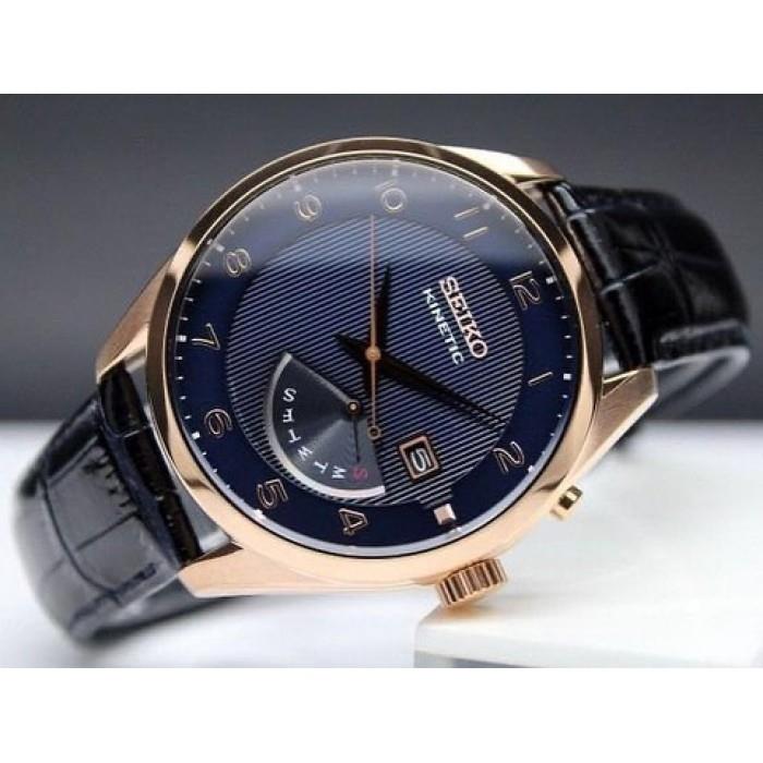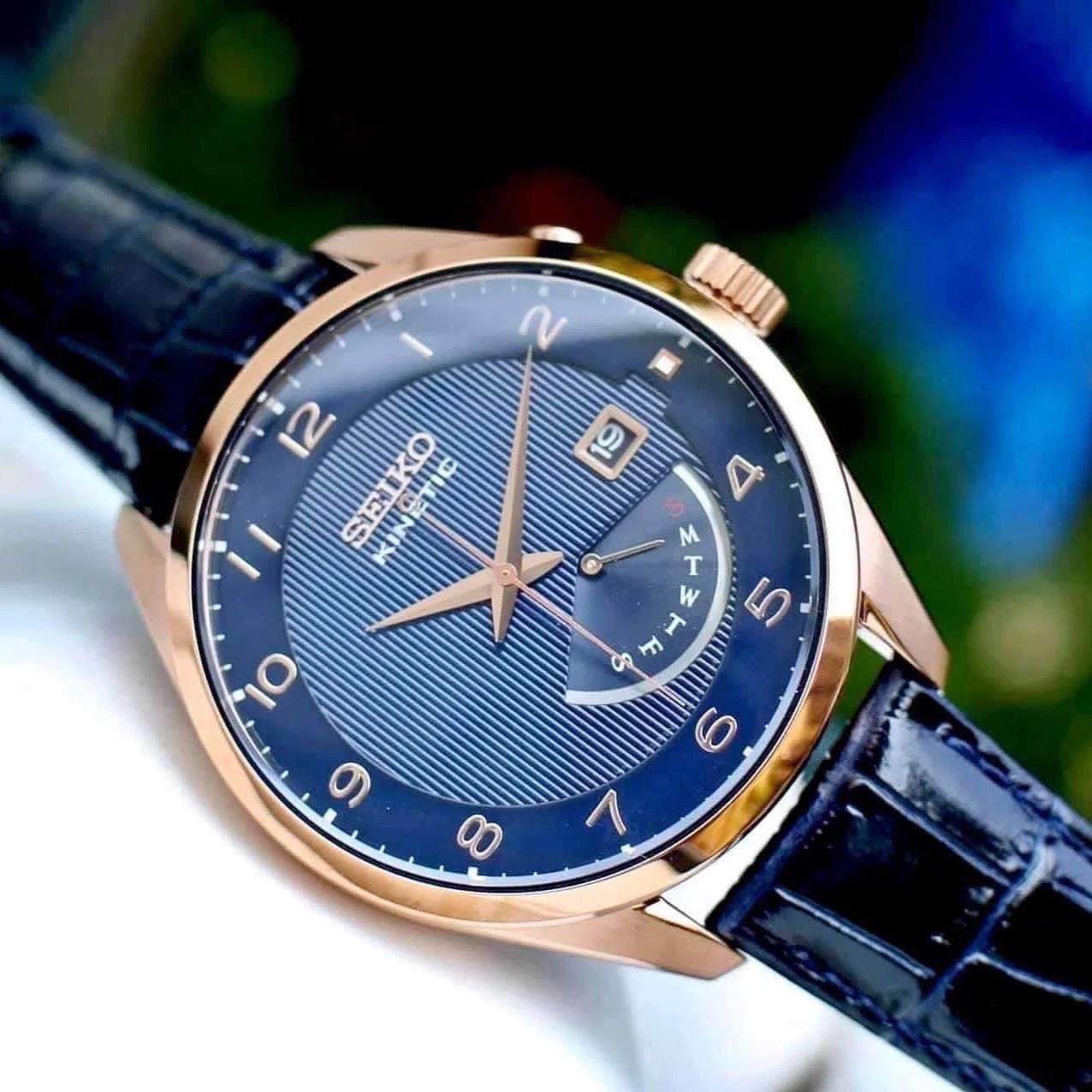 ساعت مچی مردانه سیکو seiko با طراحی روزانه بند چرمی , قاب گرد مسی و صفحه گرد سرمه ای و قابلیت داشتن تقویم / روزهای هفته و موتورکنتیک ژاپنی و مقاوم در برابر آب تا عمق 100 متر به همراه گارانتی بین المللی