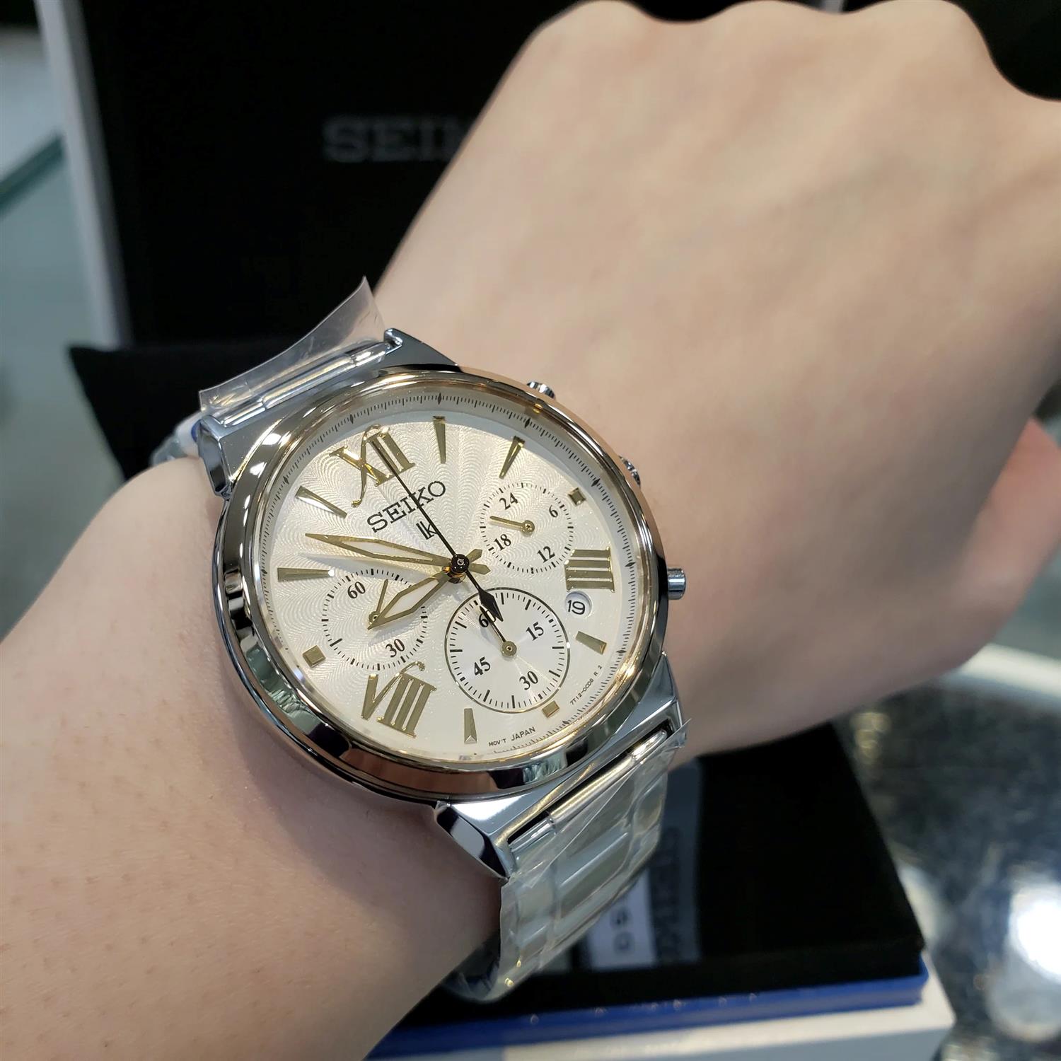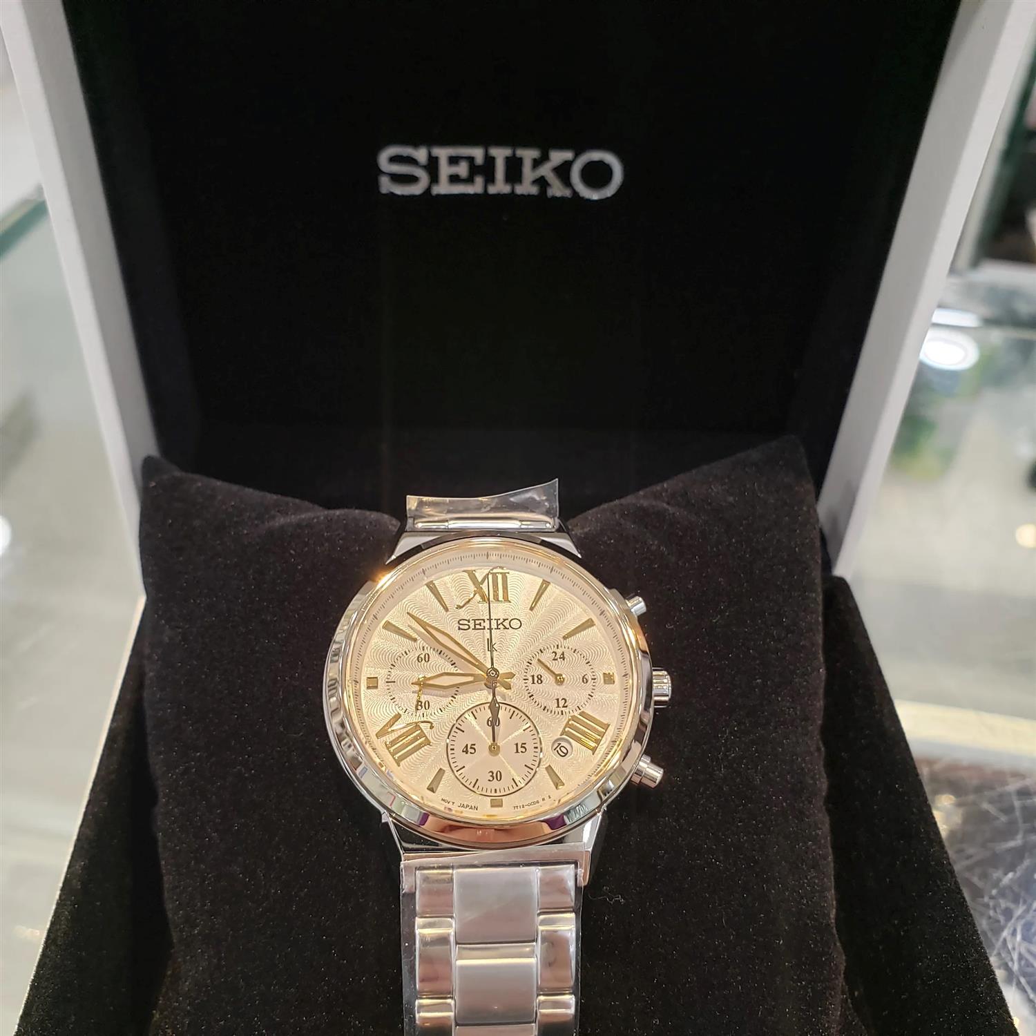 ساعت مچی زنانه سیکو SEIKO با طراحی کلاسیک بند استیل با قاب طلایی استیل و صفحه گرد سفید با شیشه ضد خراش و قابلیت داشتن تقویم / شب نما / کرنوگراف و موتور ژاپنی با انرژی باتری و مقاومت در برابر آب تا عمق 100 متر به همراه دو سال گارانتی بین المللی