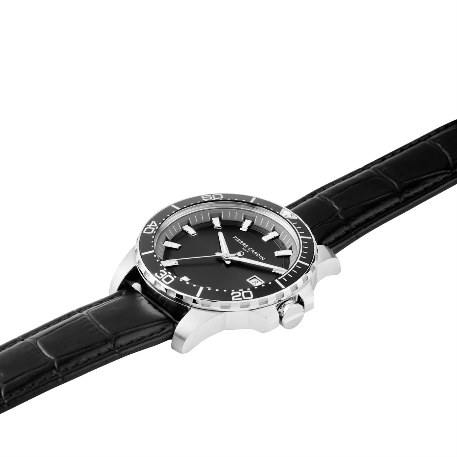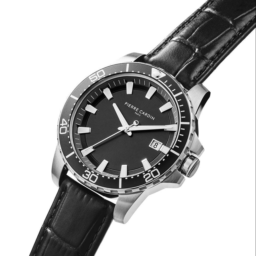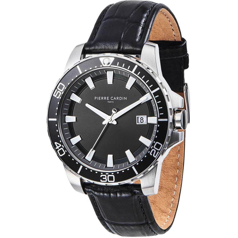 ساعت مچی مردانه پیرکاردین pierrecardin با طراحی روزانه بند چرمی  و قاب استیل مشکی و صفحه گرد مشکی با قابلیت داشتن تقویم / شب نما / زه چرخان و موتور ژاپنی و انرژی باتری و مقاومت در برابر آب تا عمق 50 متر به همراه دو سال گارانتی بین المللی