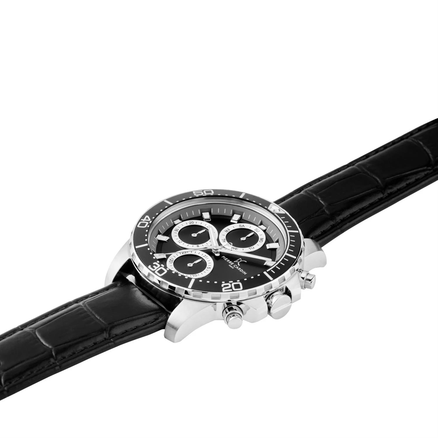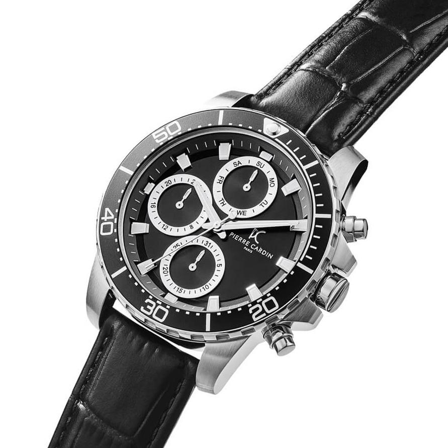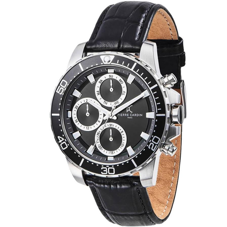 ساعت مچی مردانه پیرکاردین pierrecardin با طراحی روزانه بند چرمی  و قاب استیل مشکی و صفحه گرد مشکی با قابلیت داشتن تقویم / شب نما / روزهای هفته / روزوشب / زه چرخان و موتور ژاپنی و انرژی باتری و مقاومت در برابر آب تا عمق 50 متر به همراه دو سال گارانتی بین المللی
