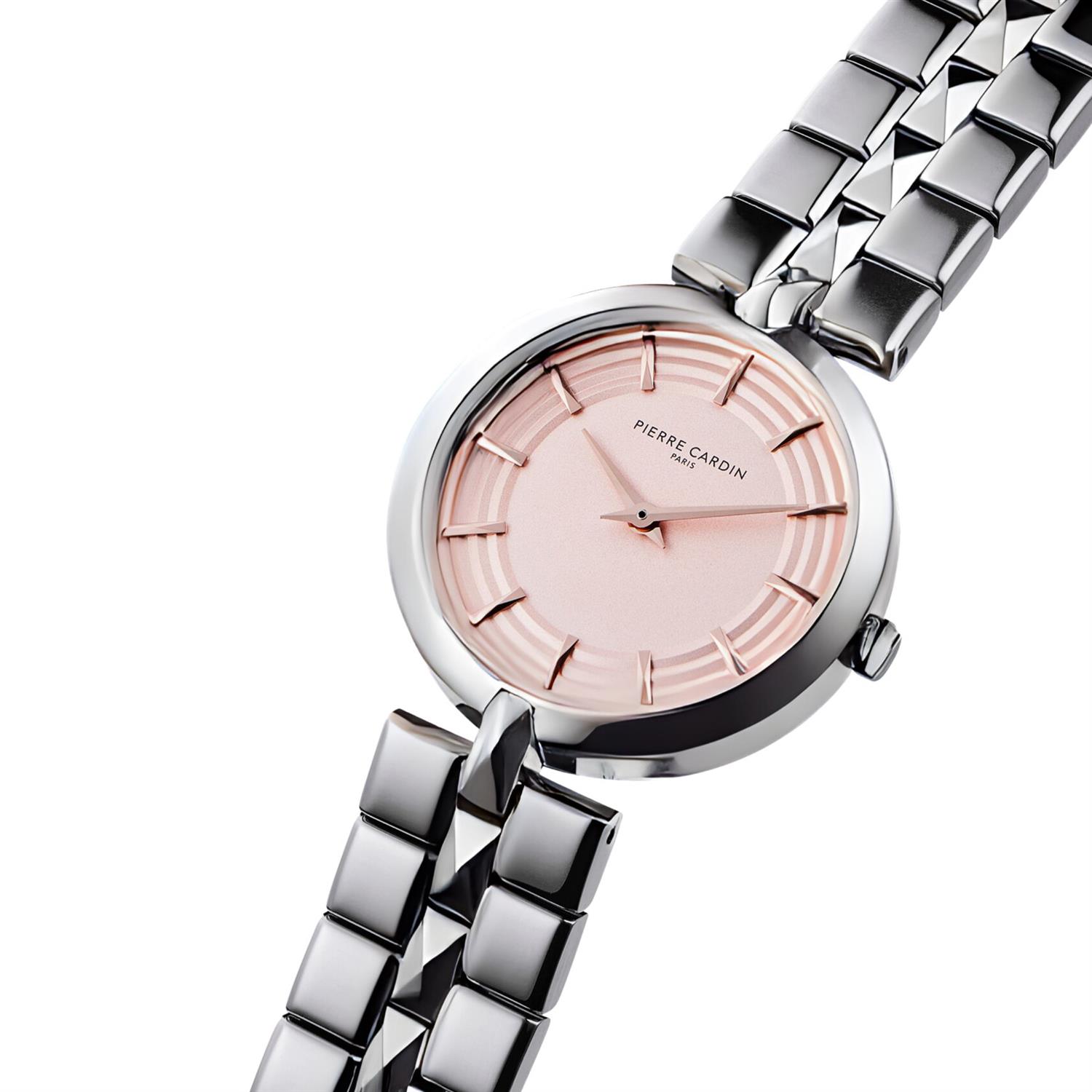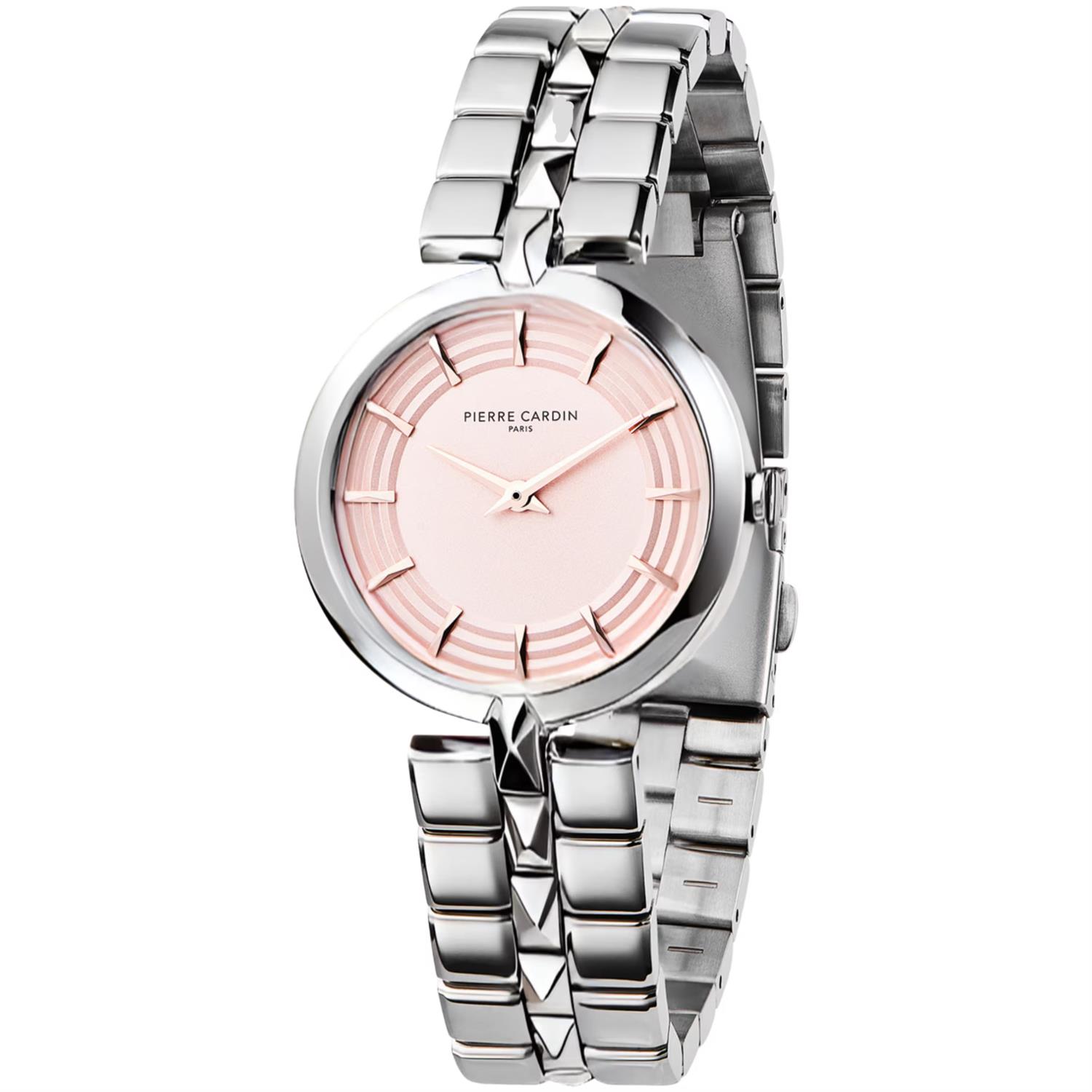 ساعت مچی زنانه پیرکاردین Pierre Cardin با طراحی روزانه بند استیل و قاب گرد استیل با صفحه گرد صورتی و موتور ژاپنی با انرژِی باتری و مقاوم در برابر آب تا عمق 30 متر به همراه گارانتی بین المللی