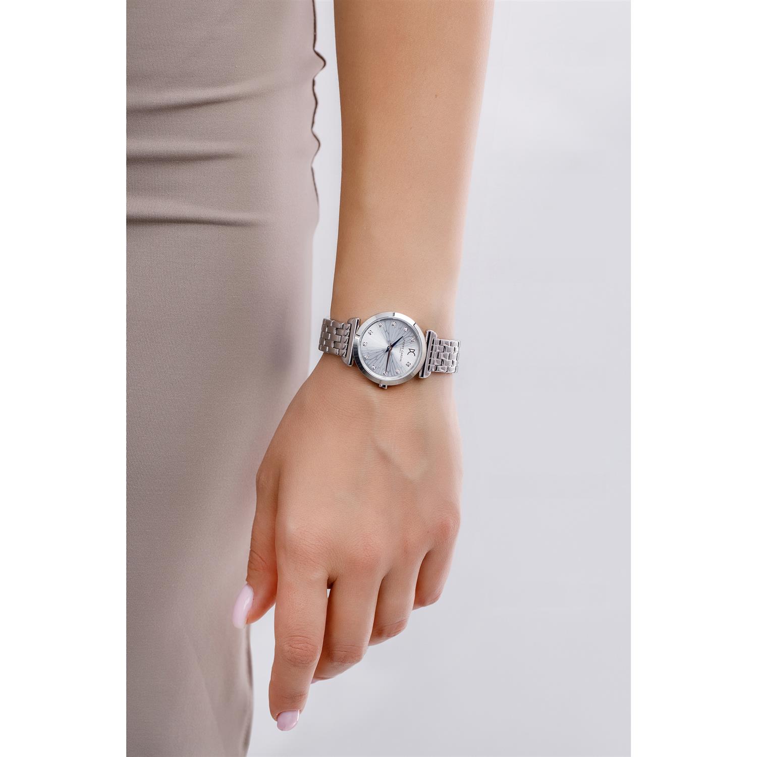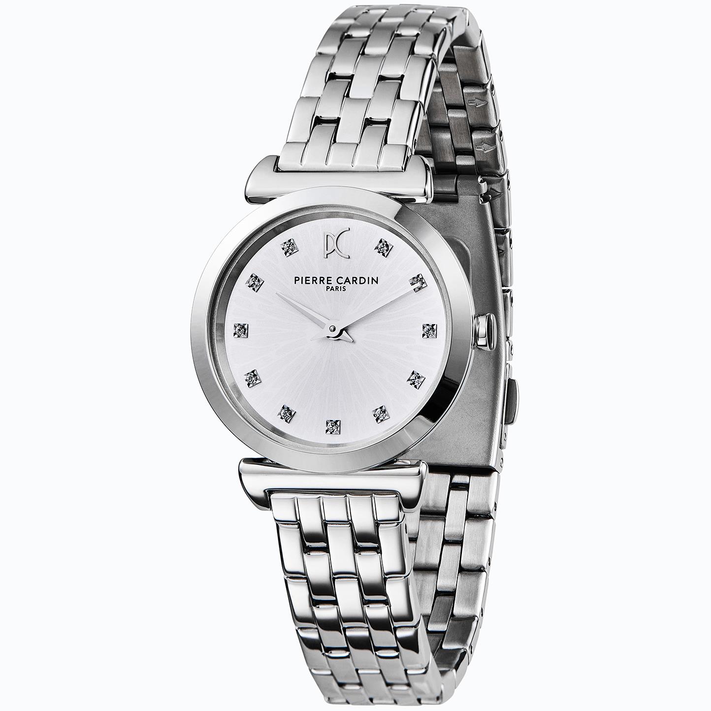 ساعت مچی زنانه پیرکاردین Pierre Cardin با طراحی روزانه بند استیل و قاب استیل با صفحه نگین دار نقره ای و موتور ژاپنی با انرژِی باتری و مقاوم در برابر آب تا عمق 30 متر به همراه گارانتی بین المللی