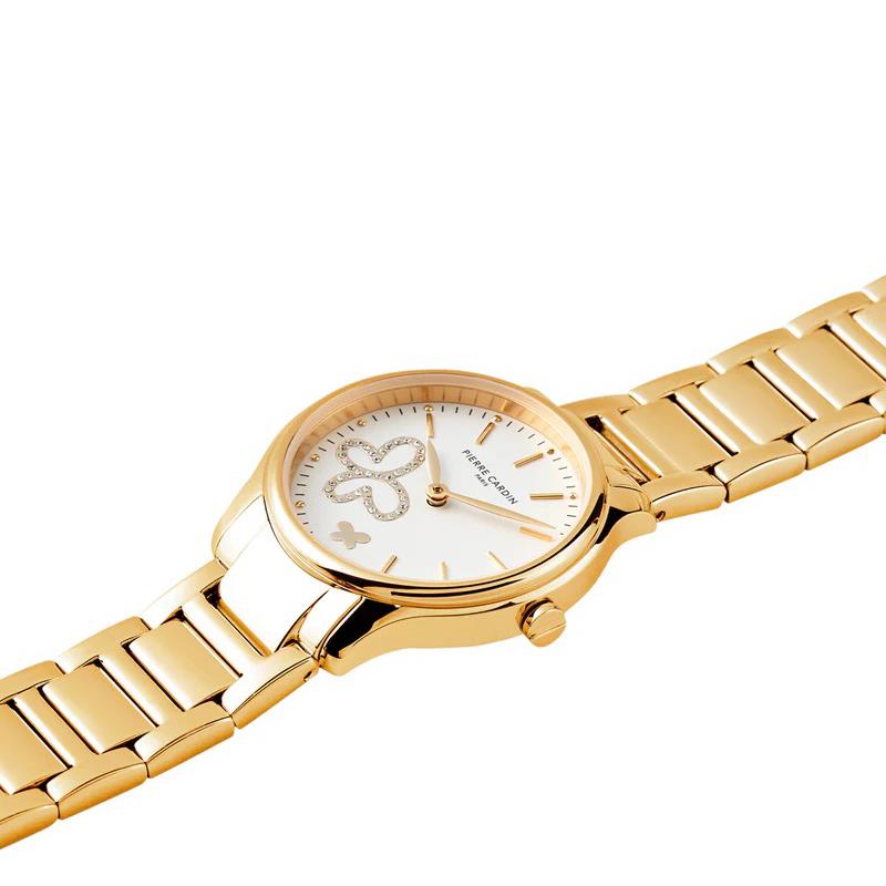 ساعت مچی زنانه پیرکاردین Pierre Cardin با طراحی روزانه بند فلزی طلایی و قاب گرد طلایی با صفحه گرد سفید مزین به نگین و موتور ژاپنی با انرژِی باتری و مقاوم در برابر آب تا عمق 30 متر به همراه گارانتی بین المللی
