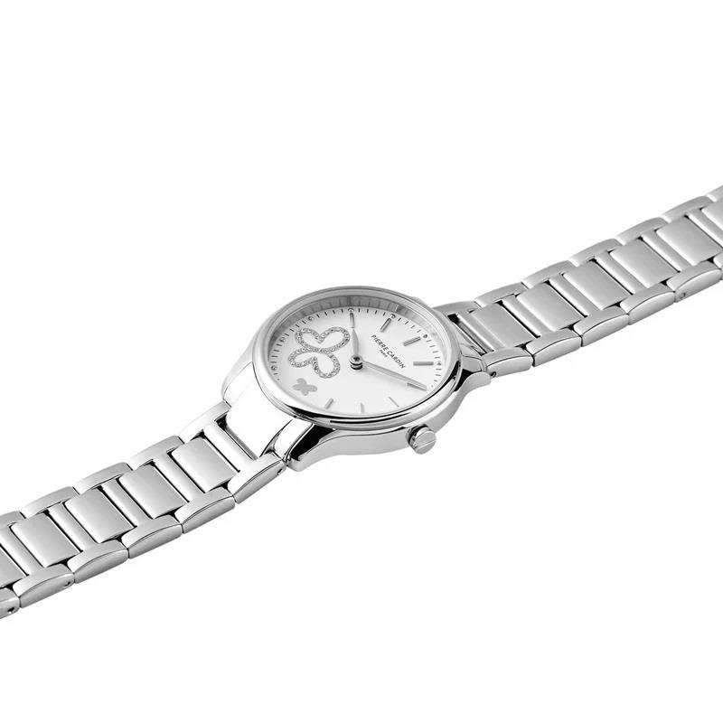 ساعت مچی زنانه پیرکاردین pierrecardin با طراحی ساده بند استیل قاب گرد استیل صفحه سفید با موتور ژاپنی و انرژی باتری ومقاوم در برابر آب تا عمق 30 متر به همراه گارانتی بین المللی