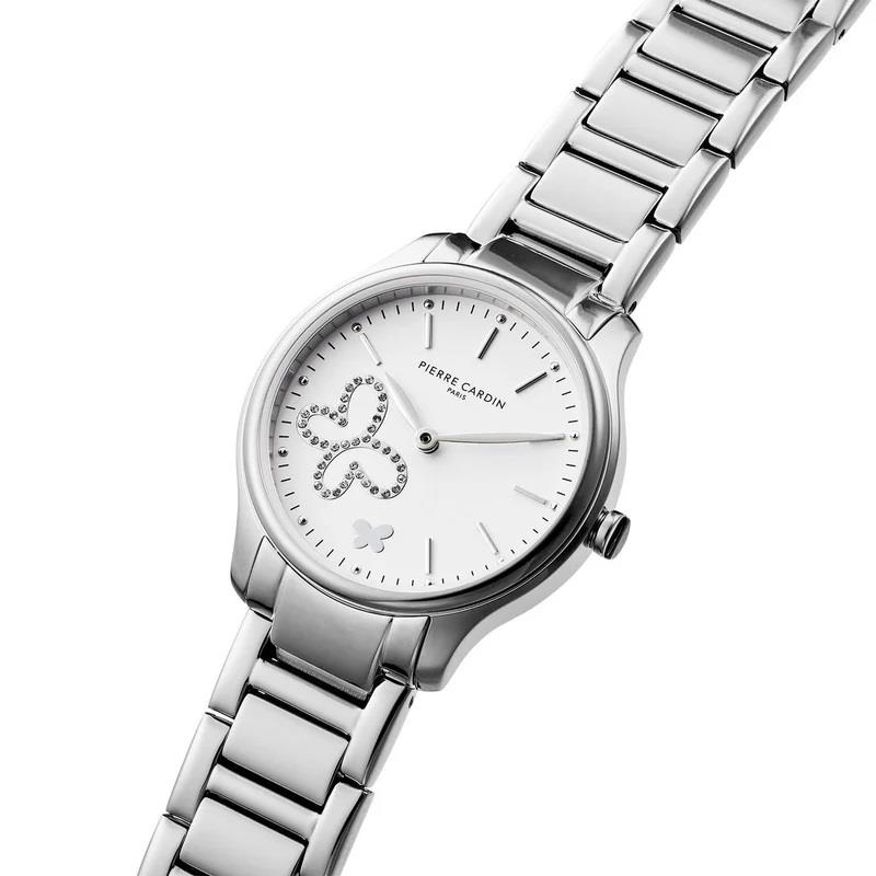 ساعت مچی زنانه پیرکاردین Pierre Cardin با طراحی روزانه بند استیل و قاب گرد استیل با صفحه گرد سفید صدفی مزین به نگین و موتور ژاپنی با انرژِی باتری و مقاوم در برابر آب تا عمق 30 متر به همراه گارانتی بین المللی