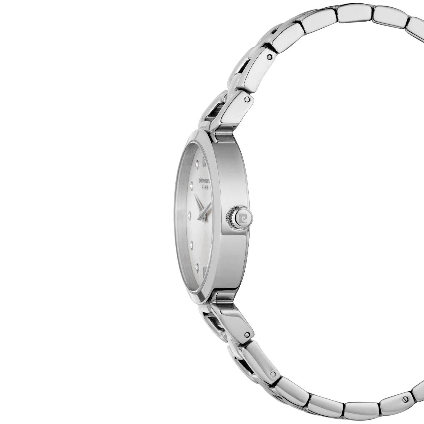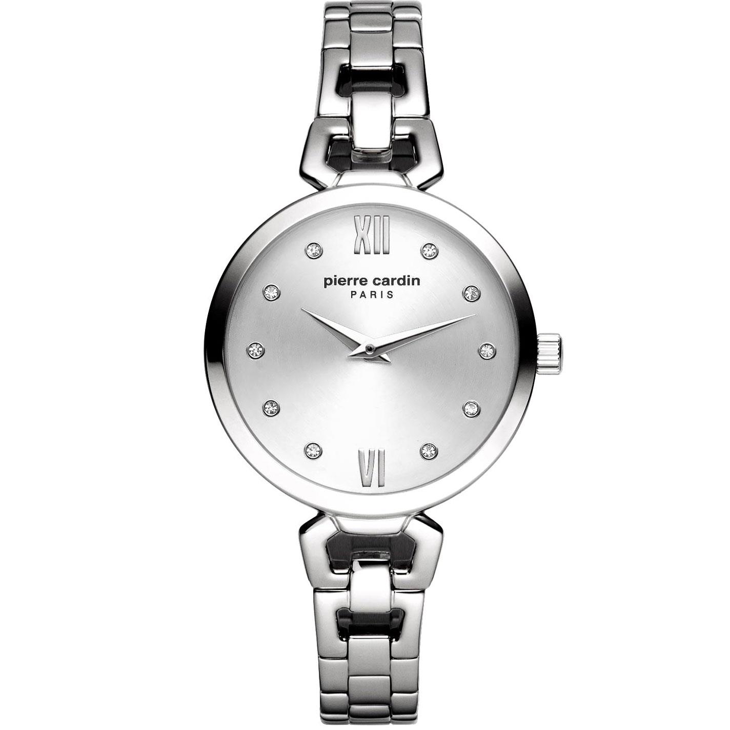 ساعت مچی زنانه پیرکاردین Pierre Cardin با طراحی روزانه بند استیل و قاب گرد استیل با صفحه نگین دار نقره ای و موتور ژاپنی با انرژِی باتری و مقاوم در برابر آب تا عمق 30 متر به همراه گارانتی بین المللی